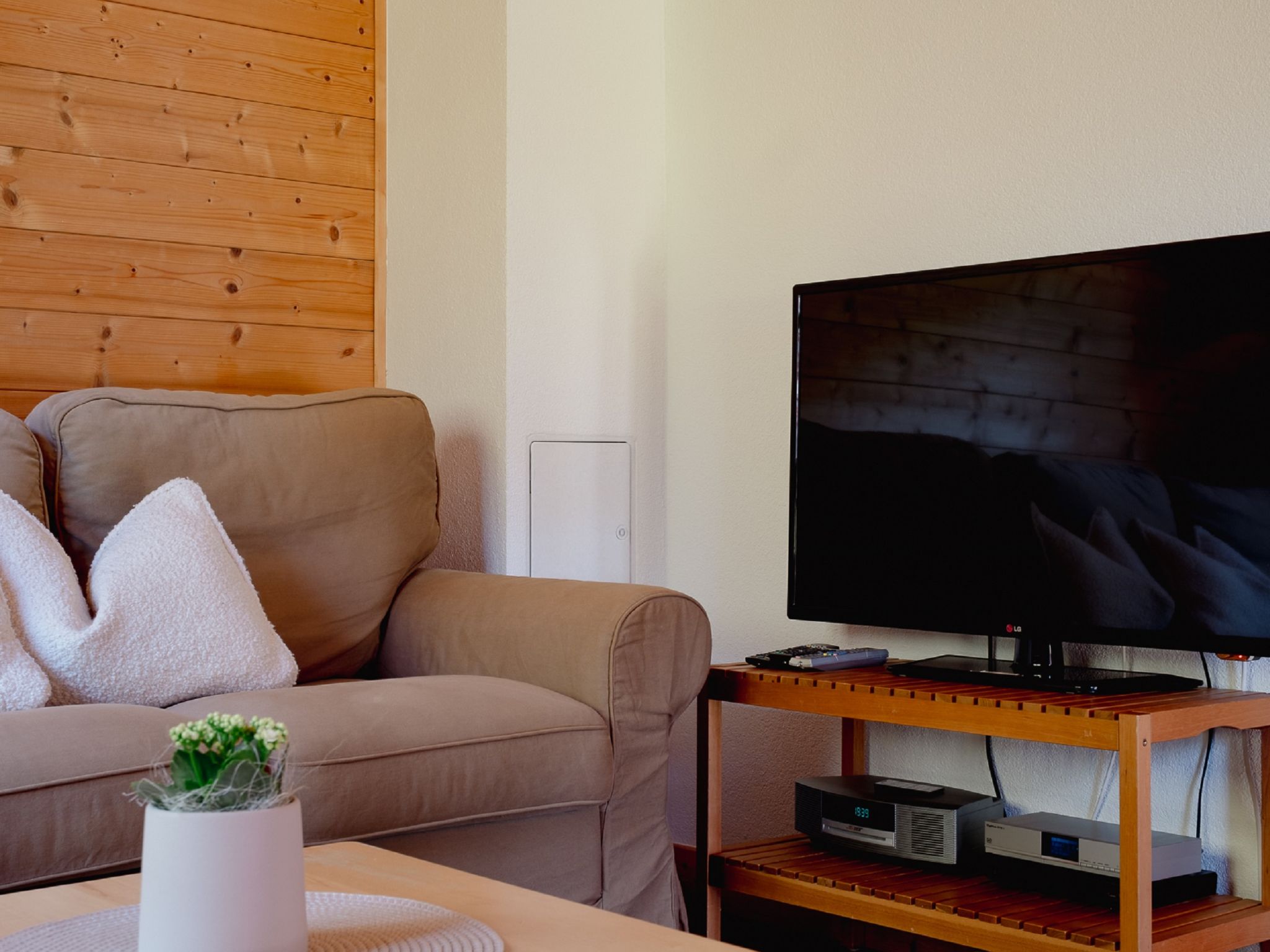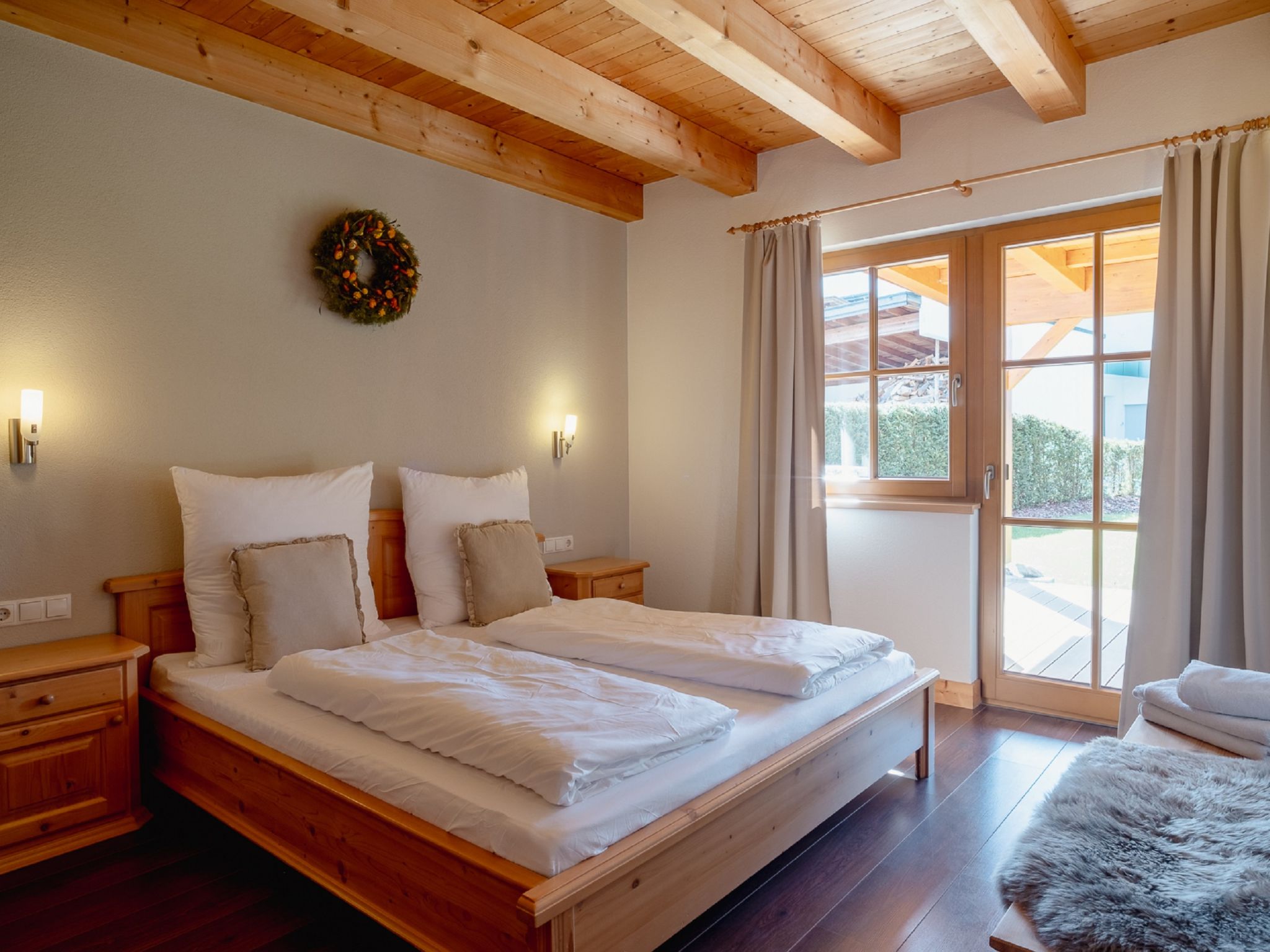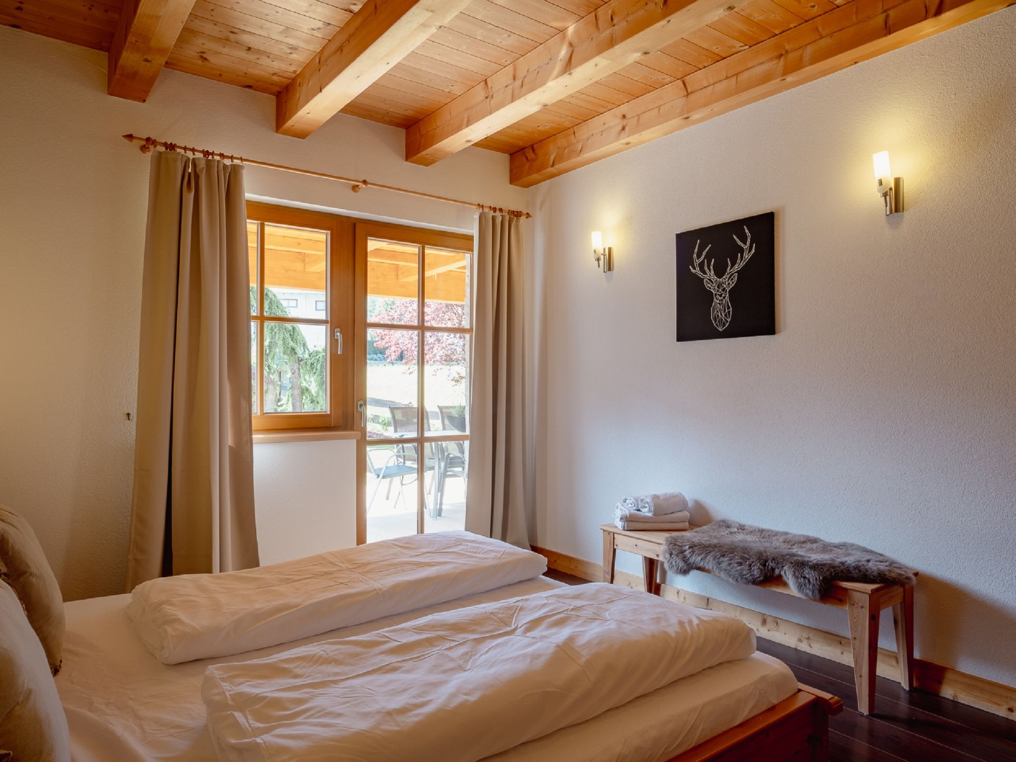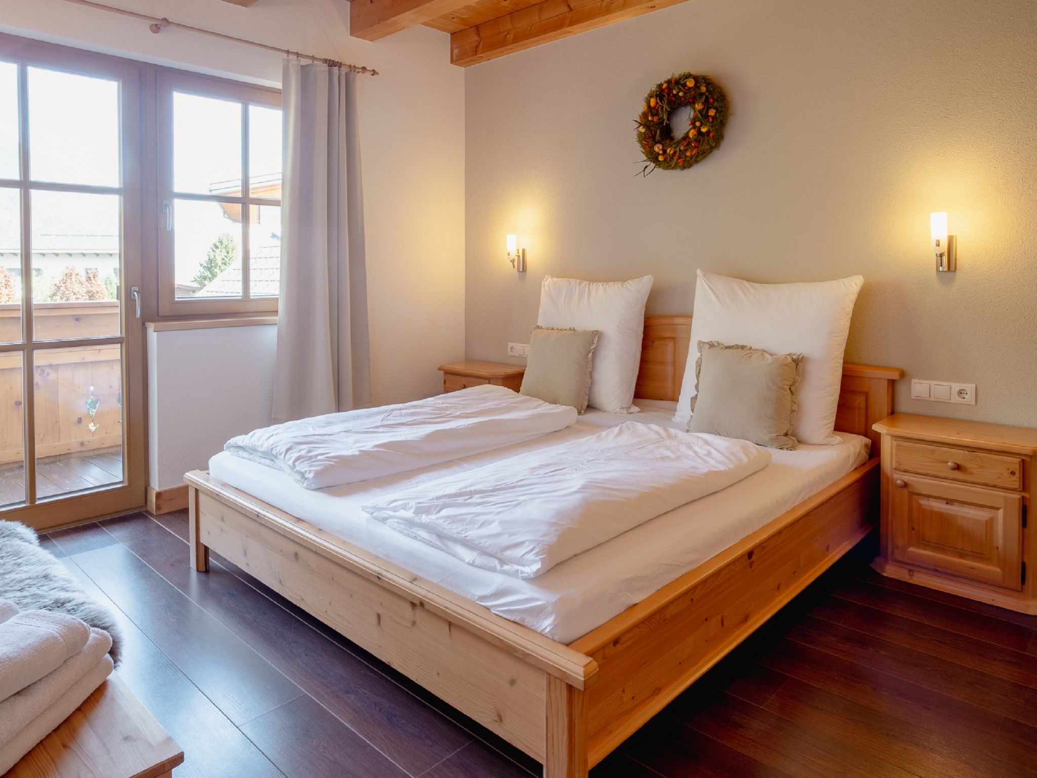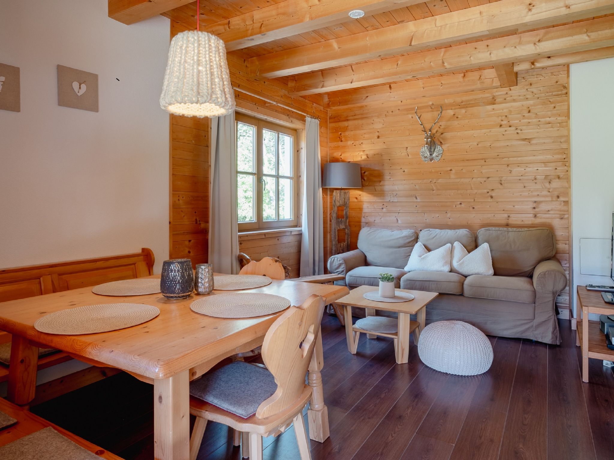 4-Zimmer-Wohnung 100 m2, im Erdgeschoss. Geschmackvoll und mit viel Holz eingerichtet: Eingang. 3 Doppelzimmer. Wohn-/Esszimmer mit Sat-TV. Ausgang zum Garten, zur Terrasse. Offene Küche (Geschirrspüler, 4 Induktionskochplatten, Mikrowelle). Dusche/WC, Bad/Dusche/WC. Fussbodenheizung. Komfortable Einrichtung im Landhausstil. Sicht auf die Berge und die Landschaft. Zur Verfügung: Safe, Haartrockner. Internet (Wireless LAN). Bitte beachten: Nichtraucher-Haus. Allergikergeeignet. Achtung: Es sind nicht mehr als 6 Personen in der Ferienwohnung erlaubt!