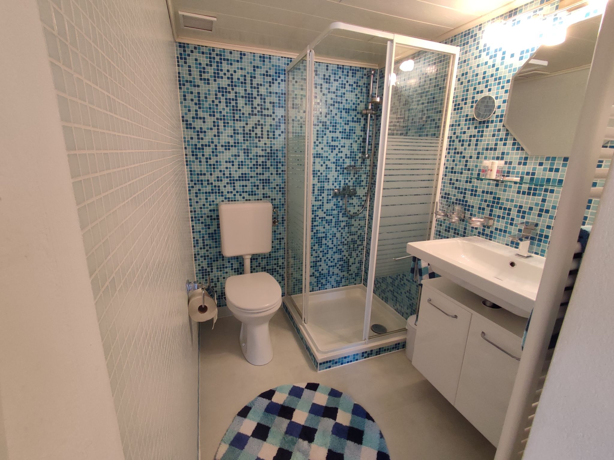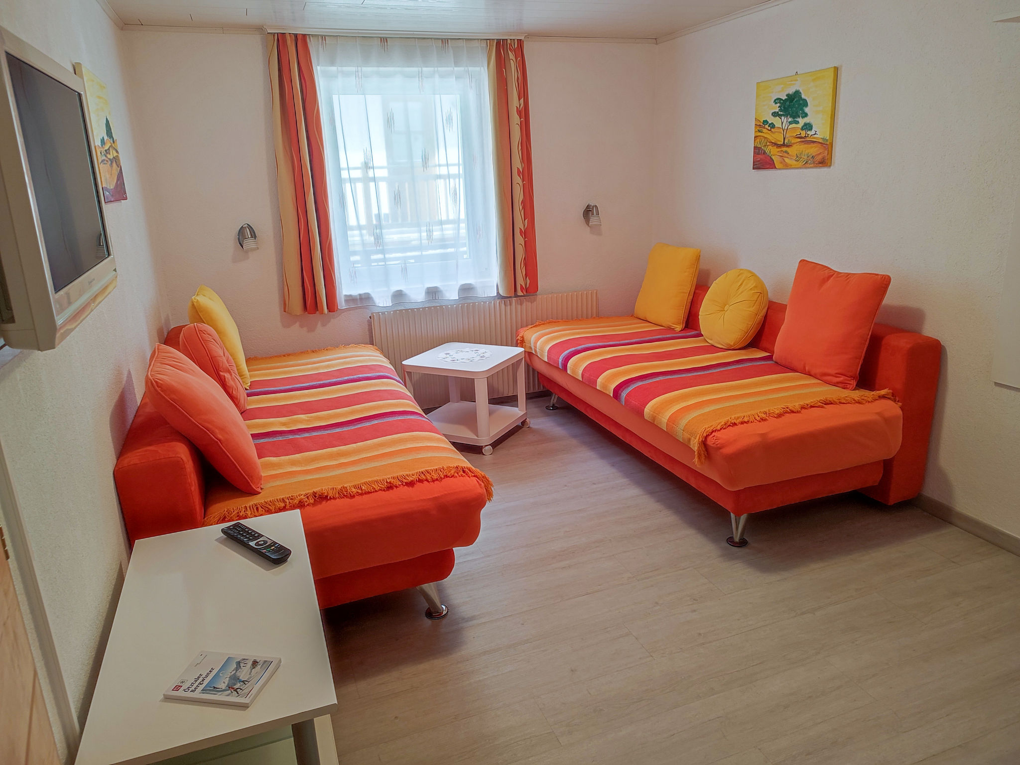 2-Zimmer-Wohnung, Hochparterre, ca. 35 m². Wohn-/Schlafraum mit 2x Bettcouch, Essplatz, durch offenen Rundbogen abgeteilte Küche (4 Ceranfelder, Backofen, Geschirrspüler, Kühlschrank, Kaffeemaschine). Doppelzimmer. Dusche/WC. Bei Belegung mit weniger Personen als der maximalen Personenzahl stehen nicht alle Wohneinheiten zur Verfügung.