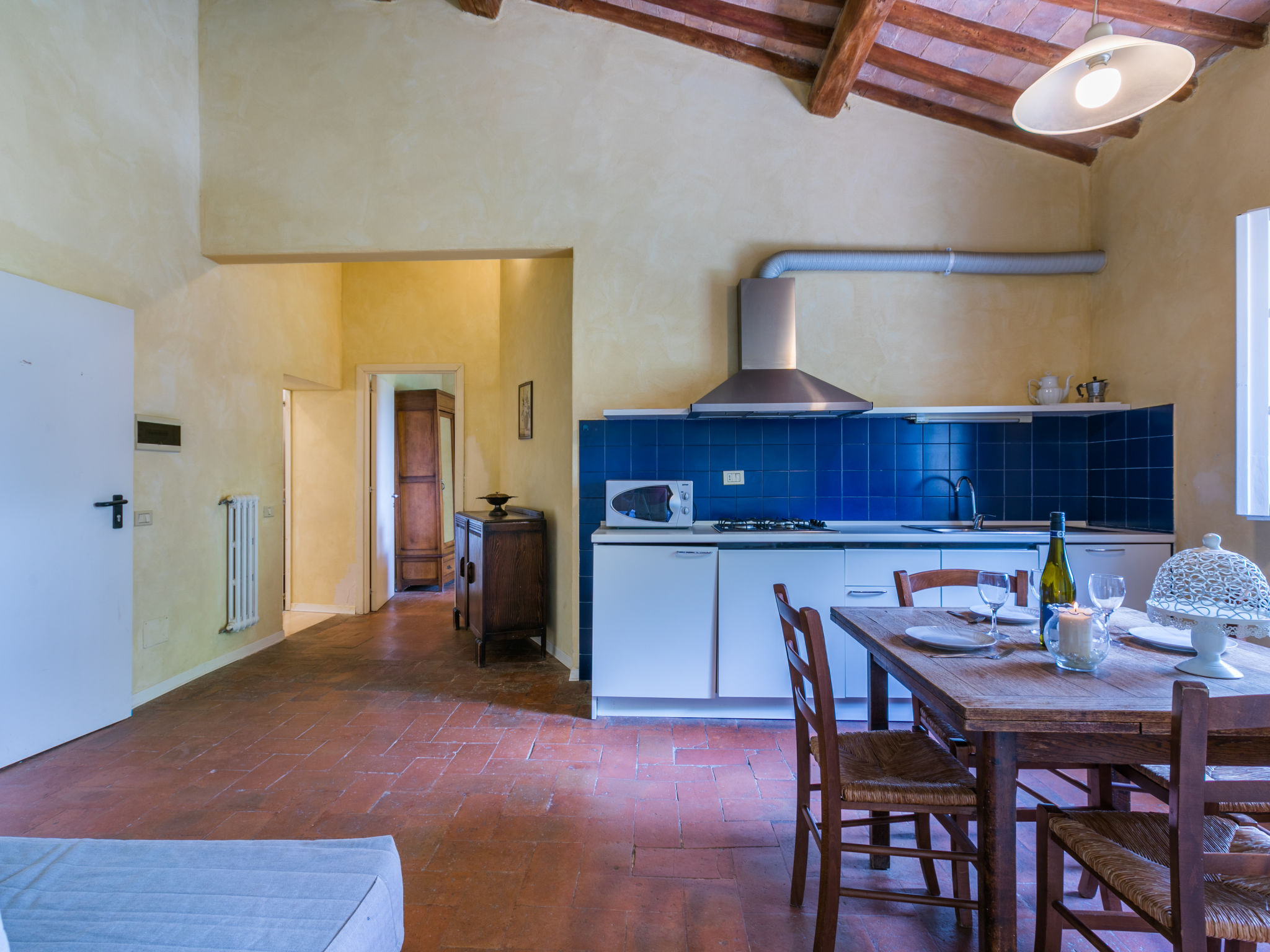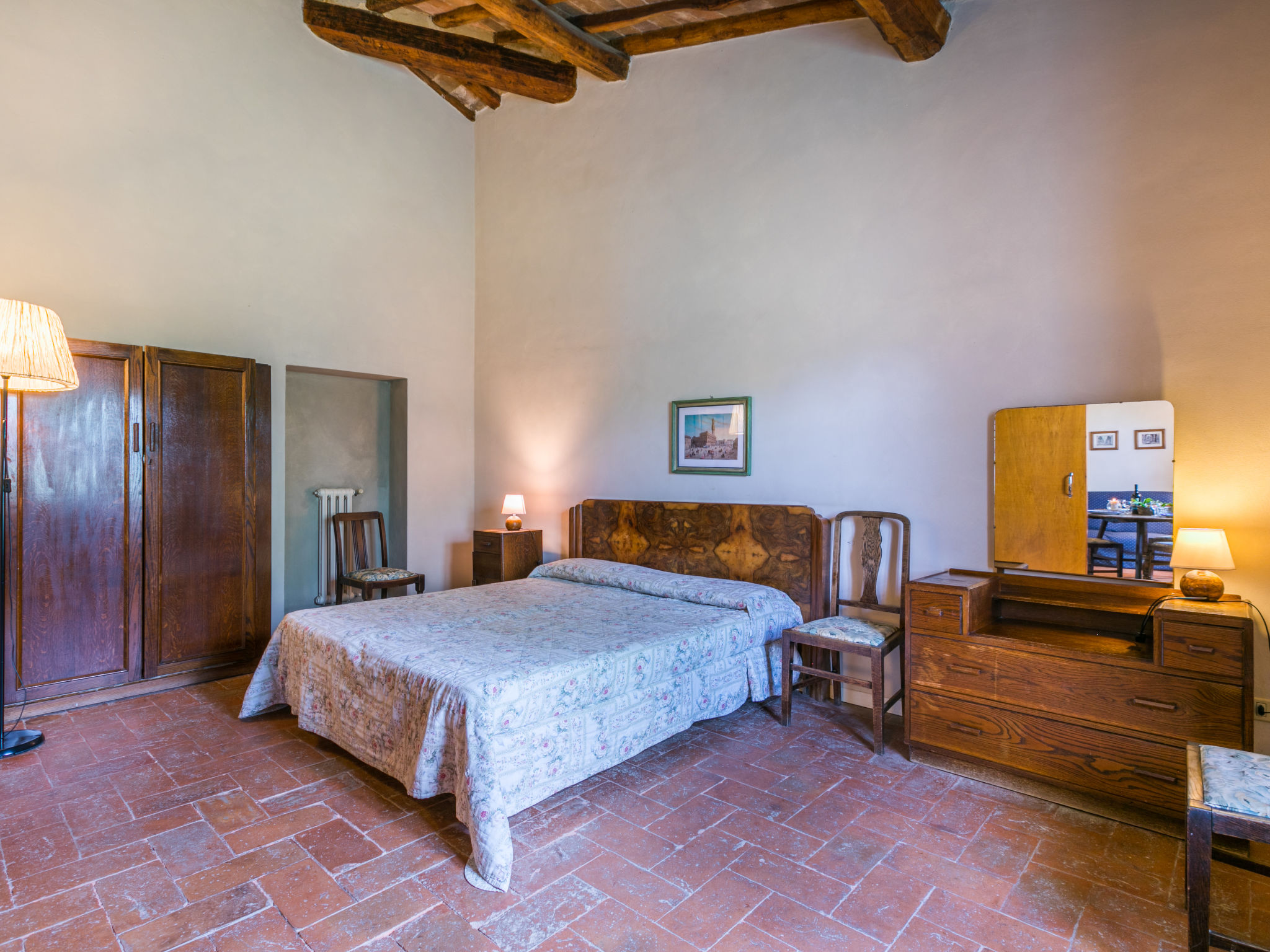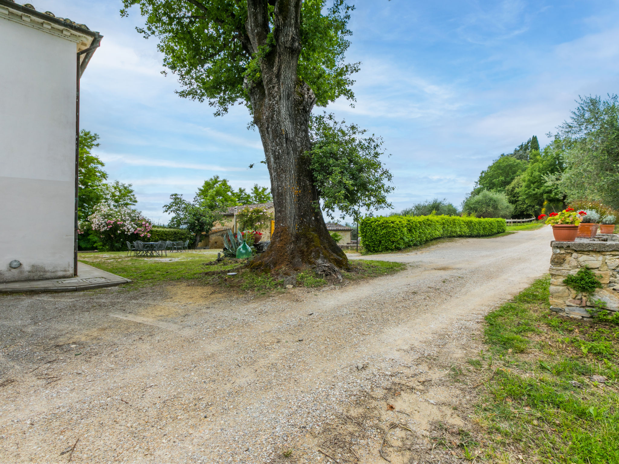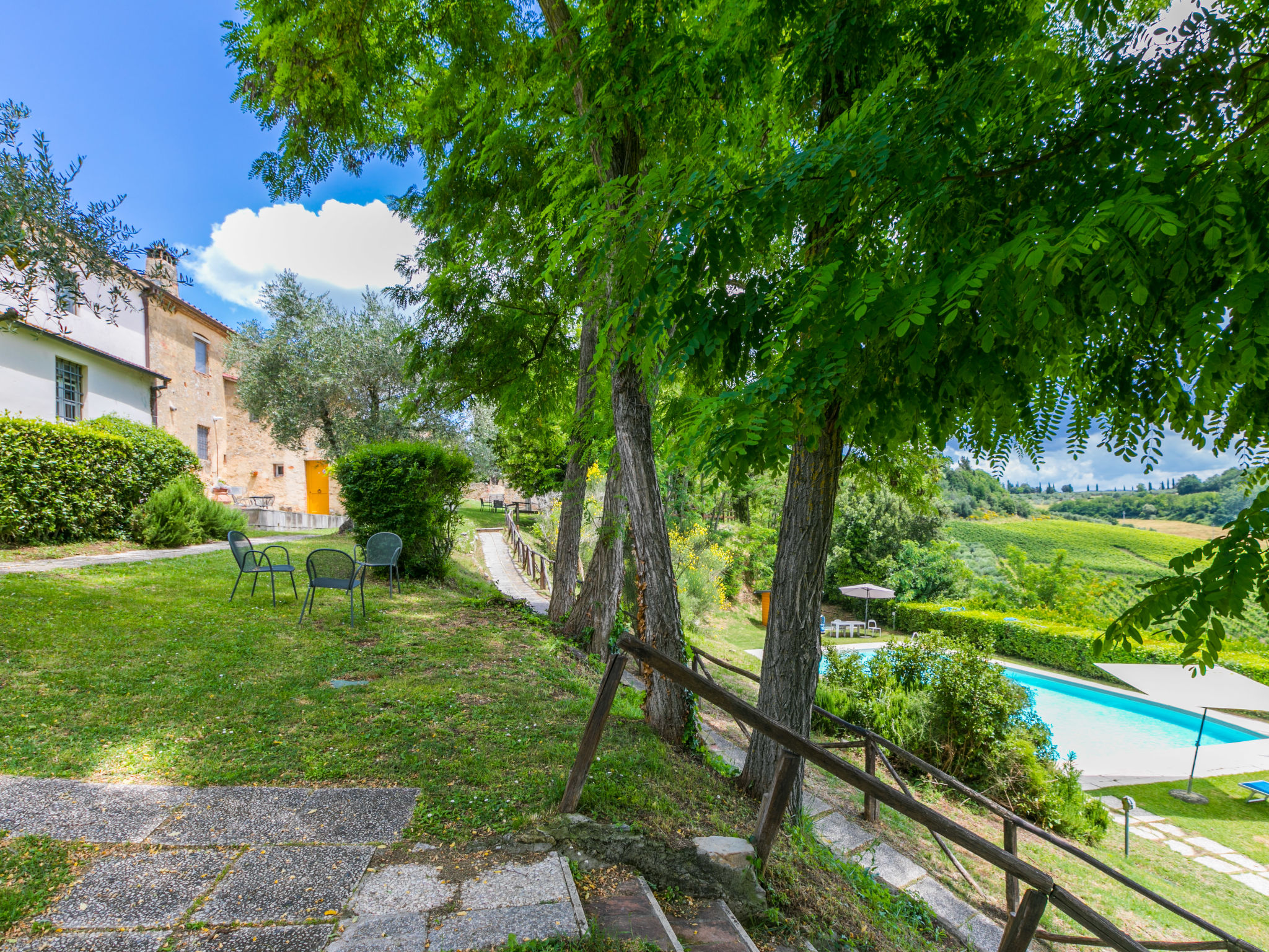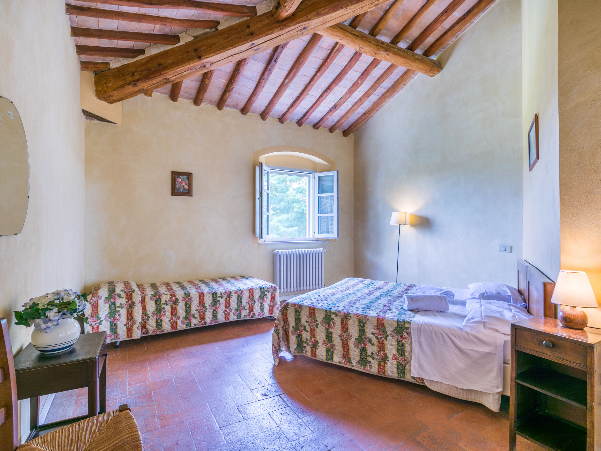 Landgut inmitten der Weinberge und Olivenhaine des Chianti. Jede der rund 12 Wohnungen im Herrenhaus und in einem ehemaligen Nebengebäude verfügt über einen Aussenbereich oder einen Tisch auf der Terrasse, die um das Haupthaus führt. Dank der zentralen Lage ist es ein guter Ausgangspunkt, um die landschaftlichen und kulturellen Schönheiten der Region zu entdecken. Bauerngut "La Moraia", renoviert. 14 km vom Zentrum von Castellina in Chianti, 18 km vom Zentrum von San Gimignano, 50 km vom Zentrum von Firenze, erhöhte Lage, im Grünen. Zur Mitbenutzung: Garten, Schwimmbad (7 x 14 m, 120 - 160 cm tief, saisonale Verfügbarkeit: 23.Mai.-30.Sep. Öffnungszeiten Schwimmbad: 09:00-19:00). Sitzplatz, Grill. Im Hause: Zentralheizung, Waschmaschine (zur Mitbenutzung, extra), Heizung nur verfügbar von 01.11. bis 15.04.. Zufahrt bis zum Haus (1 km Naturweg). Parkplatz. Supermarkt 5 km, Restaurant 5 km, Bahnstation "Poggibonsi" 5 km, Thermalbad "Rapolano Terme" 55 km. Tennis 5 km. Nahe gelegene Sehenswürdigkeiten: Monteriggioni 14 km, Barberino Val d'Elsa 16 km, San Donato 21 km, Radda in Chianti e Badia a Passignano 25 km, Siena 30 km, Volterra 38 km. Bitte beachten: Das Foto ist nur ein Hausbeispiel. In diesem Haus sind weitere Ferienwohnungen mietbar.
