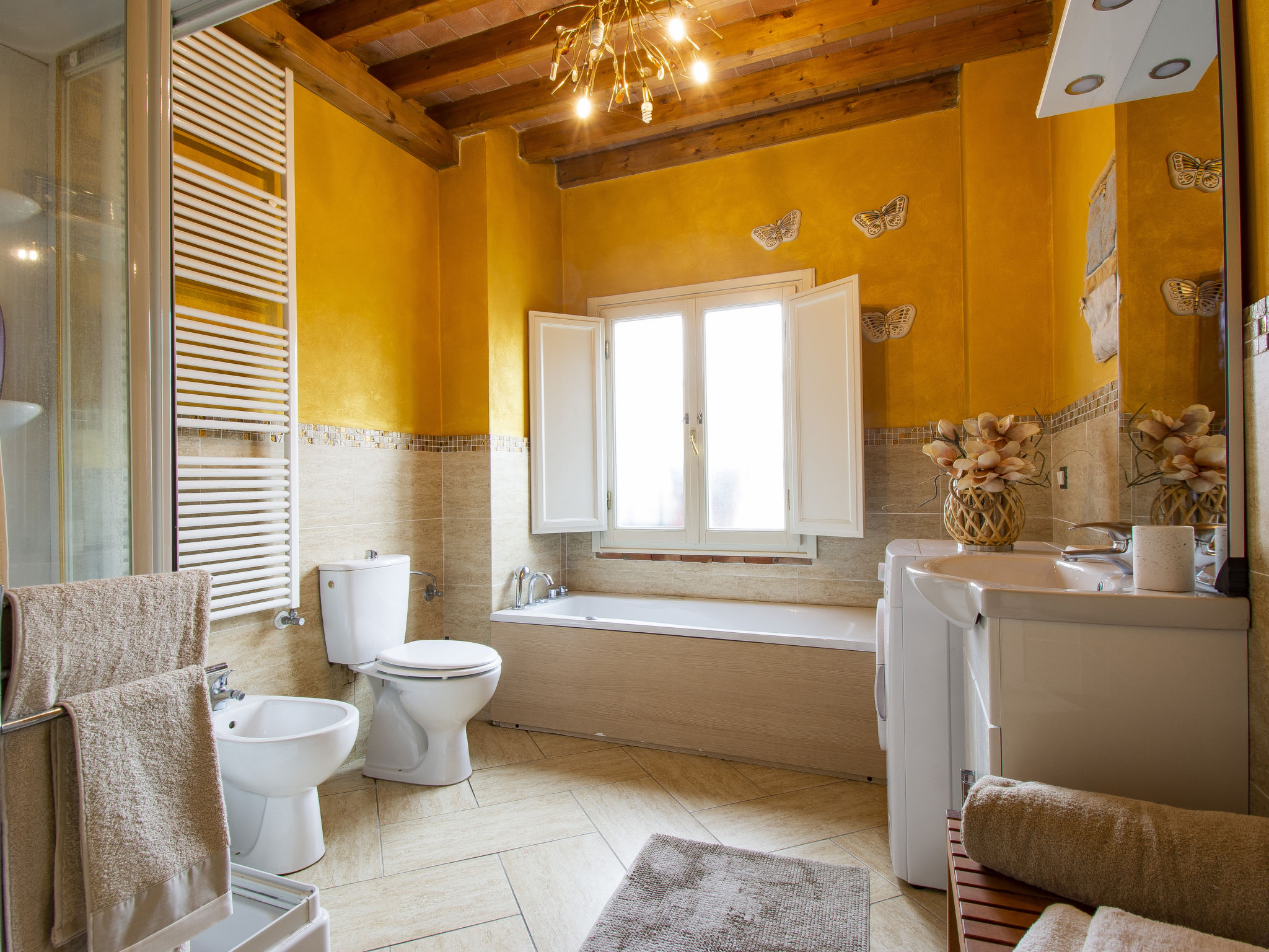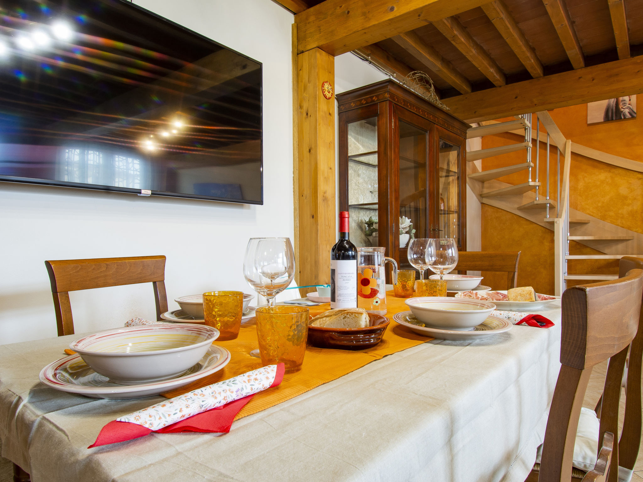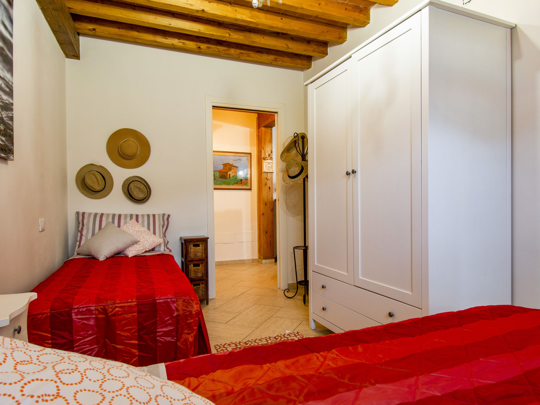 6-Zimmer-Reihenhaus 100 m2 auf 2 Stockwerken. Modern und geschmackvoll eingerichtet: Wohnzimmer mit Esstisch und Digital-TV. Ausgang zum Garten. 1 Zimmer mit 2 Betten. Offene Küche (4 Kochplatten, Backofen, Geschirrspüler, Toaster, Wasserkocher, elektrische Kaffeemaschine). Bad/Dusche/Bidet/WC. Obergeschoss: 2 Doppelzimmer, jedes Zimmer mit Digital-TV und Klimaanlage. Dusche/Bidet/WC. E-Heizung, Klimaanlage. Terrasse überdacht. Terrassenmöbel, Gartengrill, Liegestühle. Sicht auf das Städtchen. Zur Verfügung: Waschmaschine, Kinderhochstuhl, Babybett. Internet (Wireless LAN, gratis). Bitte beachten: Nichtraucher-Unterkunft. Eigener Eingang.