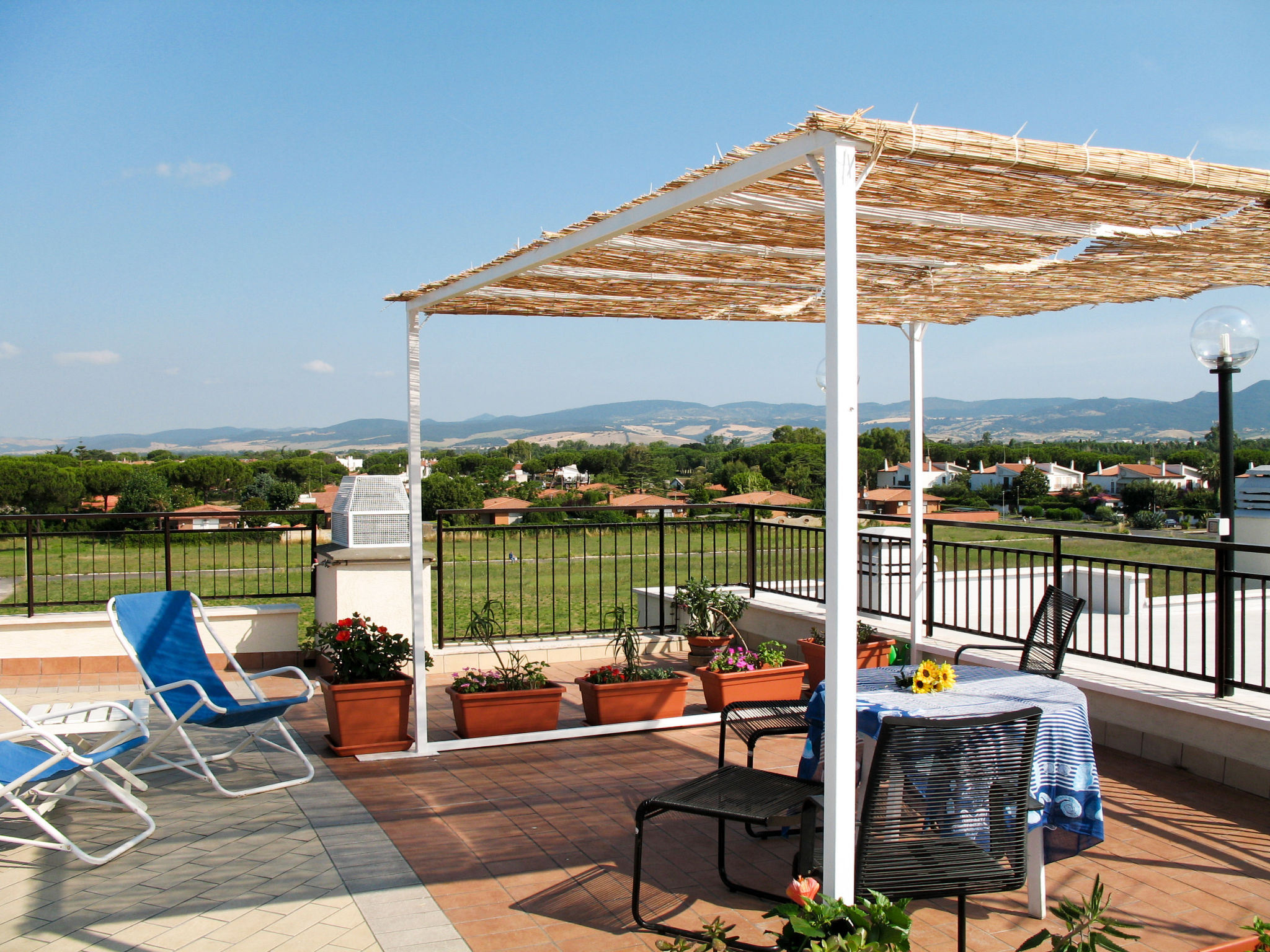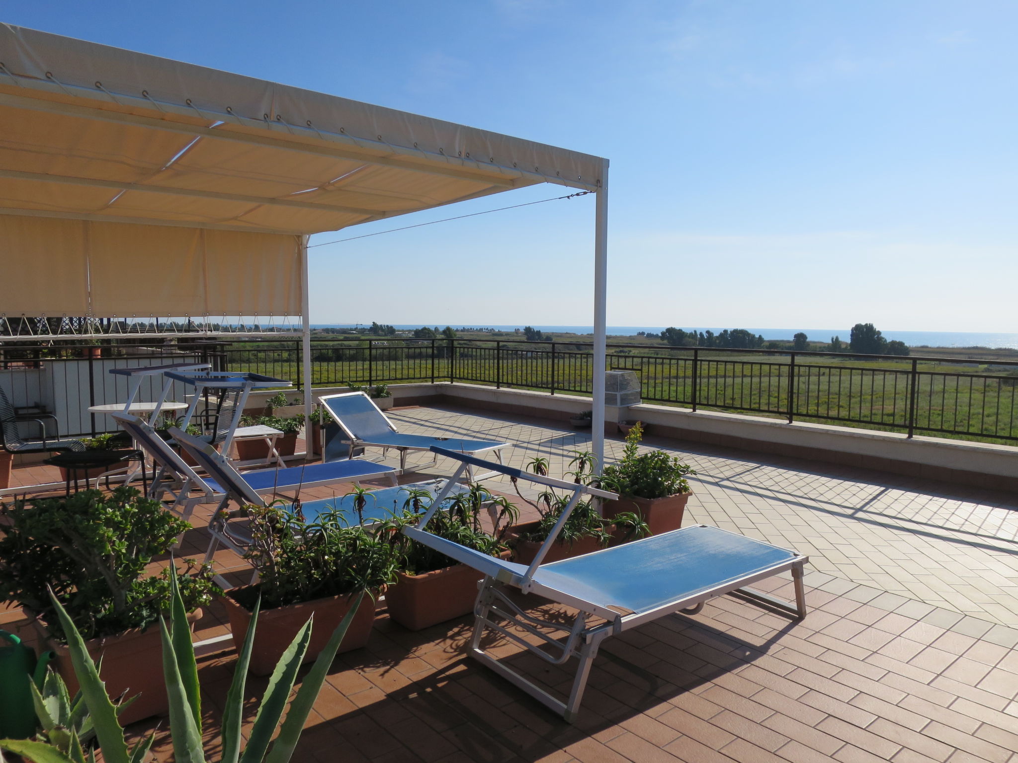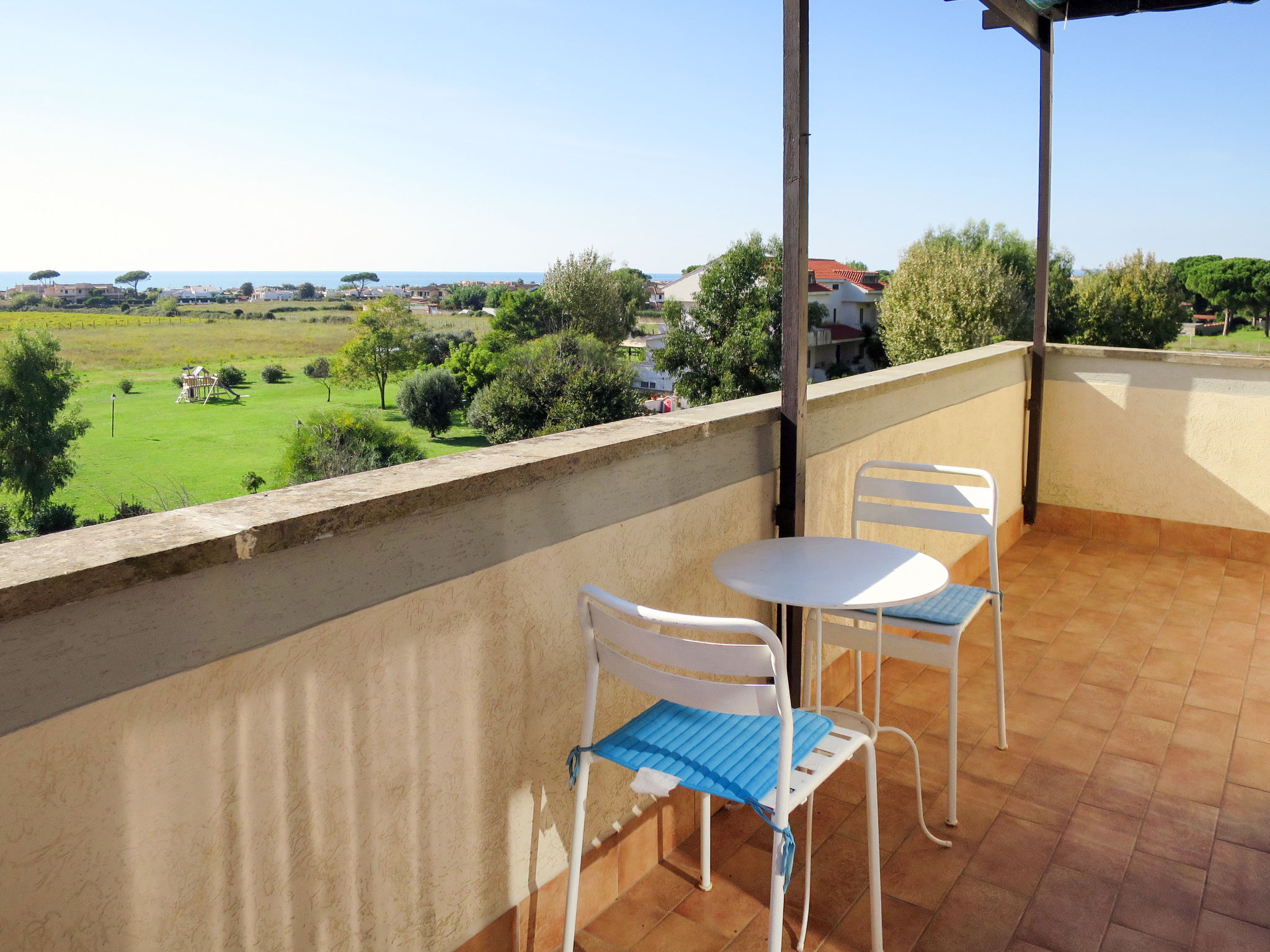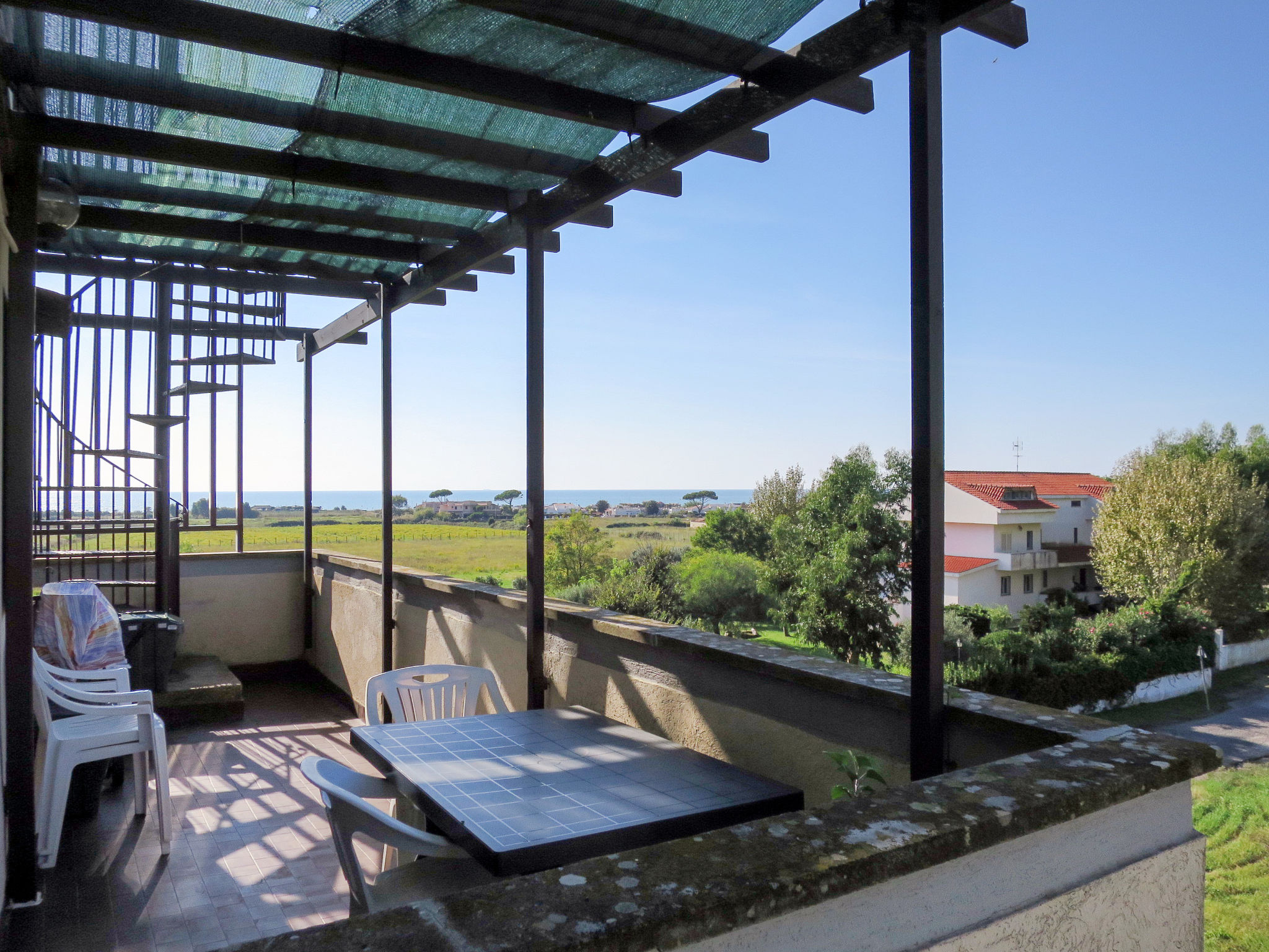 Die Ferienwohnung ALGA MARINA liegt in der obersten Etage eines dreistöckigen Mehrfamilienhauses in Campo di Mare, einem Ortsteil von Marina di Cerveteri. Unverbauter Blick aufs Meer und die Tolfaberge. Zur Ortsmitte von Marina di Cerveteri 1 km. Nächstes Lebensmittelgeschäft ca. 500 m. Einkaufszentren in Cerenova (1 km). Zum Strand ca. 800 m. Zum Bahnhof in Marina di Cerveteri 1 km (regelmäßige Zugverbindung nach Rom, 40 km). 1 schattiger Privatparkplatz sowie weitere Abstellmöglichkeit auf dem Grundstück. 3 Balkone mit Sonnenschutz, 2 davon möbliert. Von einem der Balkone über Wendeltreppe auf herrliche Panorama-Dachterrasse (ca. 60 m², Meerblick, Außenbeleuchtung) mit Sonnenpavillon, Außendusche und transportabler Grill. Auf Wunsch und gegen Bezahlung Transfer vom Flughafen Fiumicino oder vom Bahnhof in Marina di Cerveteri zur Wohnung. Ansprechende, helle Einrichtung, teils im Retro-Stil. Fliesenboden. Sat-TV (deutsche Programme). Safe. Waschmaschine. Bügeleisen/-brett. Klimaanlage im Wohnraum und im Doppelzimmer. Deckenventilator im Zweibettzimmer. Gas-Etagenheizung.