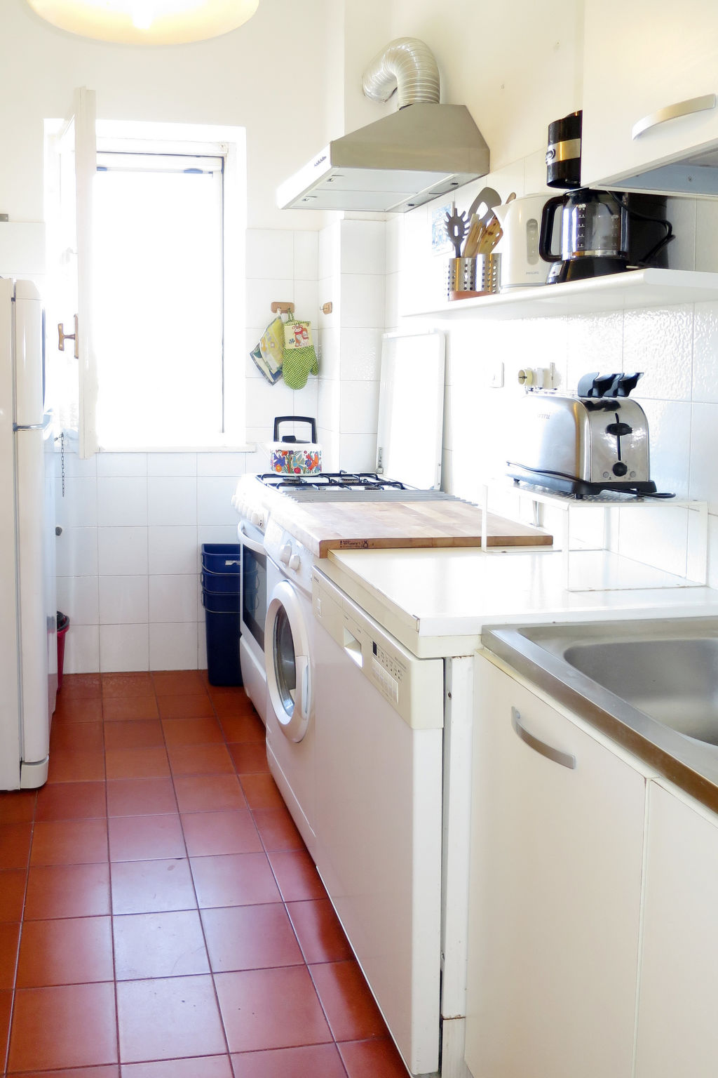 3-Zimmer-Wohnung, 2. Etage, ca. 70 m². Wohn-/Schlafraum mit Bettcouch, Kamin (nur Dekoration) und Essplatz, Ausgang auf Balkon und Wendeltreppe zu Panorama-Dachterrasse. Küche (4 Flammen, Backofen, Geschirrspüler, Kühl-/Gefrierkombination, Kaffeemaschine, Wasserkocher, Toaster). Zweibettzimmer mit Balkonausgang. Doppelzimmer mit Balkonausgang. Bad/WC.