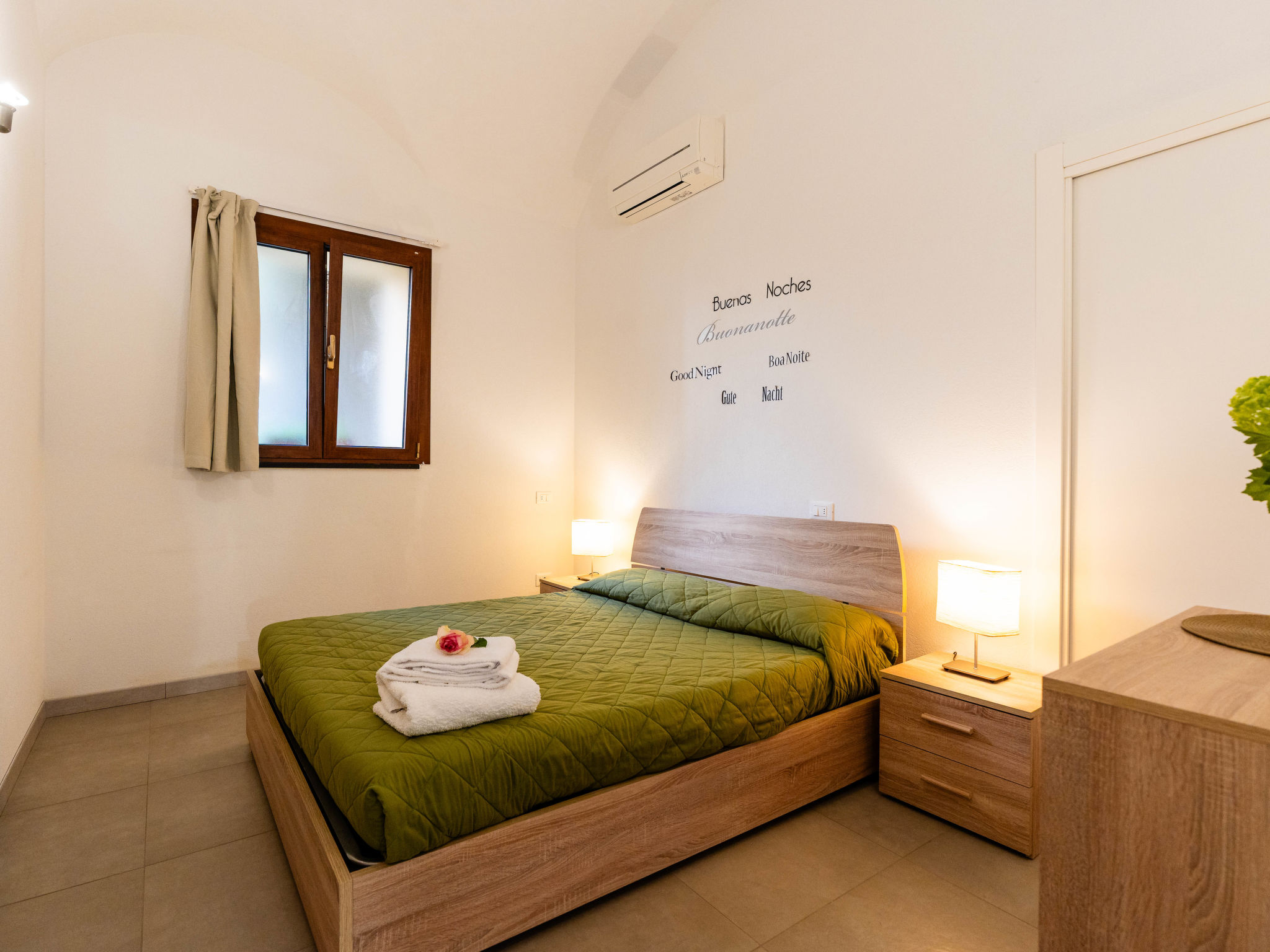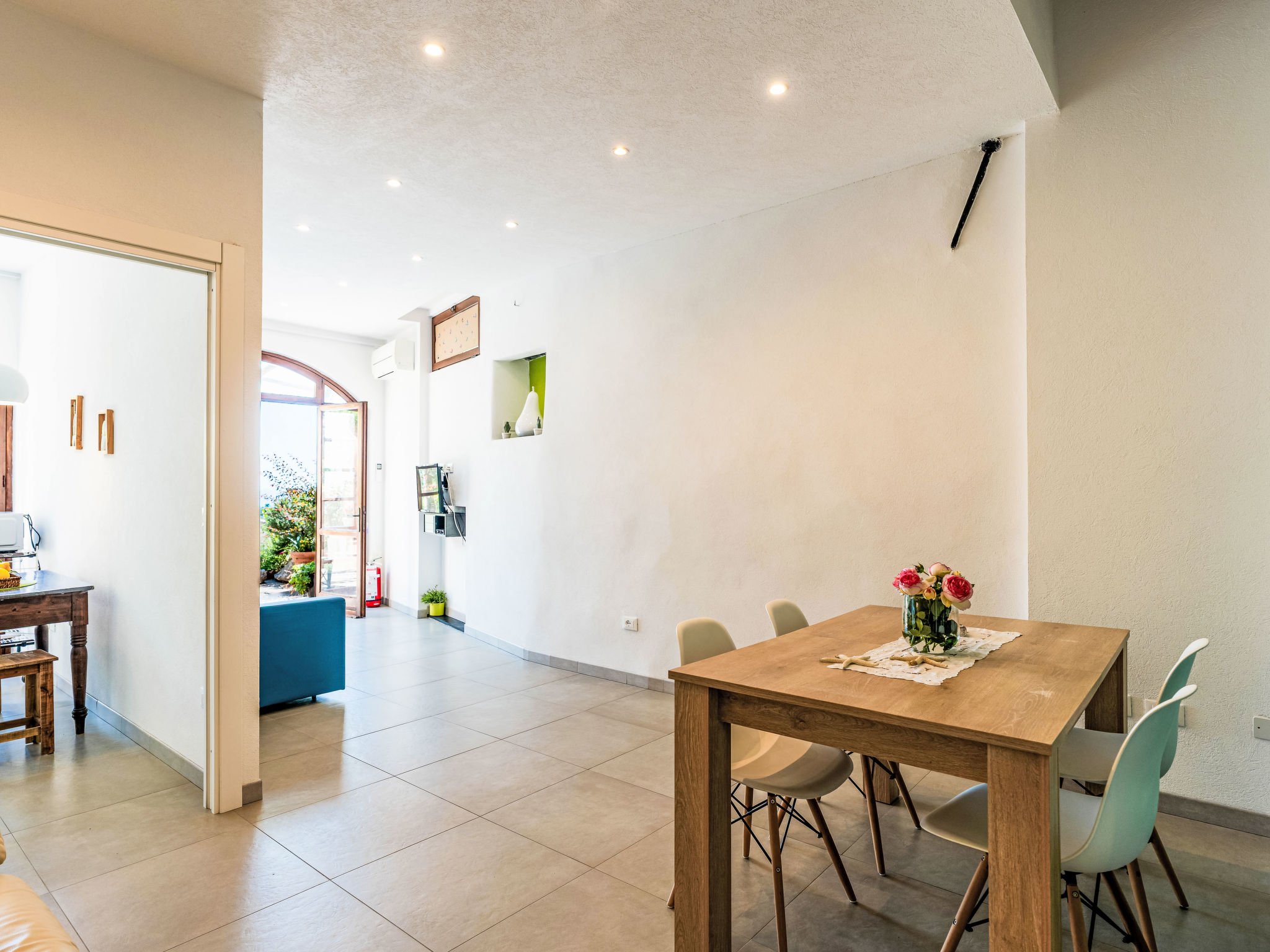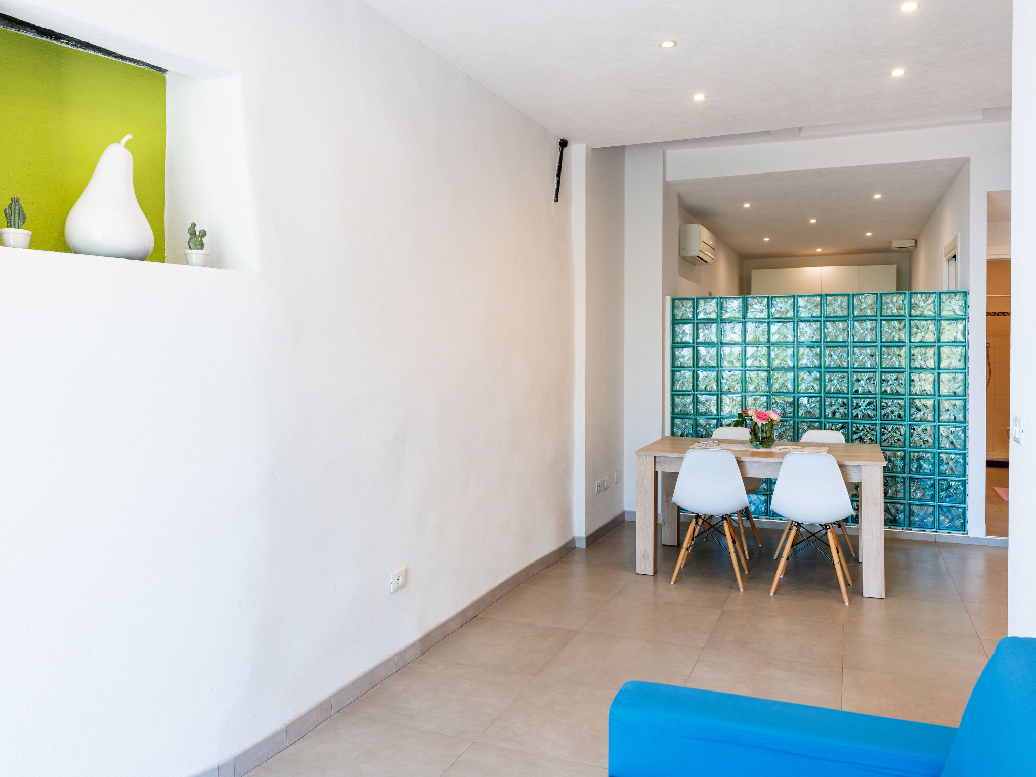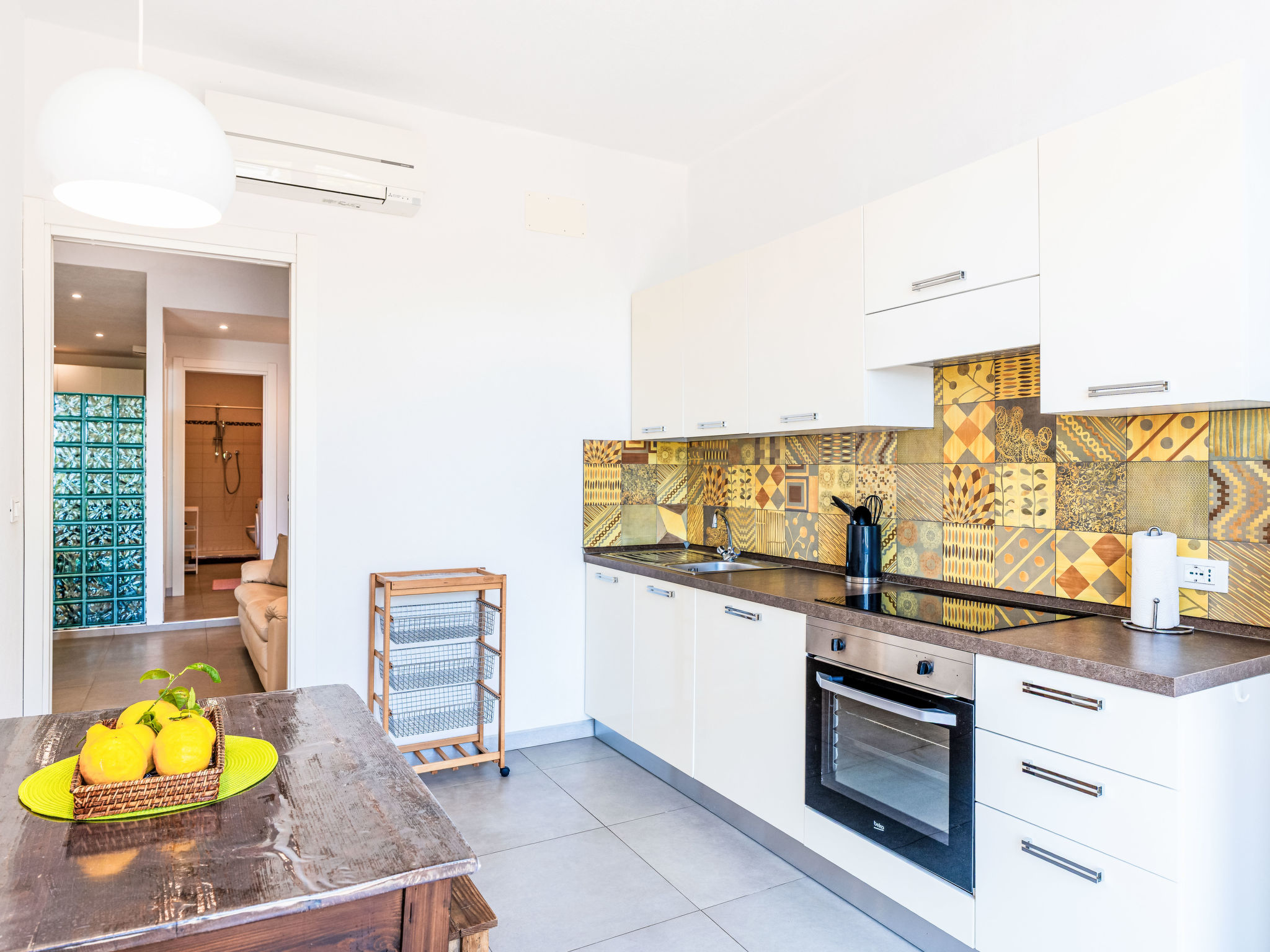 2-Zimmer-Wohnung 'Mare', Erdgeschoss, ca. 60 m². Zugang über Außentreppe (ca. 10 Stufen). Wohn-/Schlafraum mit Doppelbettcouch (1,60 m breit), Sitzcouch und Terrassenausgang, durch halbhohe Glasstein-Wand abgeteiltes Schlafzimmer mit Einzel- und Ausziehbett. Küche (4 Induktionsfelder, Backofen, Mikrowelle, Geschirrspüler, Kühl-/Gefrierkombination, Kaffeemaschine, Wasserkocher, Toaster) mit Essplatz und Terrassenausgang. Dusche/Bidet/WC. CITRA: 009029-LT-1253