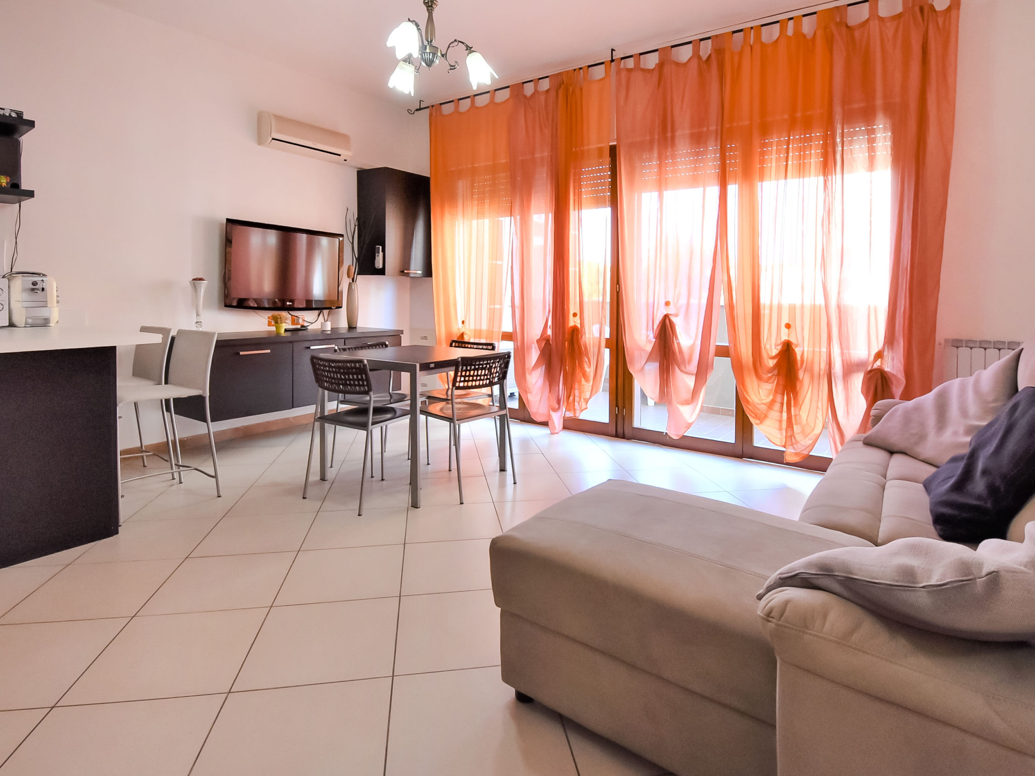 2-Zimmer-Wohnung 45 m2 im 2. Stock. Hell, komfortabel und modern eingerichtet: Eingang. Wohn-/Esszimmer mit 1 Doppeldiwanbett und TV (Flachbildschirm). Ausgang zur Terrasse. 1 Doppelzimmer. Kochnische (4 Kochplatten, Backofen, Mikrowelle, Tiefkühler, elektrische Kaffeemaschine). Dusche/Bidet/WC. Klimaanlage. Terrasse. Terrassenmöbel. Zur Verfügung: Waschmaschine, Haartrockner. Internet (Wireless LAN, gratis). Bitte beachten: Nichtraucher-Unterkunft. 1 Haustier/Hund erlaubt. Kein Fahrstuhl.