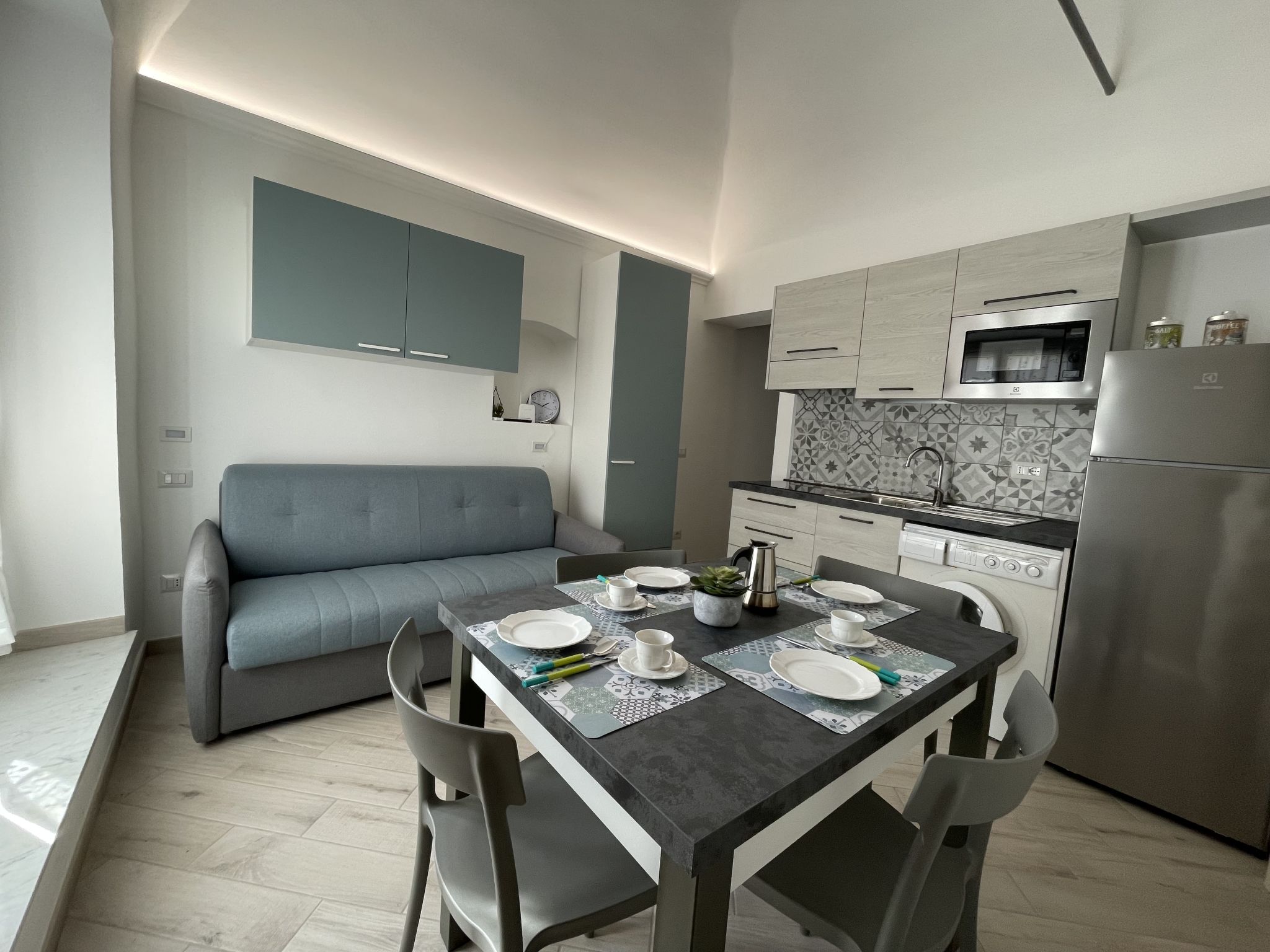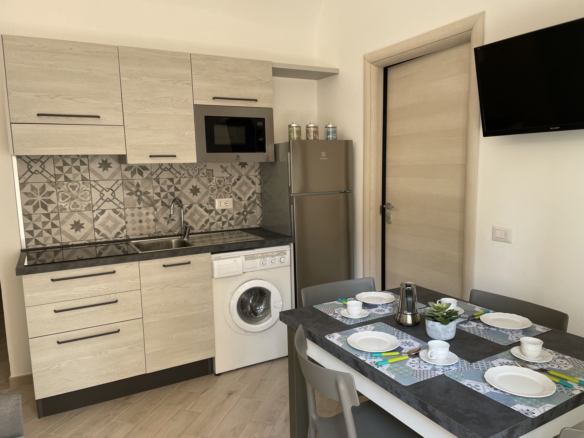 "Tra Sole e Mare", 2-Zimmer-Wohnung 60 m2 im 1. Stock. Hell, vollständig renoviert, modern und geschmackvoll eingerichtet: Wohn-/Esszimmer mit 1 x 2 Etagenbetten (90 cm), 1 Doppelbett (1 x 160 cm), Sat-TV und Flachbildschirm. Wohn-/Schlafzimmer mit 1 x 2 Etagenbetten (90 cm), 1 Doppelbett (1 x 160 cm), Küchenblock. Offene Küche (Backofen, Geschirrspüler, 4 Induktionskochplatten, Mikrowelle, Tiefkühler, elektrische Kaffeemaschine). 2 Duschen/Bidet/WC. Klimaanlage, Warmluftheizung. Zur Verfügung: Waschmaschine. Internet (Wireless LAN). Bei Belegung mit weniger Personen als der maximalen Personenzahl stehen nicht alle Schlafzimmer zur Verfügung. 009057-LT-0390