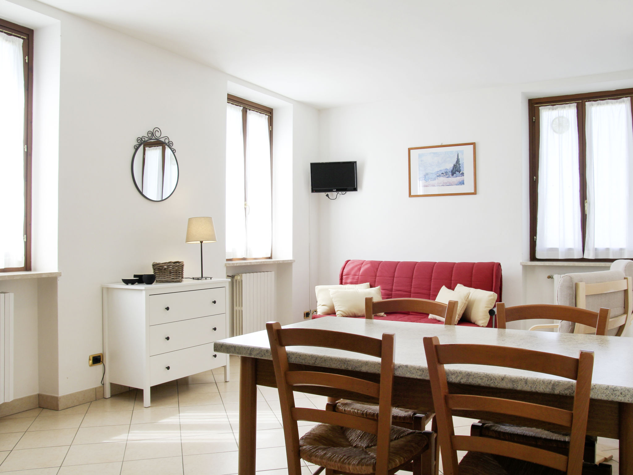 2-Zimmer-Wohnung 40 m2. Komfortabel eingerichtet: Wohn-/Schlafzimmer mit 1 Doppeldiwanbett, Esstisch und Sat-TV. 1 Doppelzimmer. Offene Küche (Backofen, 4 Flammen, Mikrowelle, Tiefkühler, elektrische Kaffeemaschine). Dusche/Bidet/WC. G-Heizung. Seitliche Sicht auf den Garten. Zur Verfügung: Safe, Kinderhochstuhl, Babybett bis 2 Jahre. Internet (Wireless LAN, gratis). Parkplatz (überdacht, 1 Auto). Bitte beachten: Nichtraucher-Unterkunft.