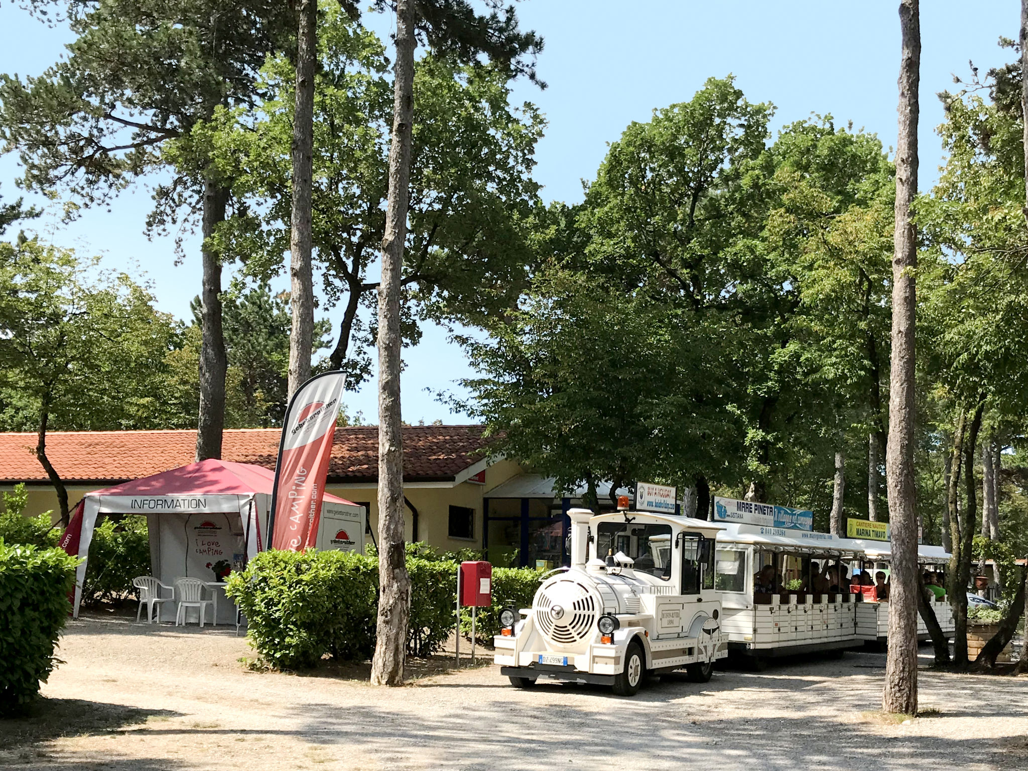 Grosses, kinderfreundliches Feriendorf "Camping Village Mare Pineta". 115 Häuser im Ferienresort. 1 km vom Zentrum von Sistiana, 18 km vom Zentrum von Trieste, erhöhte Lage am Hang, 1.6 km vom Meer, 1.6 km vom Strand. Zur Mitbenutzung: Grundstück 10 ha (eingezäunt) mit Bäumen, Schwimmbad (30 x 20 m, saisonale Verfügbarkeit: 04.Jun.-30.Sep.). Kinderbecken, Aussendusche, Tennis (extra), Tischtennis, Basketball (extra), Beachvolleyball, Kinderspielplatz. In der Anlage: Empfang, Restaurant, Bar, Wireless LAN (extra). Einkaufsmöglichkeit, Waschmaschine (zur Mitbenutzung, extra). Frühstück Vollpension Halbpension möglich (extra). Supermarkt 1 km, Bahnstation "Trieste Centrale" 18 km, Felsstrand "Baia Sistiana" 1.6 km. Nahe gelegene Sehenswürdigkeiten: Castello di Duino 2 km, Castello di Miramare 13 km, Sentiero Rilke 350 m. Bitte beachten: Animation in der Saison. Geeignet für Familien. Badekappenpflicht. Armbandtragepflicht innerhalb der Anlage.