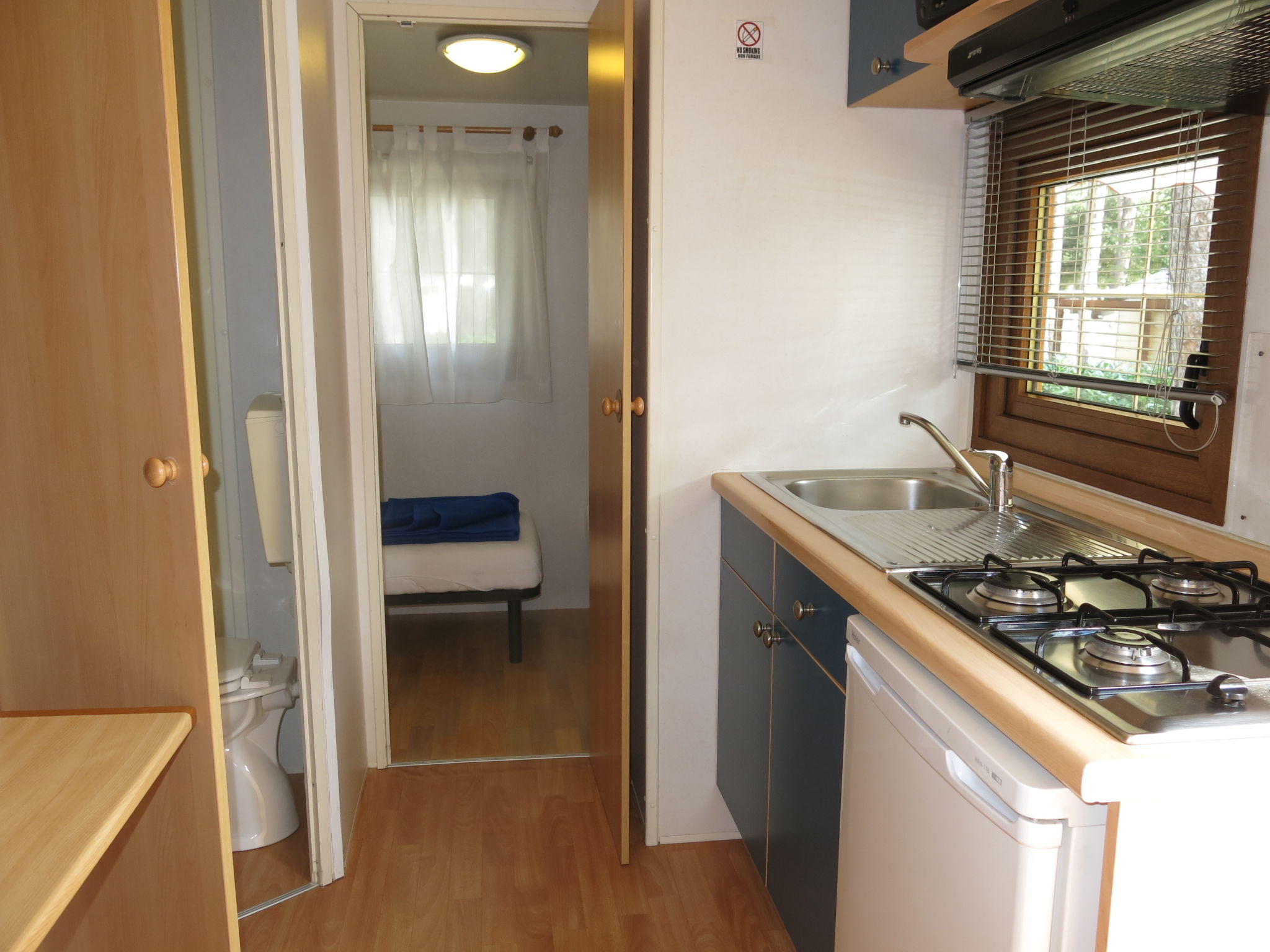 "Comfort", 3-Zimmer-Mobilheim 22 m2. Zweckmässig eingerichtet: Wohn-/Esszimmer mit Esstisch, Digital-TV, Klimaanlage und Warmluftheizung. 1 Zimmer mit 1 franz. Bett (140 cm), sep. WC. 1 Zimmer mit 2 Betten (70 cm). Kochnische (4 Flammen). Dusche/WC. Gartensitzplatz überdacht. Parkplatz (1 Auto) beim Haus. Bitte beachten: Nichtraucher-Unterkunft.