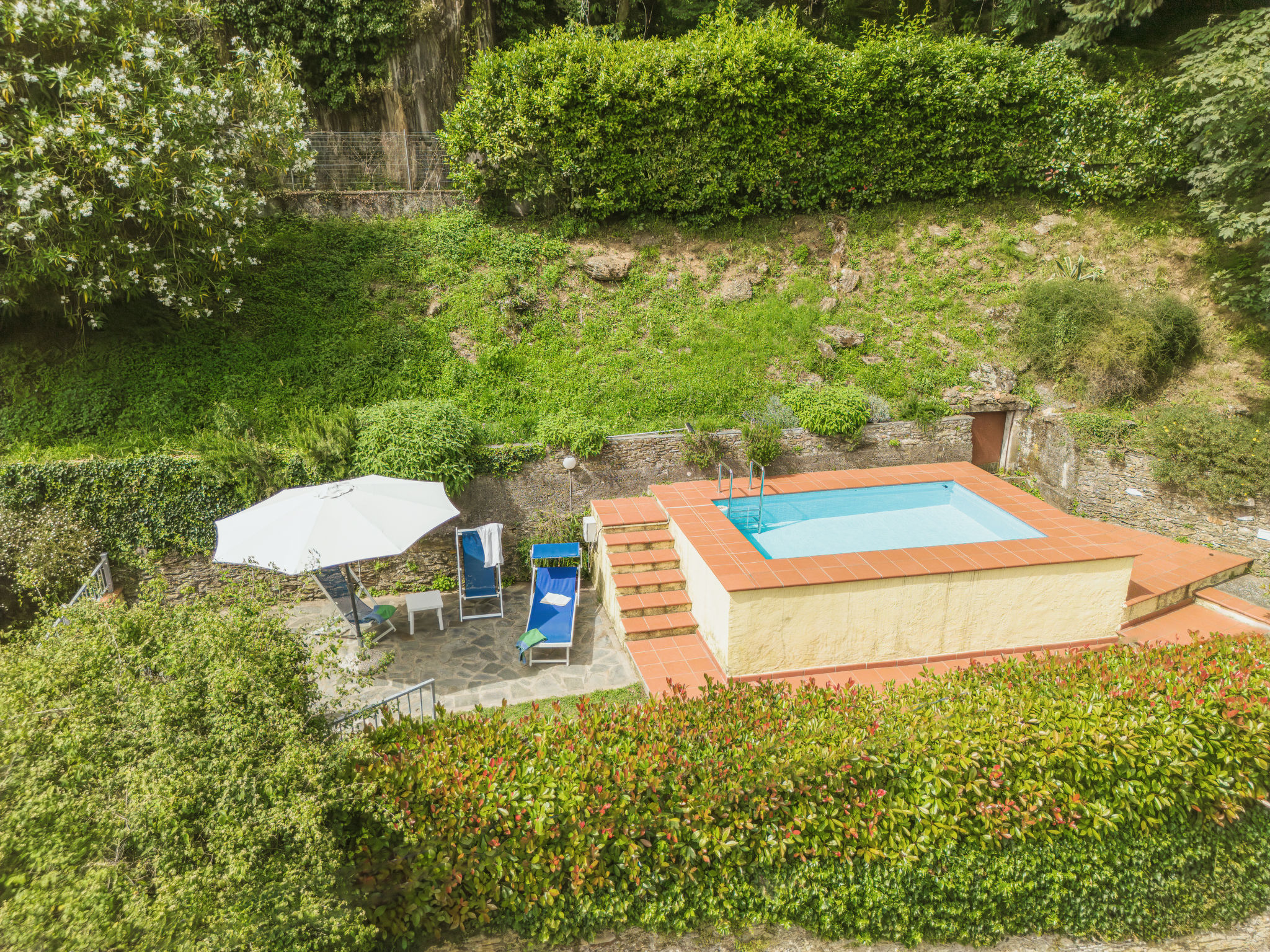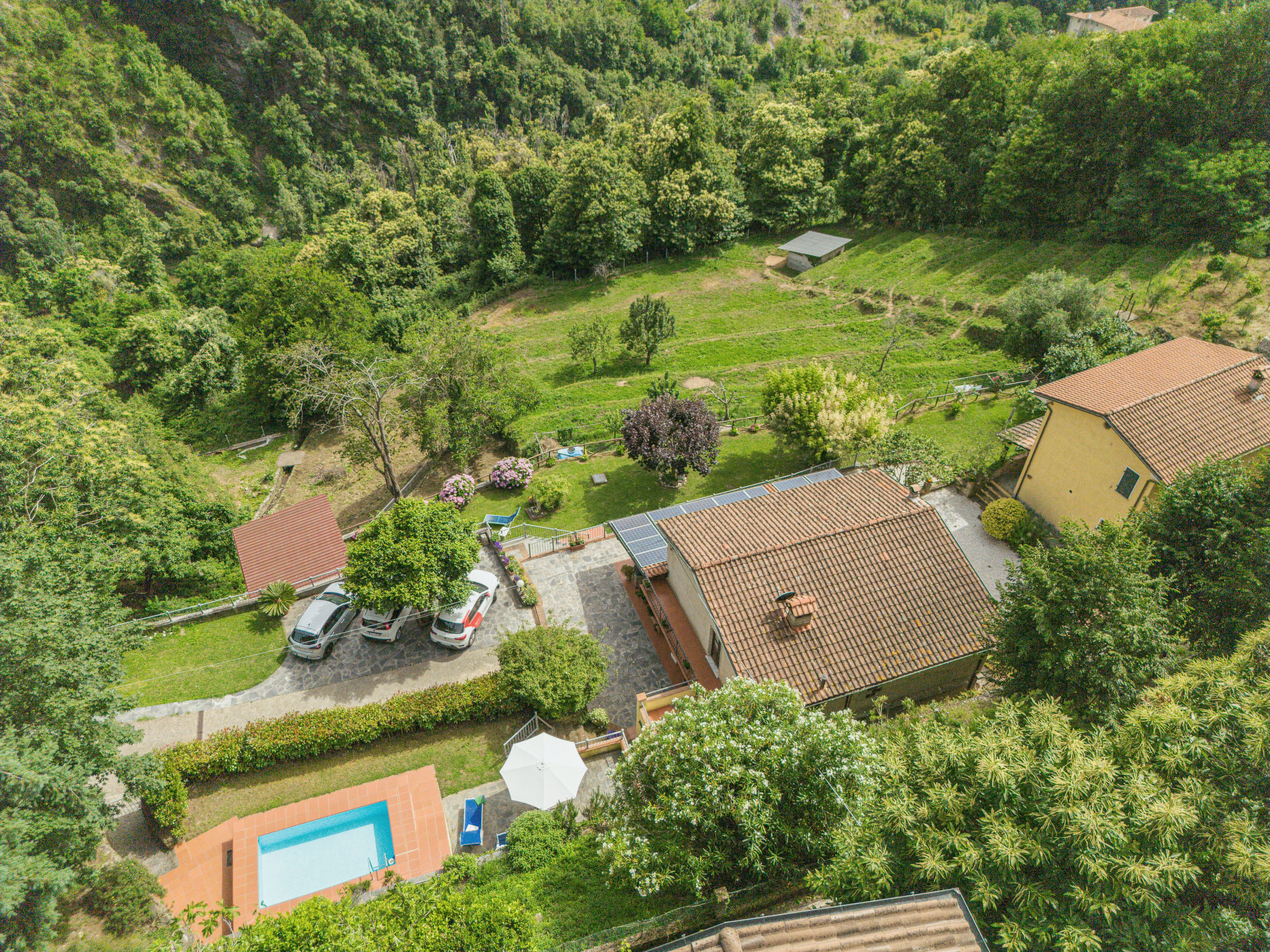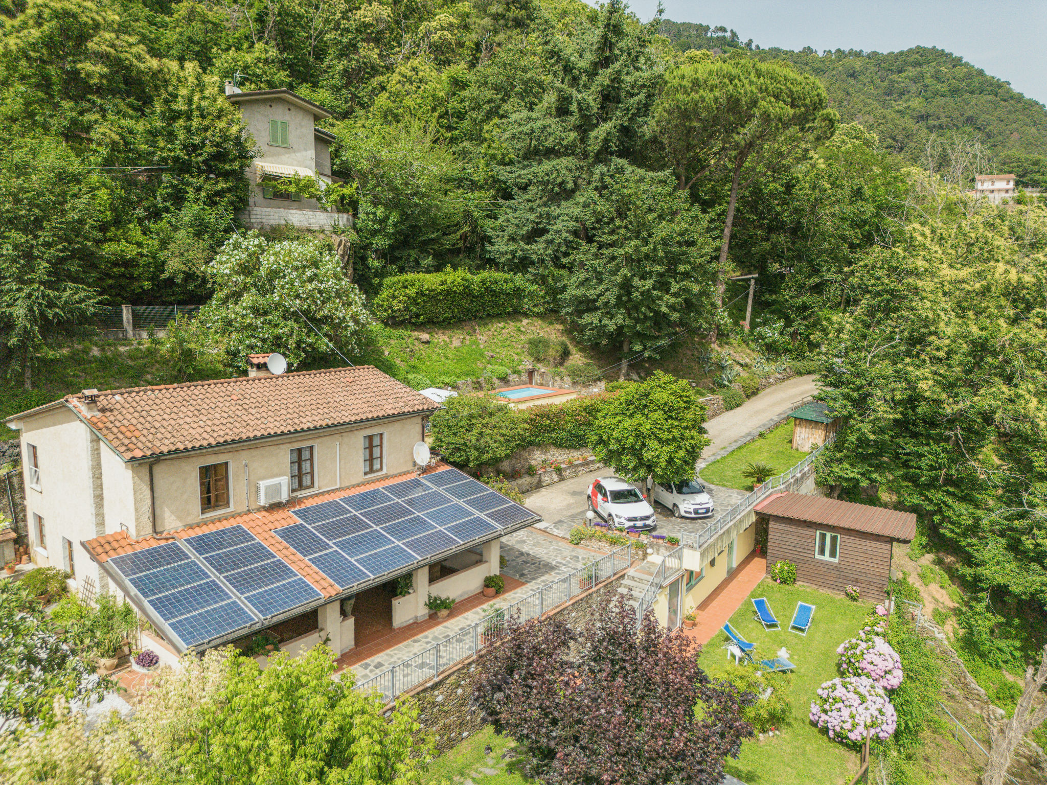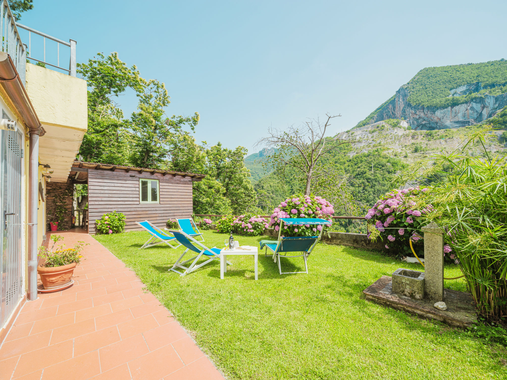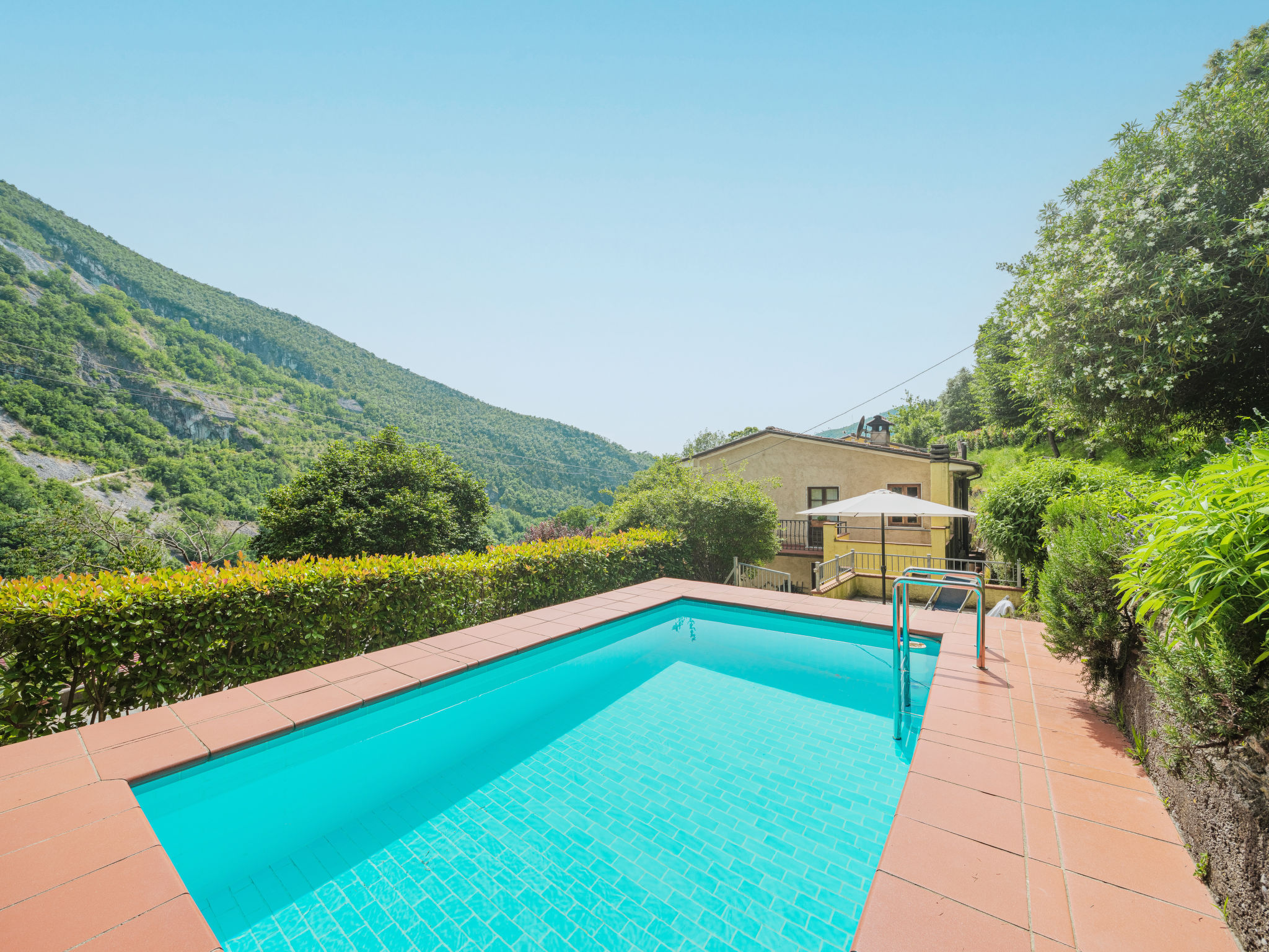 Seravezza: Gemütlicher, rustikaler Landsitz "La Grande Aia", auf 2 Stockwerken. 2 Häuser in der Residenz. 1 km vom Zentrum von Seravezza, ruhige, sonnige Lage am Hang, in einem Wohnquartier, 20 m vom Waldrand, 9 km vom Meer, in einer Sackgasse, im Grünen. Zur Mitbenutzung: grosser, gepflegter Terrassengarten (eingezäunt) mit Rasen. Zur Alleinbenutzung: Garten 50 m2, Aufstellpool eingezäunt (3 x 5 m, 140 cm tief, 28.05.-24.09.). Terrasse, Gartenmöbel, Grill. In der Anlage: Sauna (extra). Sprudelbad, Waschmaschine (zur Mitbenutzung). Wäschewechsel (zusätzlich extra). Handtuchwechsel (zusätzlich extra). Steile, schmale Zufahrt bis zum Haus. Parkplatz beim Haus auf dem Grundstück. Lebensmittelgeschäft 1 km, Supermarkt 1 km, Restaurant 1 km, Sandstrand "Forte dei Marmi" 11 km. Golfplatz (18 Loch) 12 km, Wanderwege ab Haus 30 m. Nahe gelegene Sehenswürdigkeiten: Pietrasanta 5 km, Forte dei Marmi 10 km, Lucca 34 km, Pisa 40 km. Bitte beachten: Fahrzeug empfohlen. Ferienwohnung Ref. IT5167.150.1 befindet sich auf dem gleichen Grundstück.