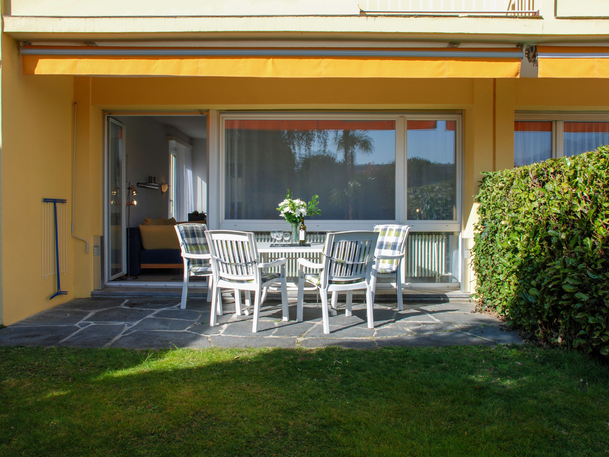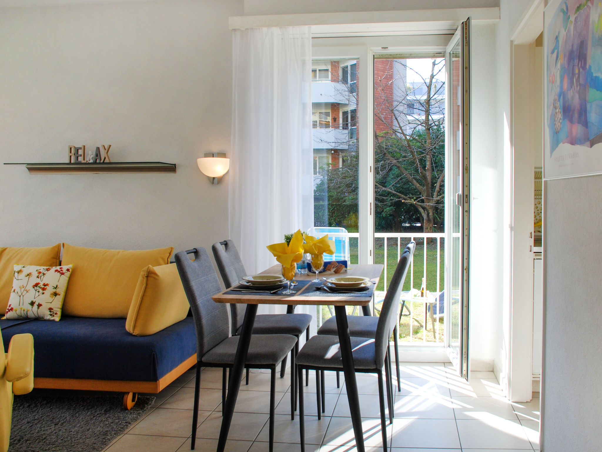 " Einzige, Eck-Gartenview App 11", 1-Zimmer-Wohnung 40 m2, im Erdgeschoss, Nordostlage. Geräumig und hell, teilweise renoviert im Jahre 2022, komfortabel und gemütlich eingerichtet: offenes Wohn-/Esszimmer mit 2 Betten (90 cm, Länge 200 cm), 1 Diwanbett (160 cm, Länge 200 cm), Esstisch und Sat-TV (Flachbildschirm), Radio. Ausgang zum Gartensitzplatz. Kleine Küche (2 Kochplatten, Backofen, Toaster, Wasserkocher, elektrische Kaffeemaschine, Kapseln für die Kaffeemaschine (Nespresso) extra). Bad/WC. Grosser Gartensitzplatz teilweise überdacht. Liegestühle (2). Schöne Sicht auf den Garten. Zur Verfügung: Haartrockner. Internet (Wireless LAN, gratis). Bitte beachten: Nichtraucher-Unterkunft. Die Eckwohnung im Erdgeschoss mit seitlichem Fenster sorgt für eine lichtdurchflutete Wohnung, die Einzige in dieser Überbauung. Closomat vorhanden im Bad/WC. 10m2 grosser Sitzplatz/Terrasse! Ausschliesslich deutschsprachige TV-Sender und ein Sender auf Italienisch (RSI HD).