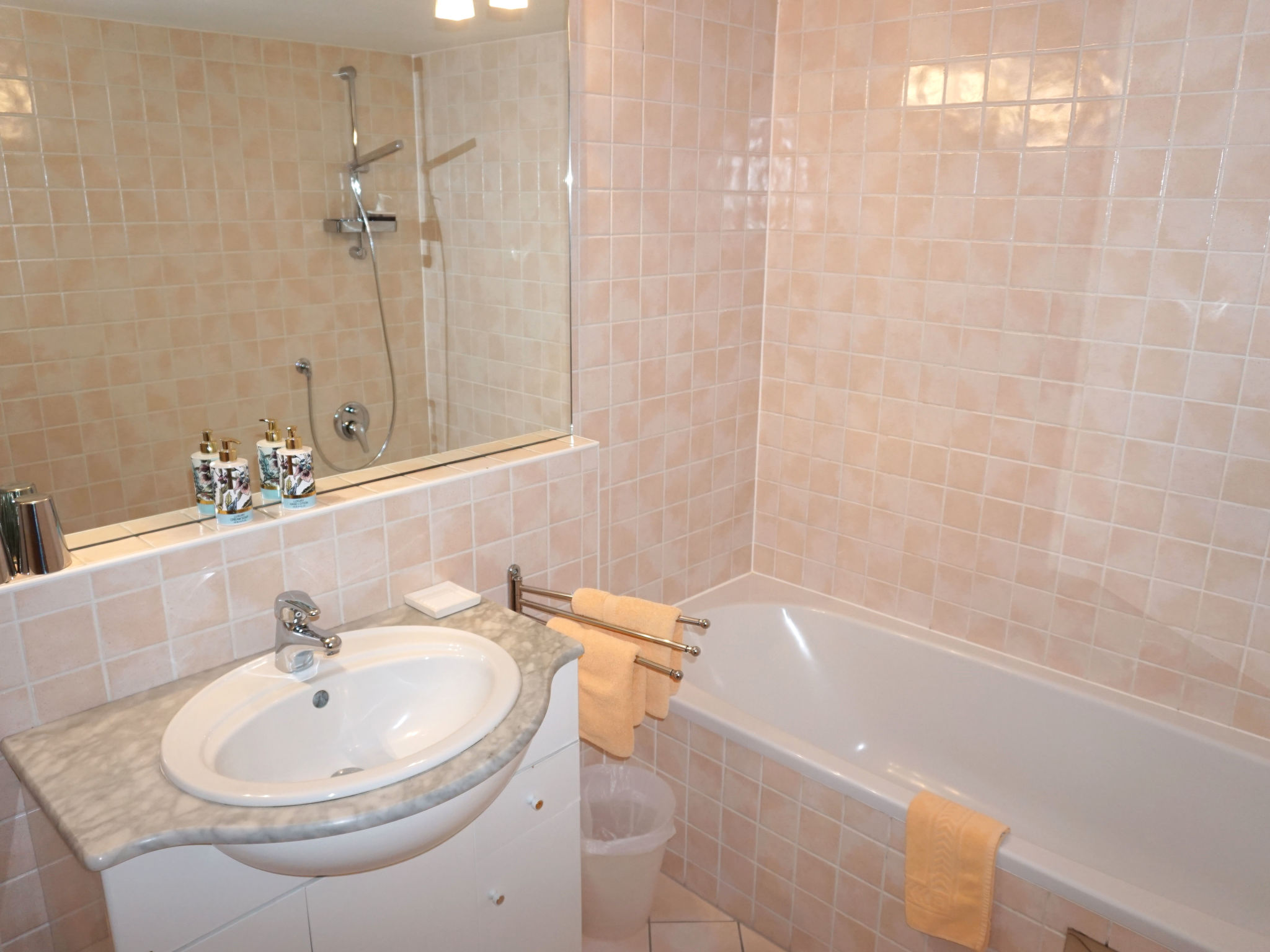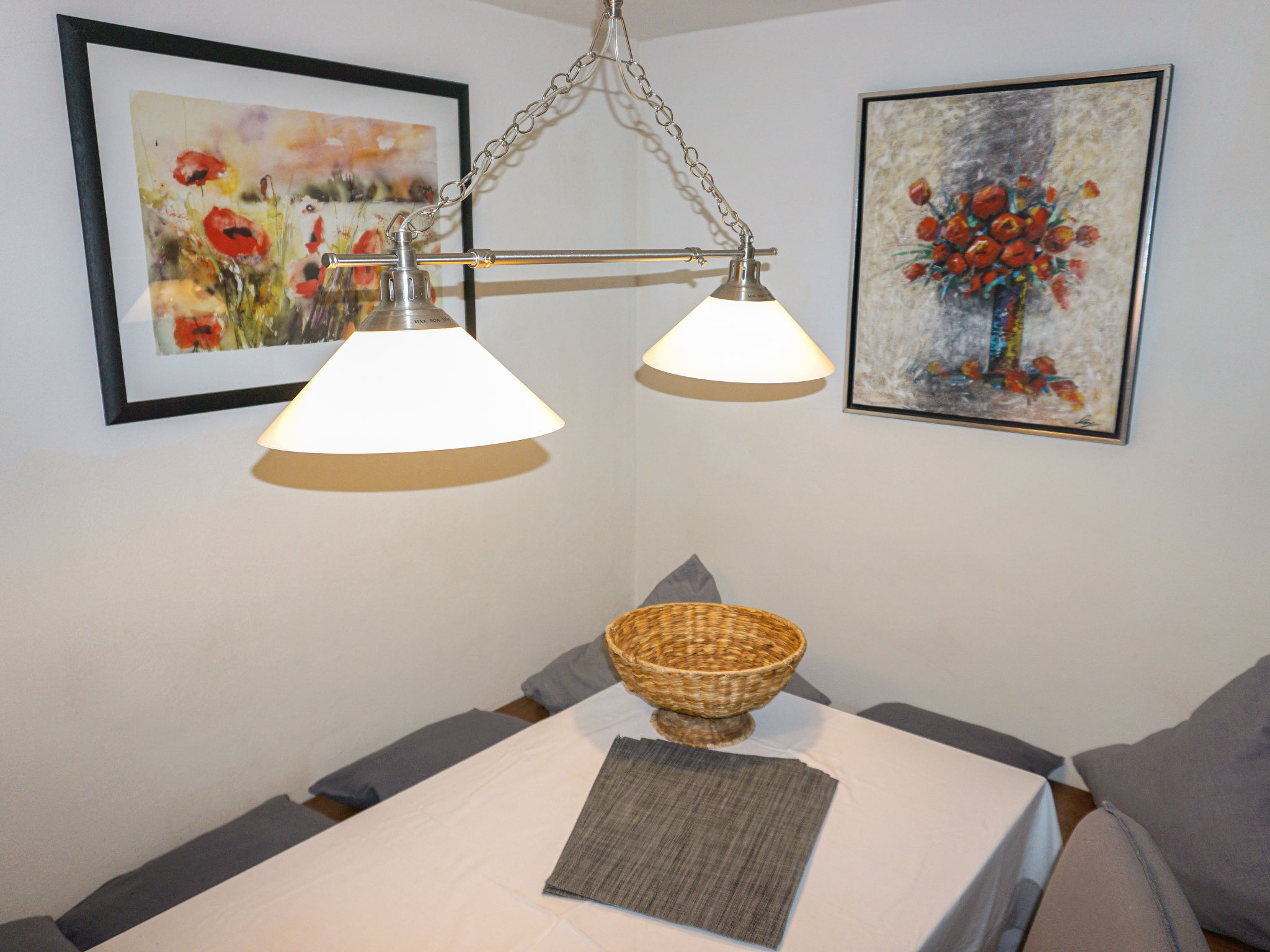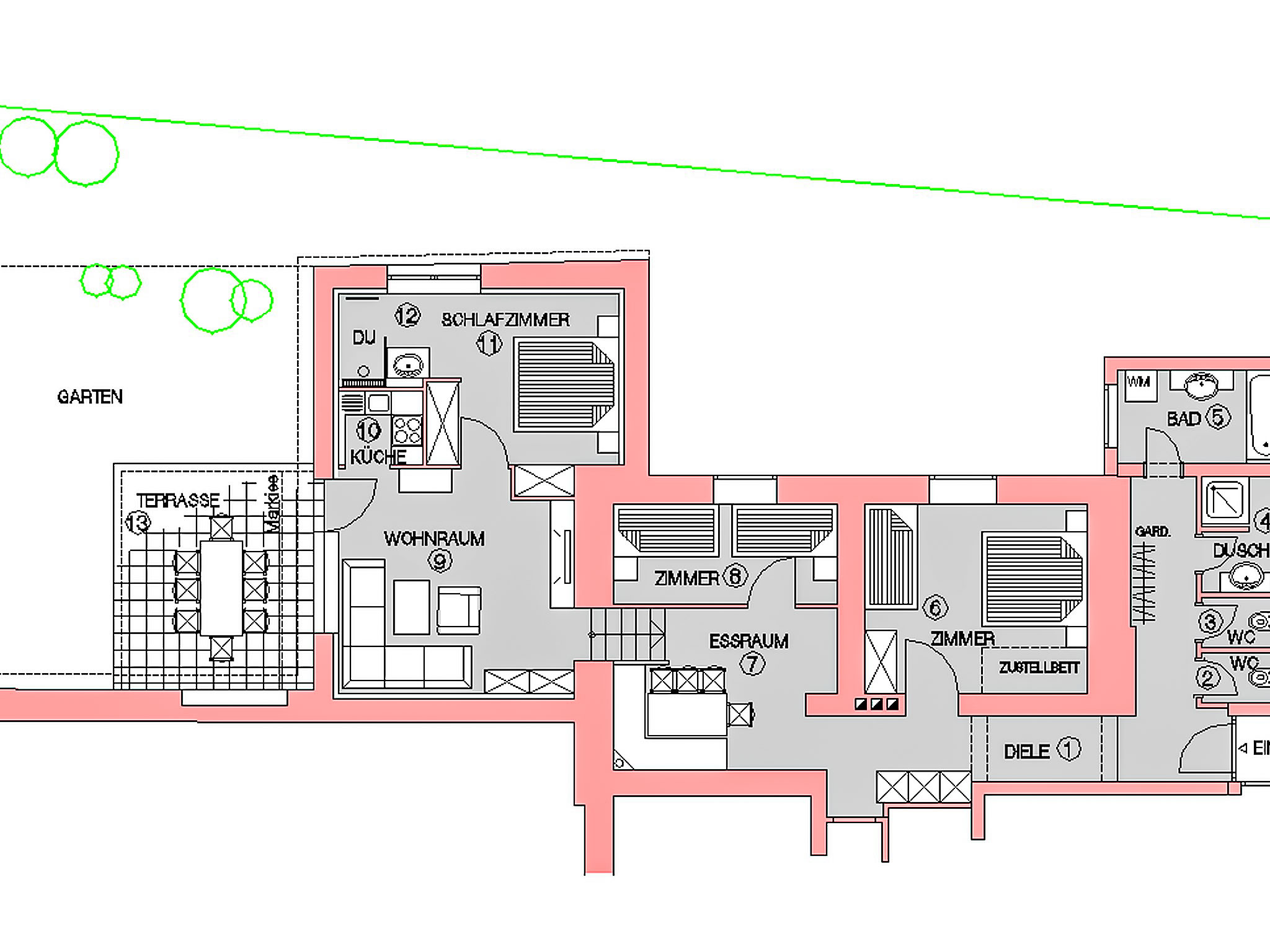 4-Zimmer-Wohnung 110 m2, im Erdgeschoss. Komfortabel eingerichtet: Wohnzimmer mit Sat-TV (Flachbildschirm), Stereoanlage. Ausgang zum Garten, zur Terrasse. Offenes Esszimmer. 1 Doppelzimmer mit Dusche. 1 Zimmer mit 1 Bett und 1 Doppelbett. 1 Zimmer mit 2 Betten. Kleine Kochnische (4 Kochplatten, Geschirrspüler, Mikrowelle). Bad, Dusche, 2 sep. WC's. Terrasse. Terrassenmöbel. Zur Verfügung: Bügeleisen, Haartrockner. Internet (Wireless LAN, gratis). Bitte beachten: Maximal 1 Haustier/Hund erlaubt. Eigener Eingang. Das Wohnzimmer ist mit dem Esszimmer über eine kurze Treppe verbunden.