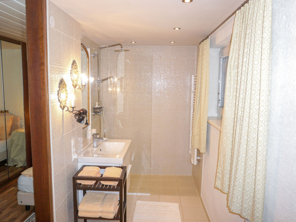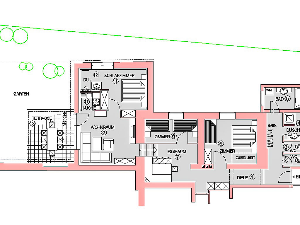 4-Zimmer-Wohnung 110 m2, im Erdgeschoss. Komfortabel eingerichtet: Wohnzimmer mit Sat-TV (Flachbildschirm), Stereoanlage. Ausgang zum Garten, zur Terrasse. Offenes Esszimmer. 1 Doppelzimmer mit Dusche. 1 Zimmer mit 1 Bett und 1 Doppelbett. 1 Zimmer mit 2 Betten. Kleine Kochnische (4 Kochplatten, Geschirrspüler, Mikrowelle). Bad, Dusche, 2 sep. WC's. Terrasse. Terrassenmöbel. Zur Verfügung: Bügeleisen, Haartrockner. Internet (Wireless LAN, gratis). Bitte beachten: Maximal 1 Haustier/Hund erlaubt. Eigener Eingang. Das Wohnzimmer ist mit dem Esszimmer über eine kurze Treppe verbunden.