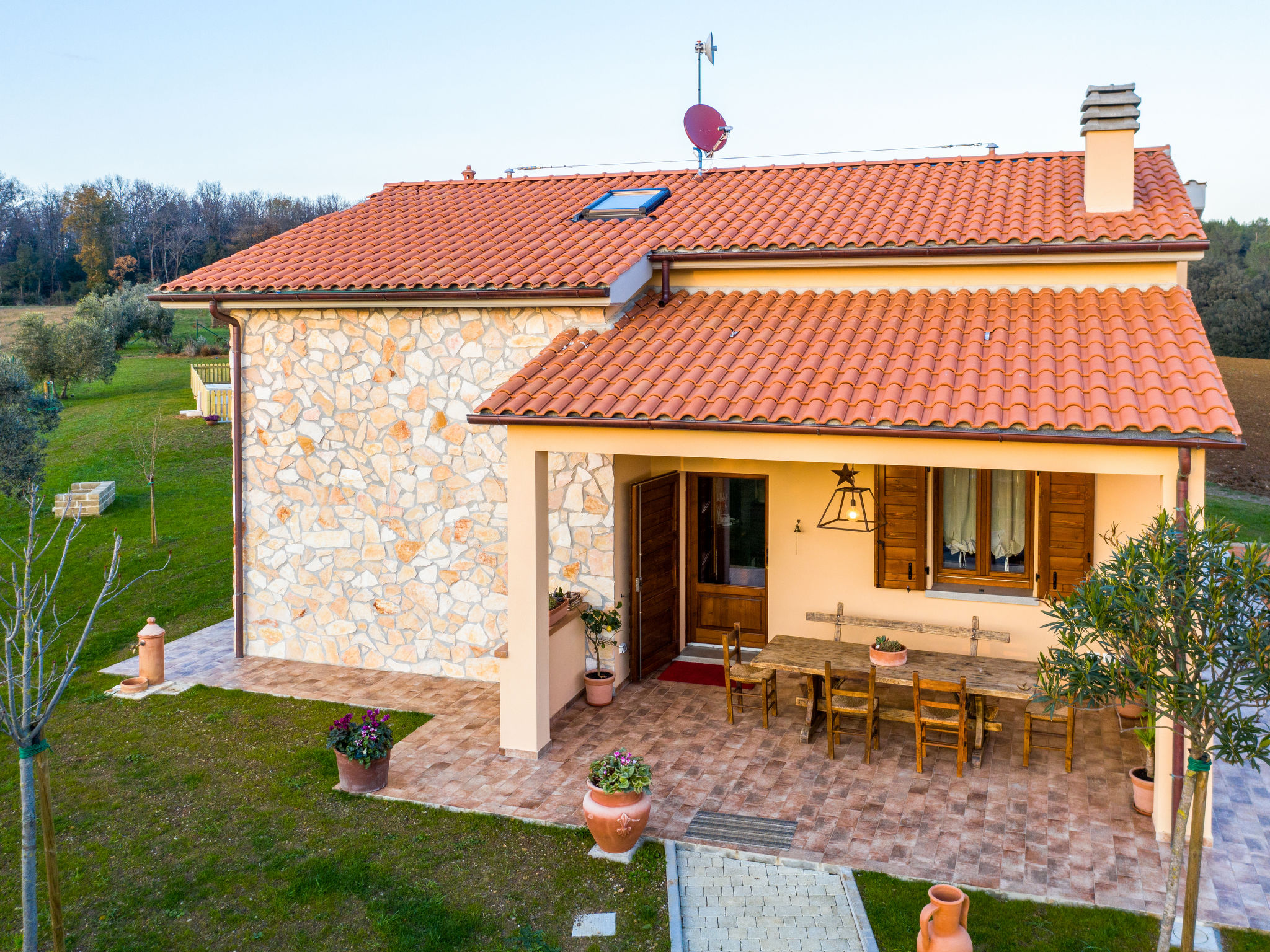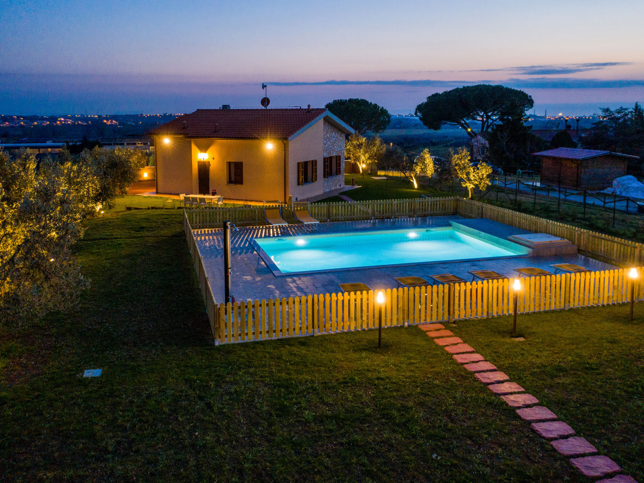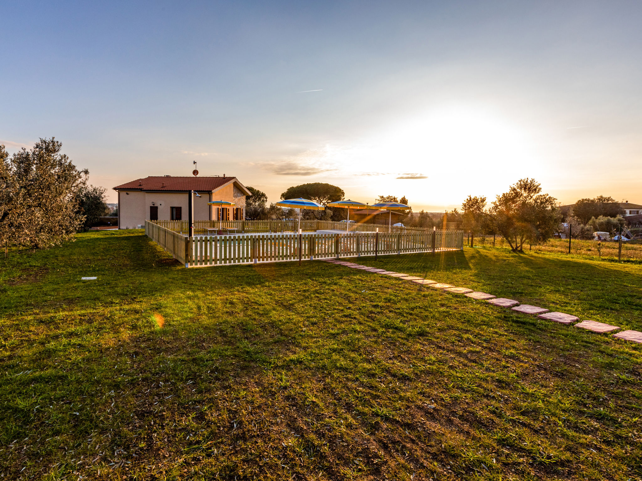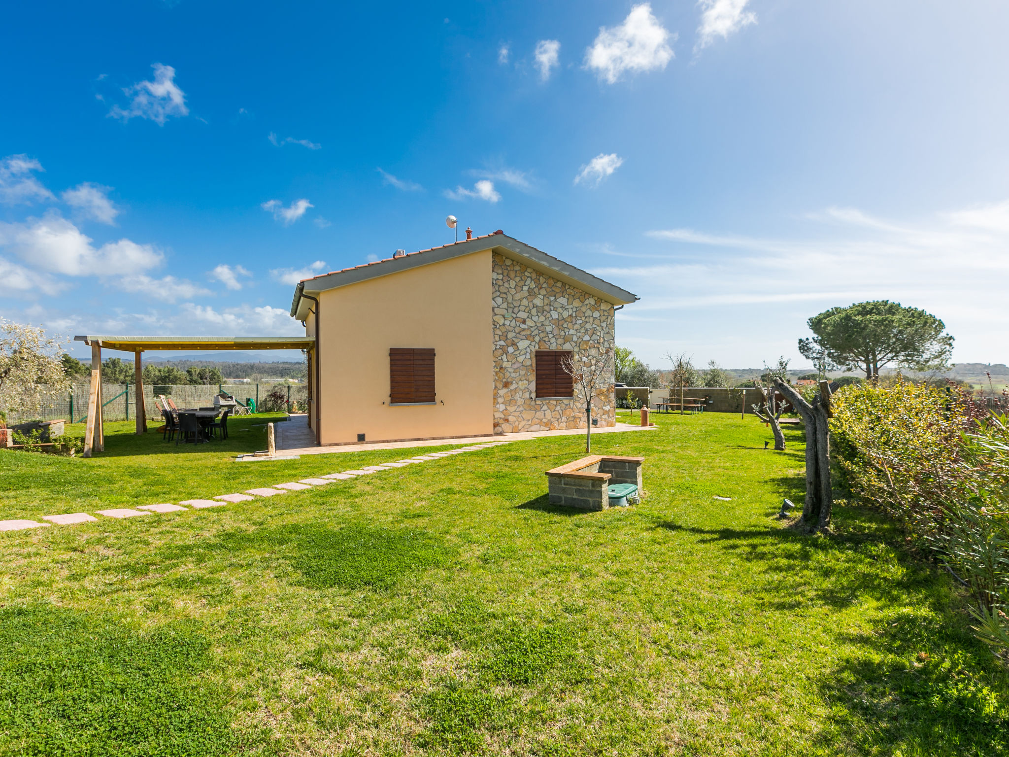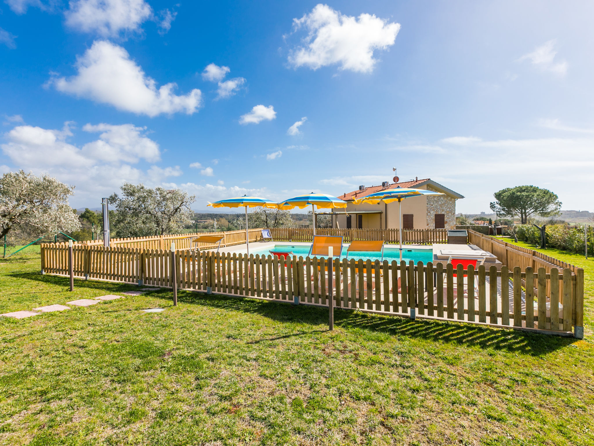 Sehr schönes Haus "Melograno", Baujahr 2020. 8.5 km vom Zentrum von Riparbella, 4 km vom Zentrum von San Pietro in Palazzi, 5 km vom Zentrum von Cecina, sonnige, erhöhte Lage, 8.5 km vom Meer, im Grünen. Zur Alleinbenutzung: Grundstück 4'000 m2 (eingezäunt), Garten Pflanzen und Bäumen, Wiese, Schwimmbad eingezäunt (8 x 5 m, 150 cm tief, saisonale Verfügbarkeit: 27.Mar.-06.Nov.). Aussendusche, Sitzplatz, Terrasse (15 m2), Gartenmöbel, Grill, Kinderspielplatz. 100 m lange Zufahrt (Naturweg). Parkplatz (für 2 Autos) auf dem Grundstück. Supermarkt 1.4 km, Einkaufszentrum 1.4 km, Restaurant 2 km, Bahnstation "San Pietro in Palazzi" 5.5 km, Sandstrand "Cecina Mare, Bagno Gabbiano" 8.5 km, Kieselstrand "Le Gorette" 7 km, Hallenbad 8.5 km, Thermalbad "Calidario" 38 km. Nahe gelegene Sehenswürdigkeiten: Pisa 52 km, Lucca 80 km, Firenze 112 km. EXTRA: Eine Sonnenliege, ein Liegestuhl und ein Sonnenschirm in der Badeanstalt Bagno Gabbiano in Marina di Cecina, 8,5 km entfernt, sind für die Kunden reserviert und im Preis inkludiert.