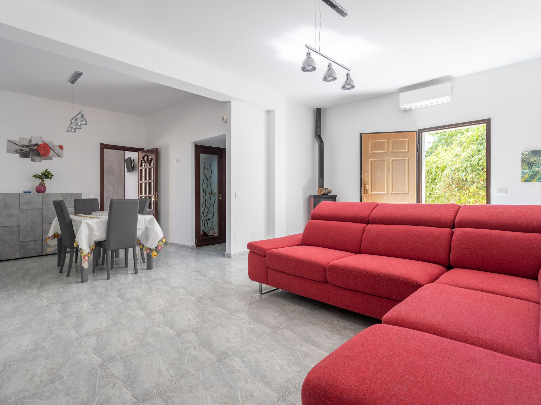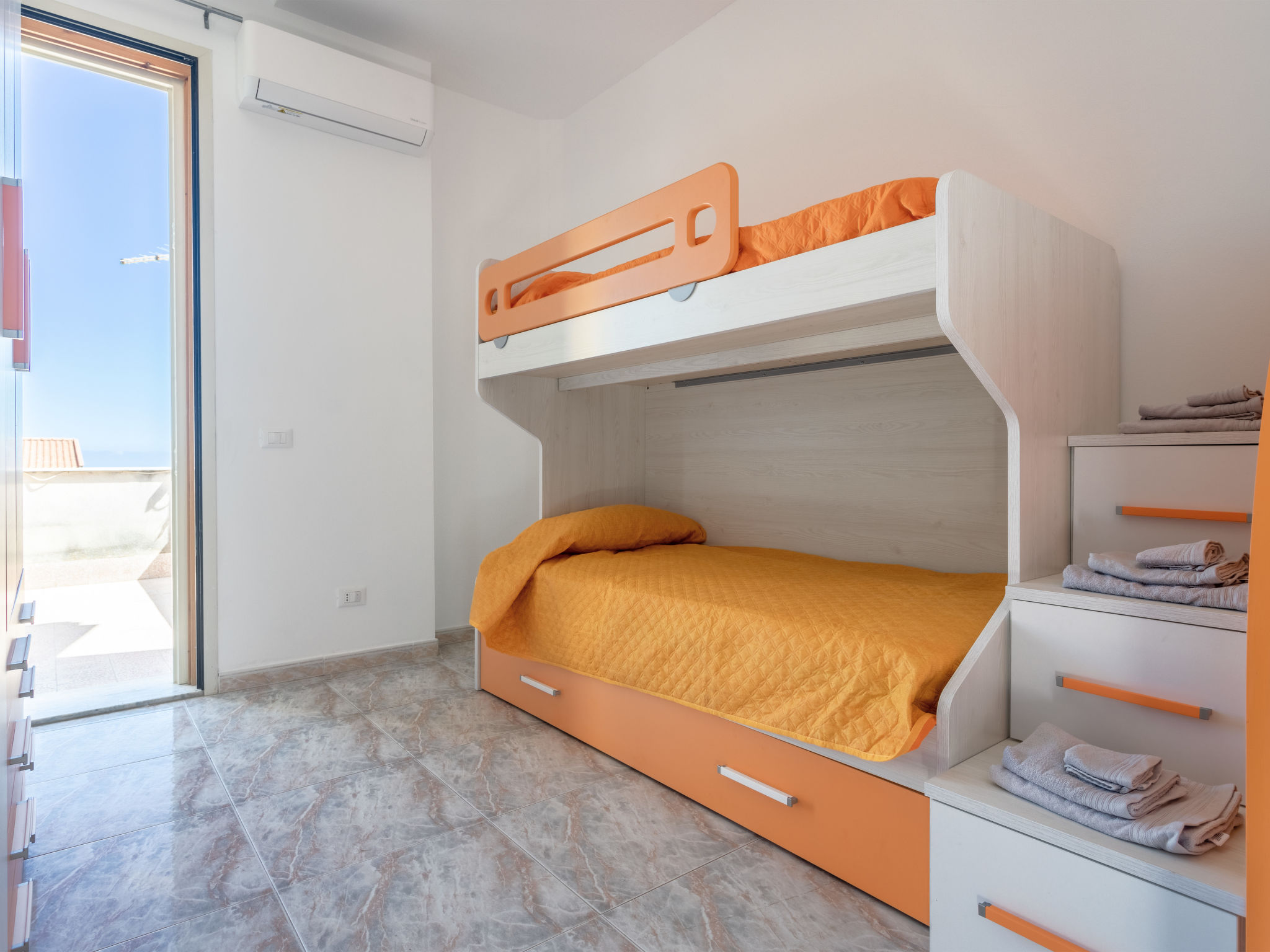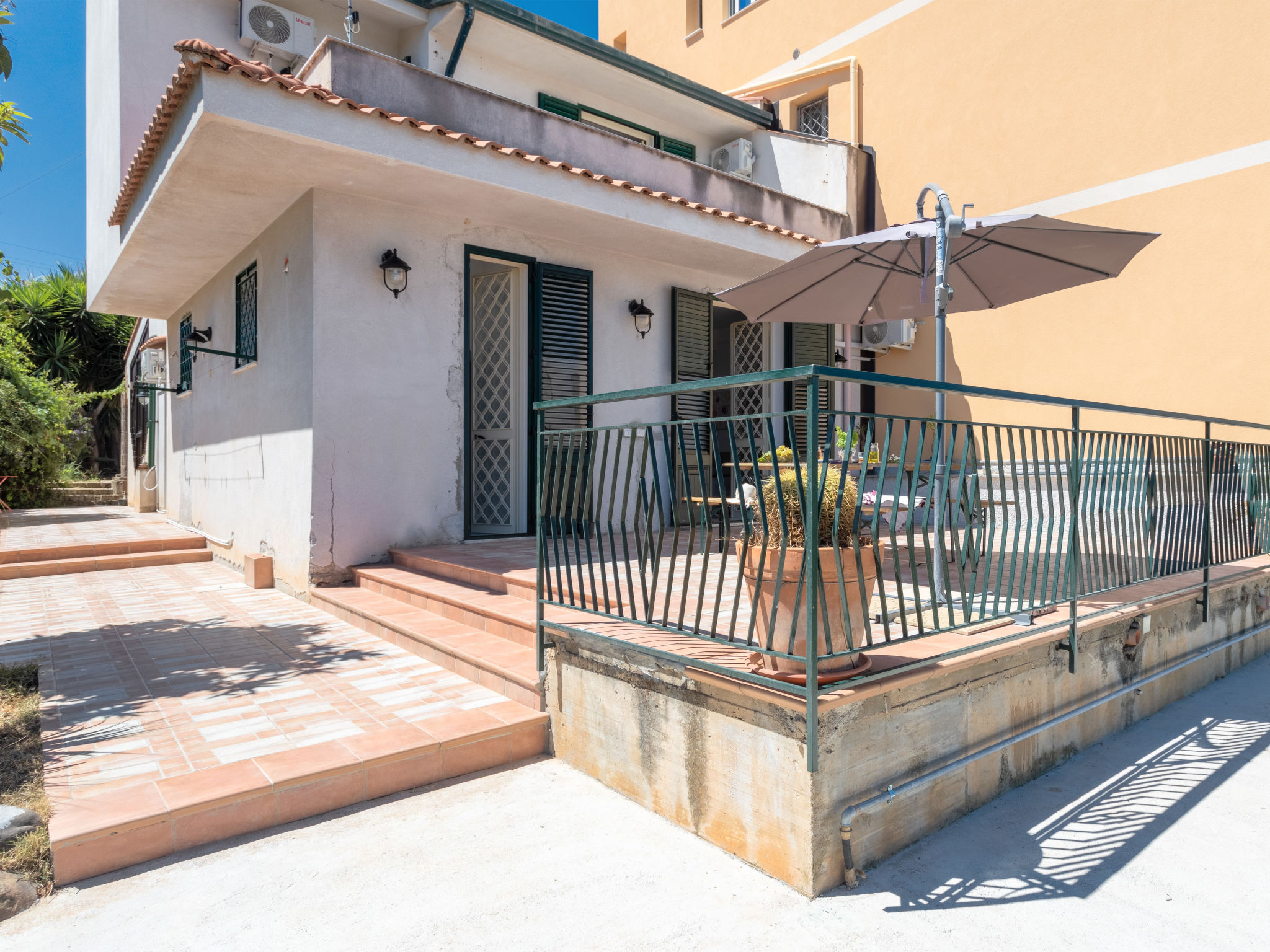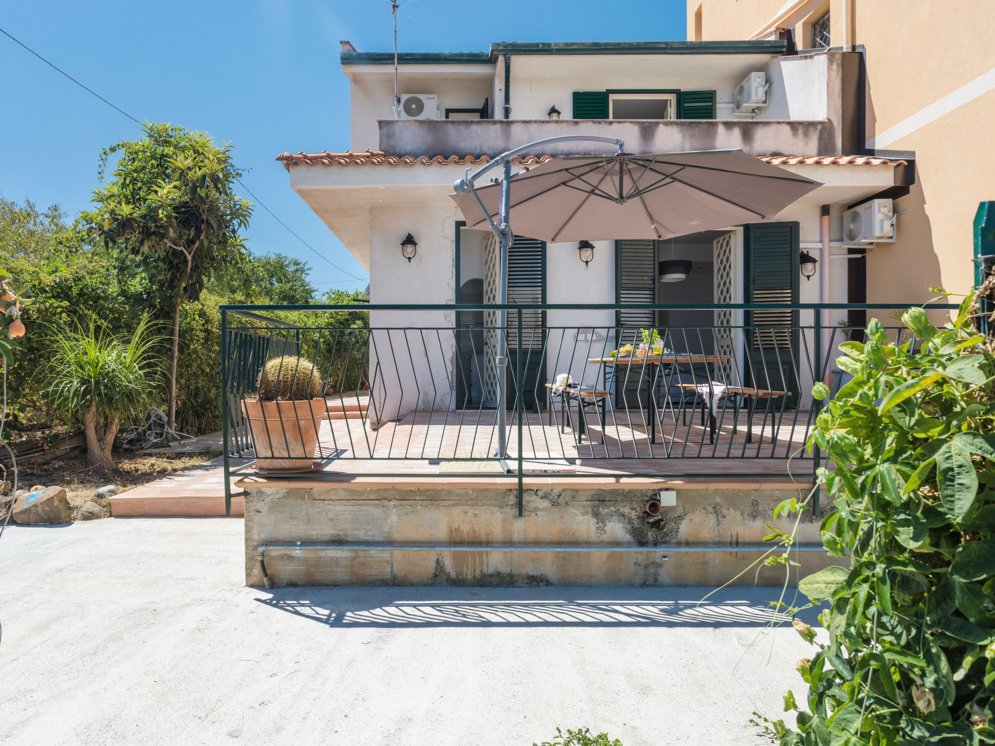 5-Zimmer-Doppelhaushälfte 200 m2 auf 2 Stockwerken, im Erdgeschoss. Renoviert im Jahre 2021, komfortabel und geschmackvoll eingerichtet: grosses Wohn-/Esszimmer mit 1 Doppeldiwanbett und Sat-TV (Flachbildschirm), Klimaanlage und Warmluftheizung. Ausgang zur Terrasse. 1 Doppelzimmer mit Klimaanlage und Warmluftheizung. Ausgang zur Terrasse. Küche (5 Kochplatten, Toaster, Wasserkocher, Mikrowelle, Tiefkühler, elektrische Kaffeemaschine) mit Esstisch. Ausgang zum Garten, zur Terrasse. Dusche/WC. Boiler (80 Liter). Obergeschoss: 1 Doppelzimmer mit Klimaanlage und Warmluftheizung. Ausgang zur Terrasse. 1 Zimmer mit 1 x 2 Etagenbetten, Klimaanlage und Warmluftheizung. Ausgang zur Terrasse. 1 Zimmer mit 2 Betten, Klimaanlage und Warmluftheizung. Bad/Dusche/Bidet/WC. Boiler (80 Liter). Grosse Terrasse 40 m2, Terrasse 20 m2. Terrassenmöbel, Gartengrill. Panoramasicht auf das Meer. Zur Verfügung: Waschmaschine, Bügeleisen, Kinderhochstuhl, Babybett bis 2 Jahre (extra), Haartrockner. Internet (Wireless LAN, gratis). Parkplatz (2 Autos).