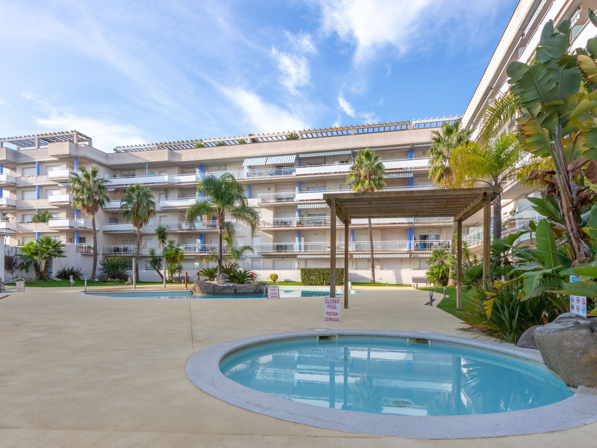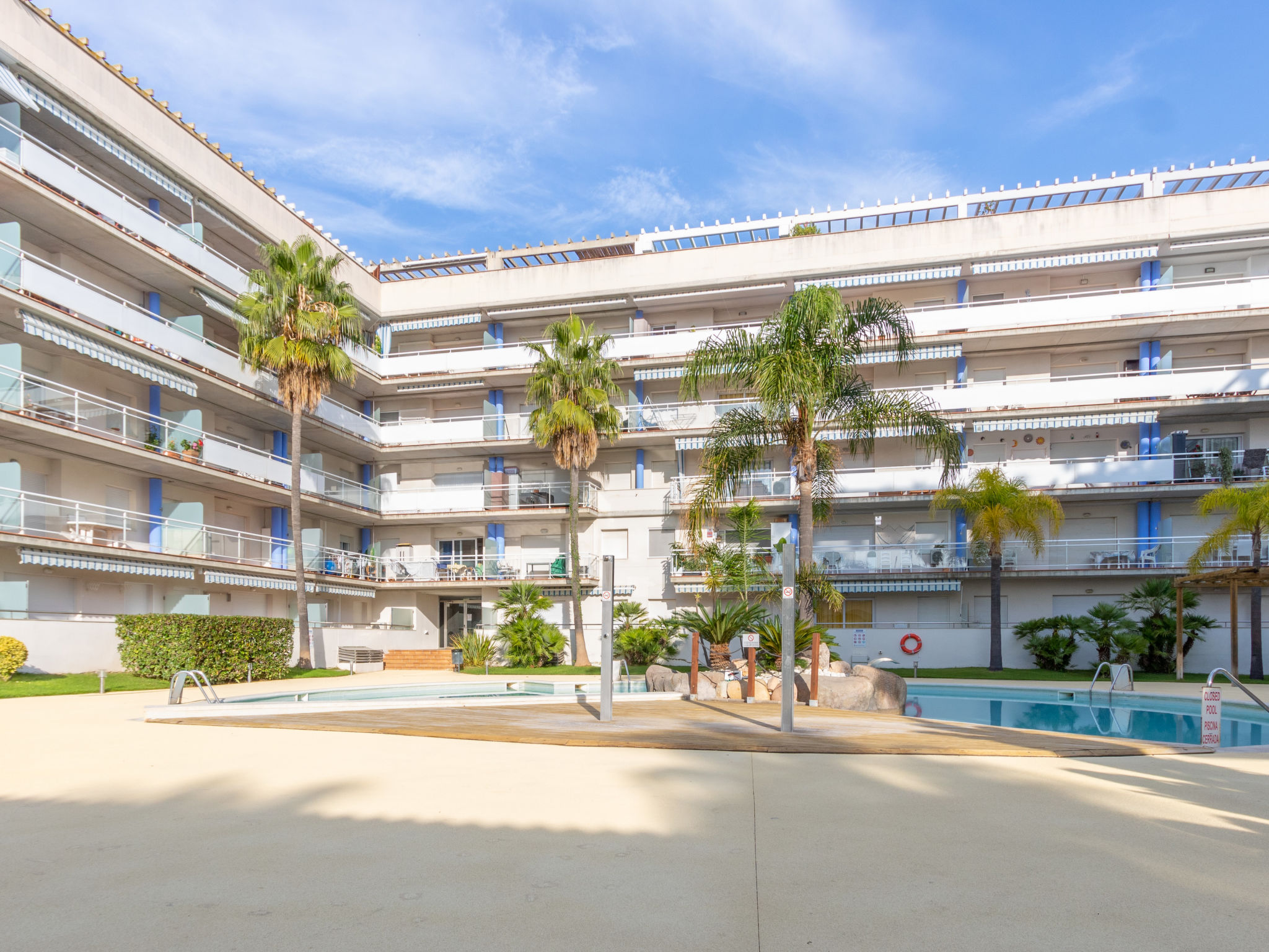Grosse, kinderfreundliche, schöne Feriensiedlung "Port Canigó". Im Ortsteil Santa Margarita, 3 km vom Zentrum von Roses, ruhige, sonnige Lage, verkehrsberuhigte Zone, 1.5 km vom Meer, in einer Sackgasse. Zur Mitbenutzung: Garten Pflanzen und Bäumen, Schwimmbad nierenförmig (100 - 160 cm tief, saisonale Verfügbarkeit: 01.Apr.-30.Okt.). Kinderbecken, Aussendusche, Terrasse. Im Hause: Restaurant, Bar, Einkaufsmöglichkeit, Fahrstuhl. Supermarkt 100 m, Einkaufszentrum 1.5 km, Restaurant, Bar 50 m, Sandstrand "Santa Margarita" 1.5 km, Badebucht 7 km. Golfplatz (18 Loch) 12 km, Surfschule 3 km, Segelschule 3 km, Tennis 2 km, Minigolf 1 km, Reitstall 5 km, Sportzentrum 3 km. Nahe gelegene Sehenswürdigkeiten: Parque Acuático Aquabrava Roses 2.8 km, Aeródromo y túnel del viento 6 km, Museo Dalí Figueres 17 km, Casino y festival de Peralada 21 km, Monasterio Sant Pere de Rodes 21 km, Cadaqués 18 km. Bitte beachten: Bewachte Residenz. Die Residenz wird durch elektrische Tore geschlossen. In diesem Haus sind weitere Ferienwohnungen mietbar.
