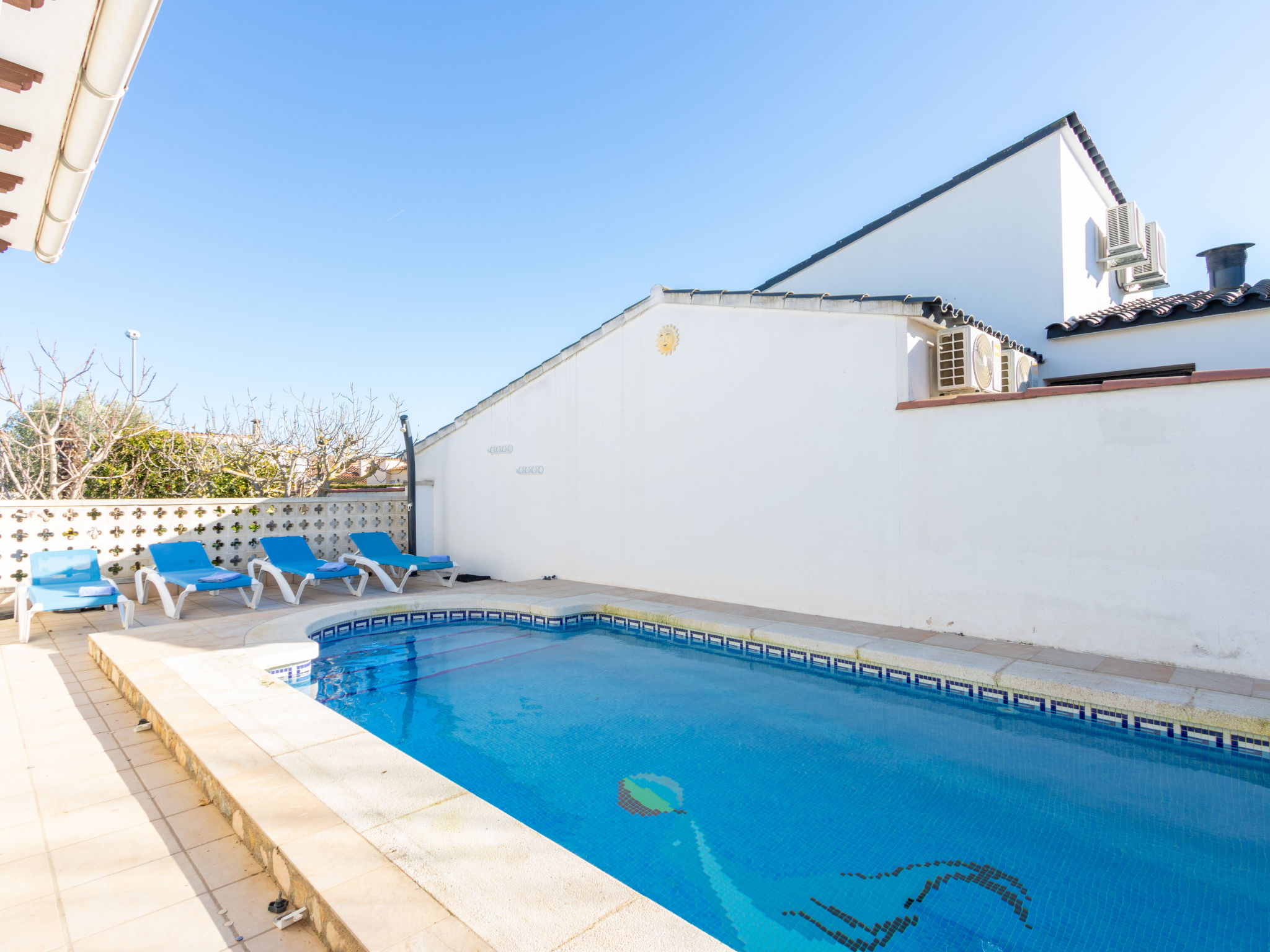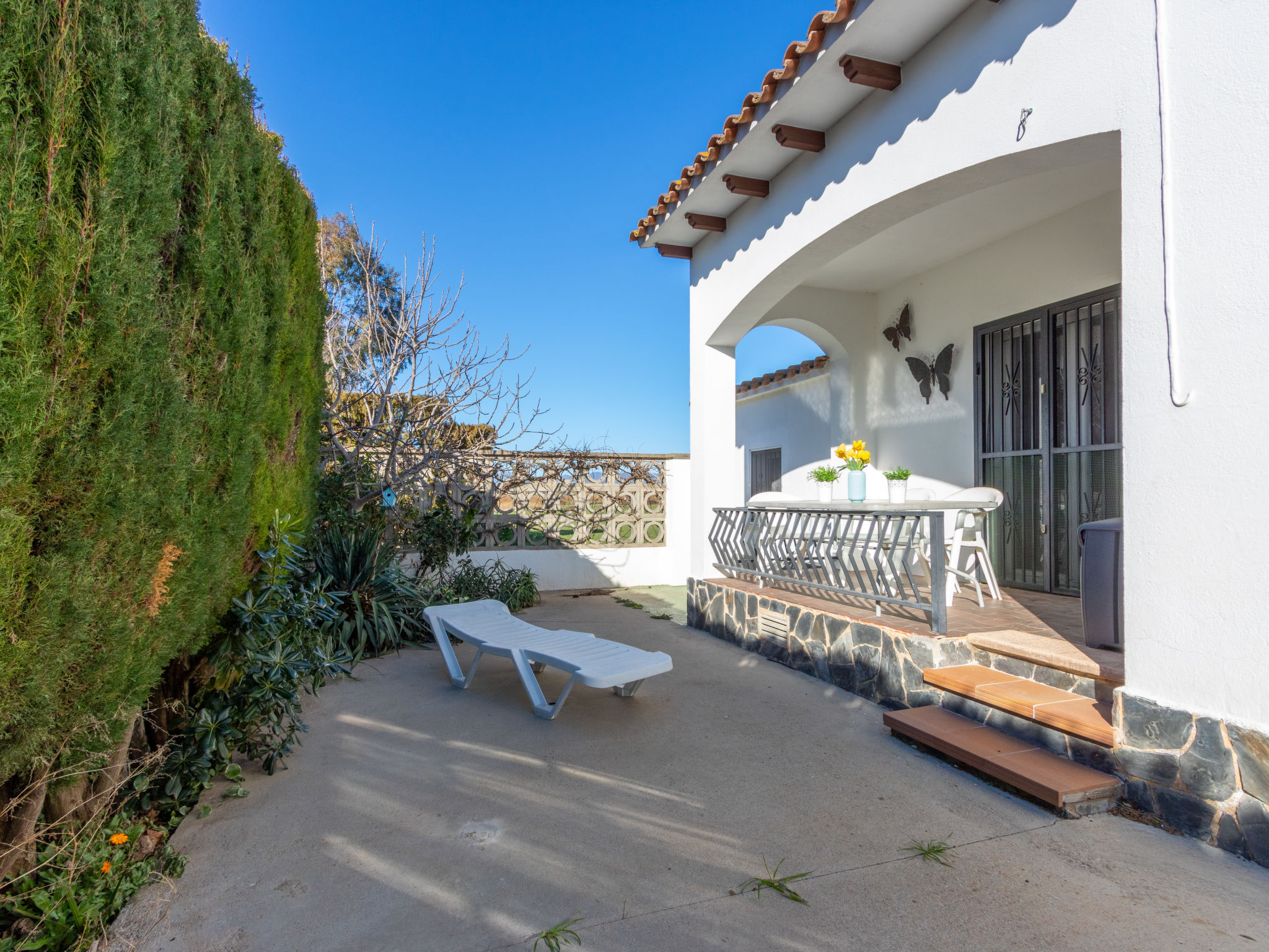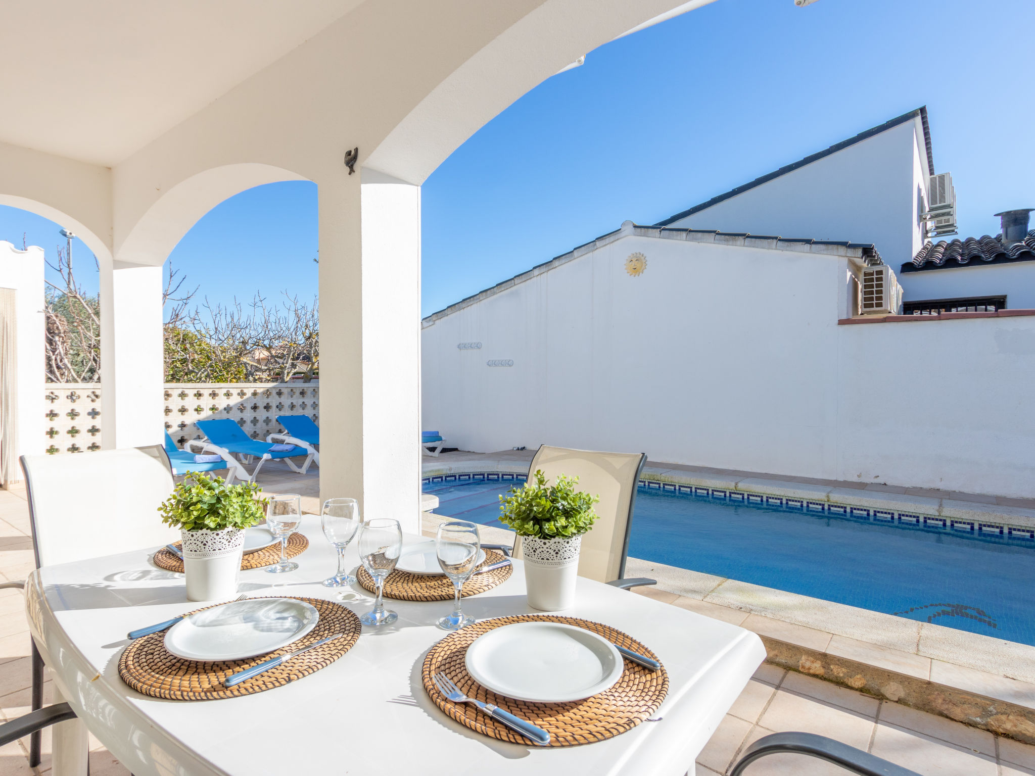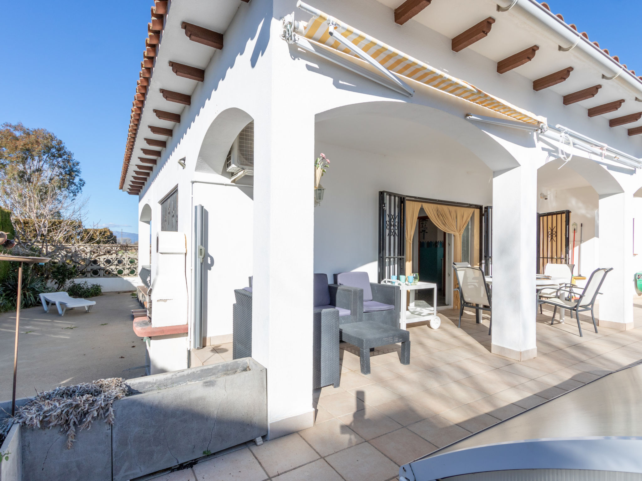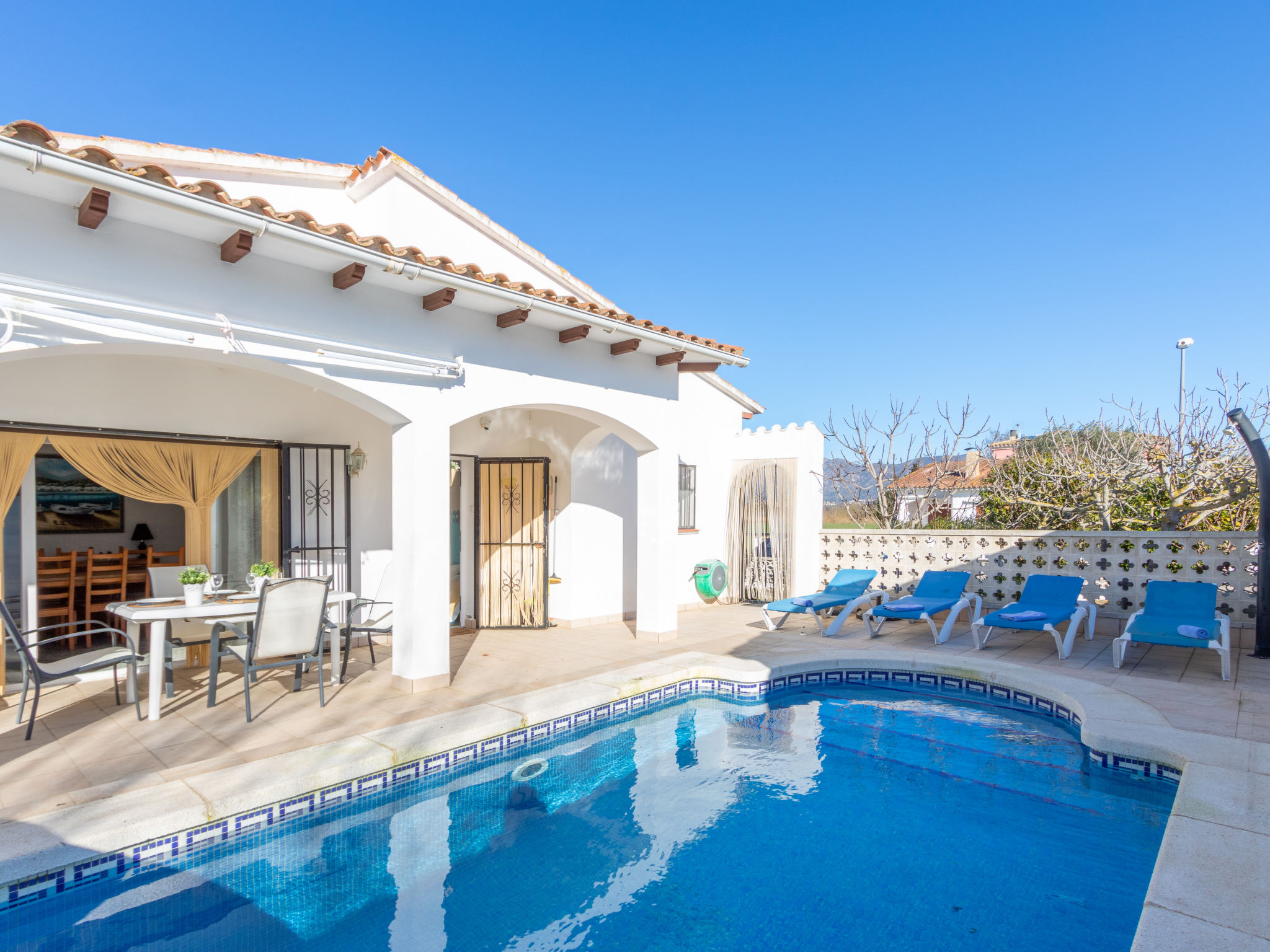 Masnou: Alleinstehendes, komfortables Einfamilienhaus "ERBANOZI". Im Ortsteil Mas Nou, 3 km vom Zentrum von Empuriabrava, sonnige Lage im Villenviertel, 4 km vom Meer, 1.3 km vom See, 4 km vom Strand, in einer Sackgasse, Richtung Süden. Zur Alleinbenutzung: Grundstück (eingezäunt), gepflegter Garten, Schwimmbad eckig (7 x 3 m, 140 - 190 cm tief, 10.04.-30.10.). Pergola, Terrasse, Gartenmöbel, Grill. Im Hause: Klimaanlage, Waschmaschine. Parkplatz beim Haus. Lebensmittelgeschäft, Supermarkt 400 m, Restaurant 1 km, Bar 1 km, Bäckerei 1 km, Bushaltestelle 500 m, Bahnstation "Figueres" 13 km, Sandstrand "Empuriabrava" 4 km. Sporthafen 4 km, Golfplatz (18 Loch) 12 km, Surfschule 3 km, Segelschule 3 km, Tennis 50 m, Minigolf 2.7 km, Sportzentrum 3 km, Wanderwege ab Haus 50 m, Radweg 100 m. Nahe gelegene Sehenswürdigkeiten: Centro de paracaidismo SKYDIVE 1.8 km, WINDOOR túnel del viento Empuriabrava 1.8 km, Parque acuático Roses 5 km, Festival y castillo de Peralada 12 km, Museo Dalí Figueres 21 km, Monasterio de Sant Pere de Rodes 23 km. Jugendgruppen nur auf Anfrage.