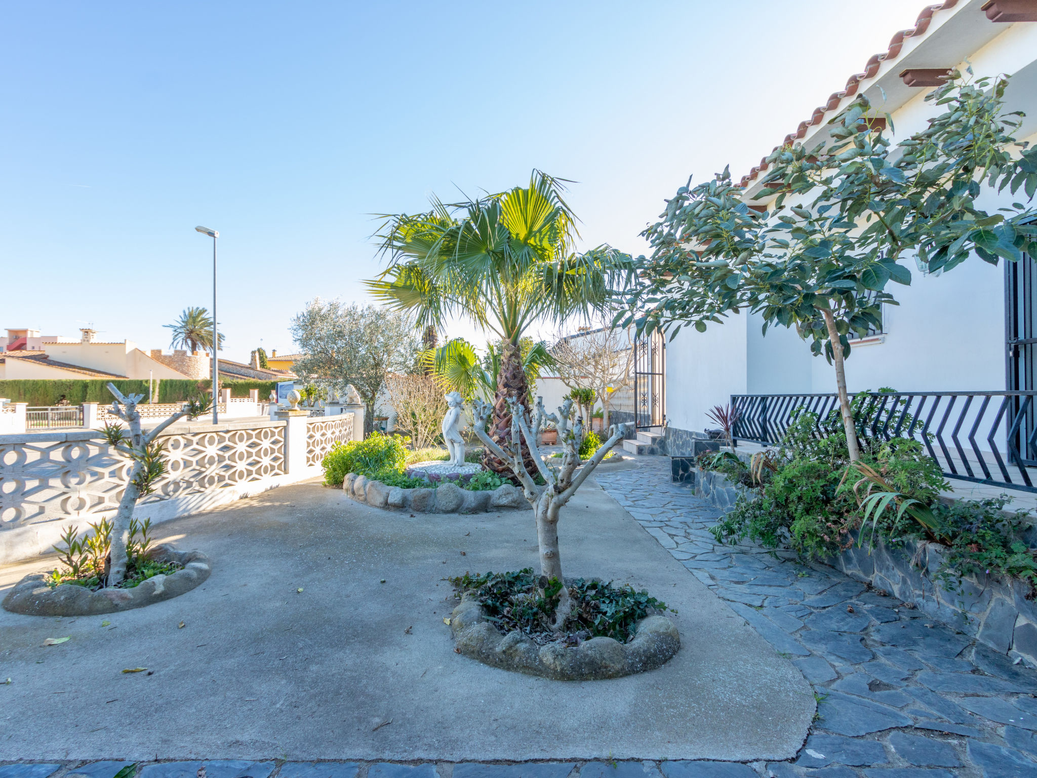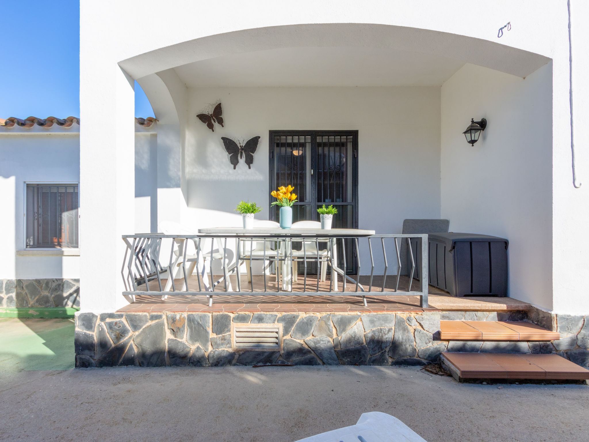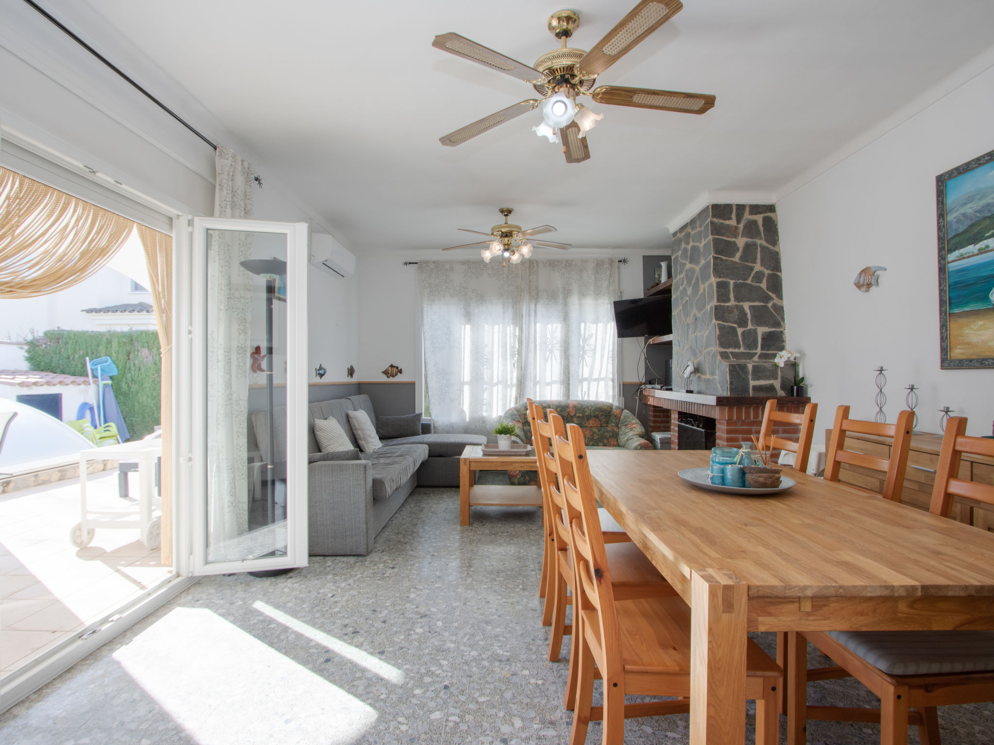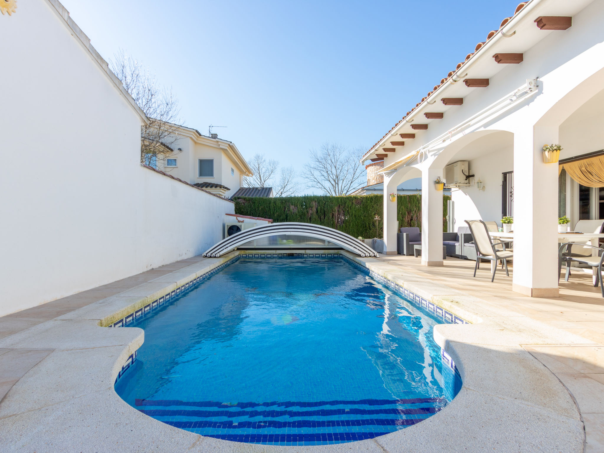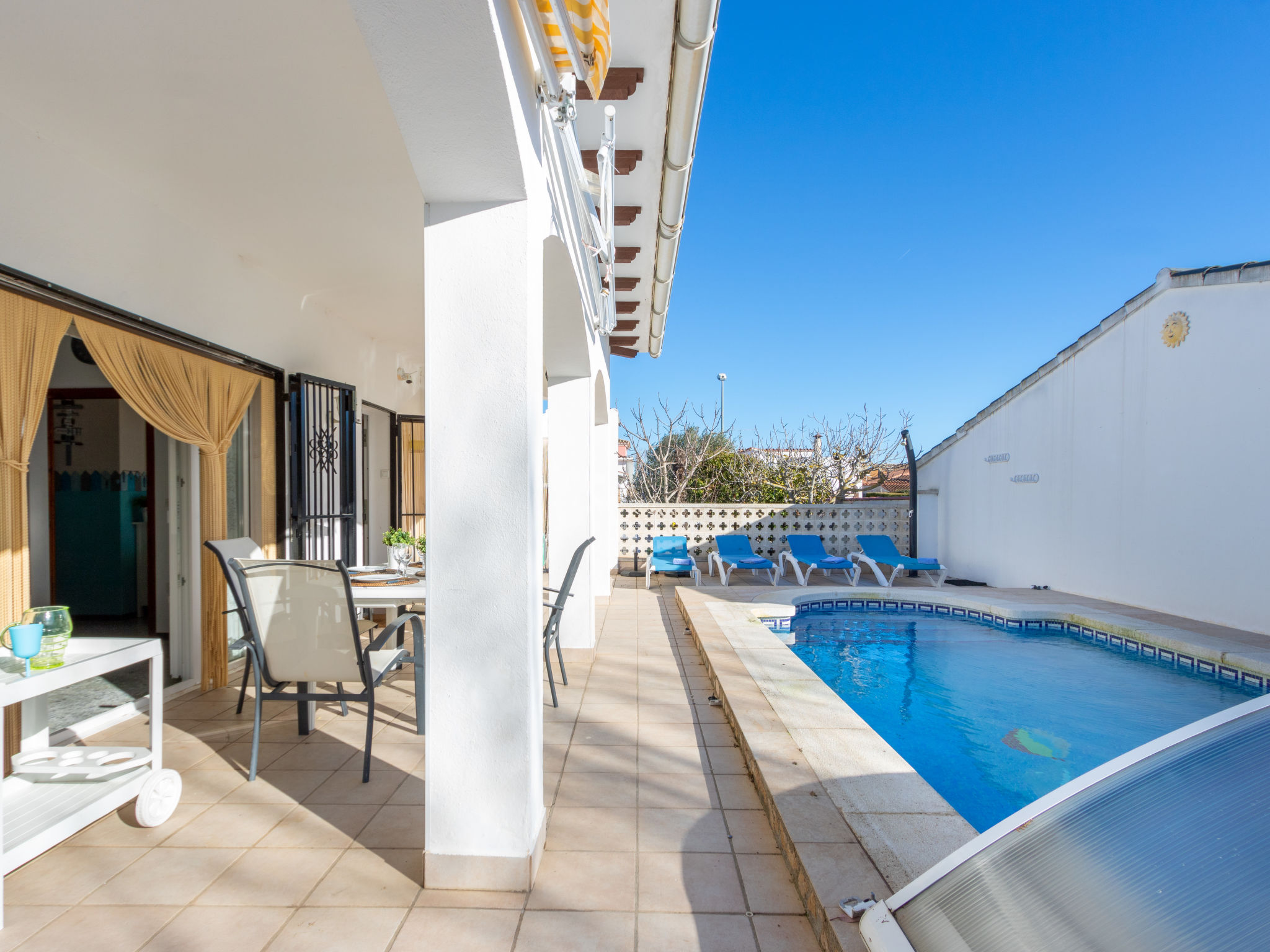 Masnou: Alleinstehendes, komfortables Einfamilienhaus "ERBANOZI". Im Ortsteil Mas Nou, 3 km vom Zentrum von Empuriabrava, sonnige Lage im Villenviertel, 4 km vom Meer, 1.3 km vom See, 4 km vom Strand, in einer Sackgasse, Richtung Süden. Zur Alleinbenutzung: Grundstück (eingezäunt), gepflegter Garten, Schwimmbad eckig (7 x 3 m, 140 - 190 cm tief, 10.04.-30.10.). Pergola, Terrasse, Gartenmöbel, Grill. Im Hause: Klimaanlage, Waschmaschine. Parkplatz beim Haus. Lebensmittelgeschäft, Supermarkt 400 m, Restaurant 1 km, Bar 1 km, Bäckerei 1 km, Bushaltestelle 500 m, Bahnstation "Figueres" 13 km, Sandstrand "Empuriabrava" 4 km. Sporthafen 4 km, Golfplatz (18 Loch) 12 km, Surfschule 3 km, Segelschule 3 km, Tennis 50 m, Minigolf 2.7 km, Sportzentrum 3 km, Wanderwege ab Haus 50 m, Radweg 100 m. Nahe gelegene Sehenswürdigkeiten: Centro de paracaidismo SKYDIVE 1.8 km, WINDOOR túnel del viento Empuriabrava 1.8 km, Parque acuático Roses 5 km, Festival y castillo de Peralada 12 km, Museo Dalí Figueres 21 km, Monasterio de Sant Pere de Rodes 23 km. Jugendgruppen nur auf Anfrage.