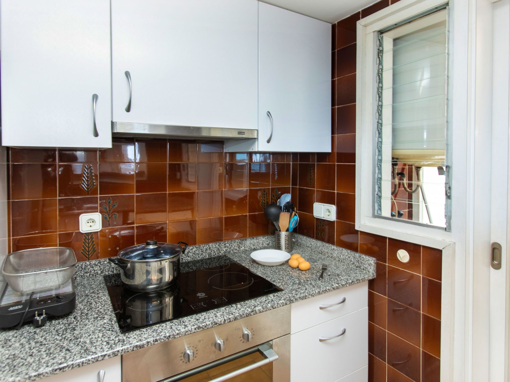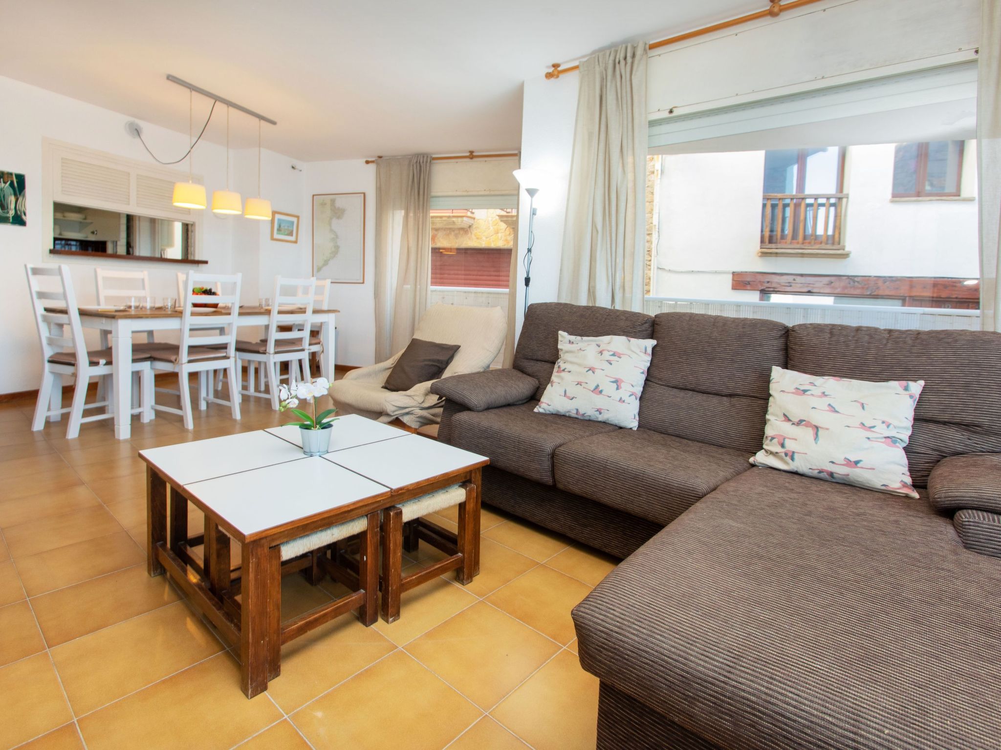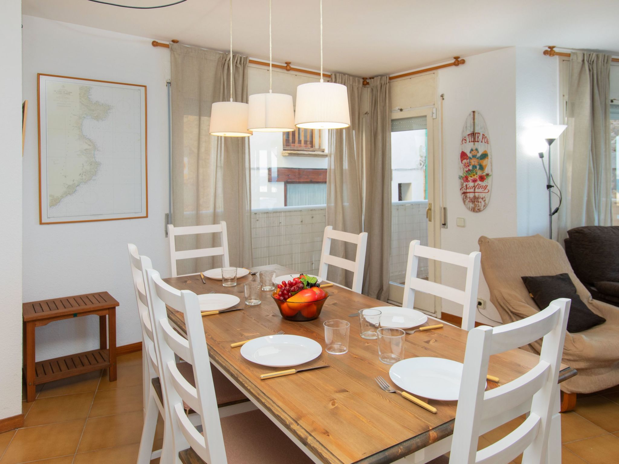 "El Cargol", 4-Zimmer-Wohnung 80 m2 im 1. Stock. Geräumig und hell, komfortabel eingerichtet: Eingang mit Esstisch. Wohn-/Esszimmer mit Digital-TV. Ausgang zur Terrasse. 1 Zimmer mit 1 franz. Bett (135 cm, Länge 190 cm). Ausgang zur Terrasse. 1 Zimmer mit 2 Betten (80 cm, Länge 190 cm). 1 Zimmer mit 1 Ausziehbett (2 Pers. 2 x 90 cm, Länge 190 cm). Küche (Backofen, 4 Glaskeramikherd Platten, Toaster, Wasserkocher, Mikrowelle, elektrische Kaffeemaschine) mit Durchreiche. Ausgang zur Veranda. 2 Bäder/Bidet/WC. Boiler (50 Liter). Balkon 5 m2, Terrasse 8 m2, überdacht. Balkonmöbel. Herrliche Sicht auf das Meer. Zur Verfügung: Waschmaschine, Bügeleisen, Haartrockner. Bitte beachten: Nichtraucher-Unterkunft. TV nur ES. HUTG013565