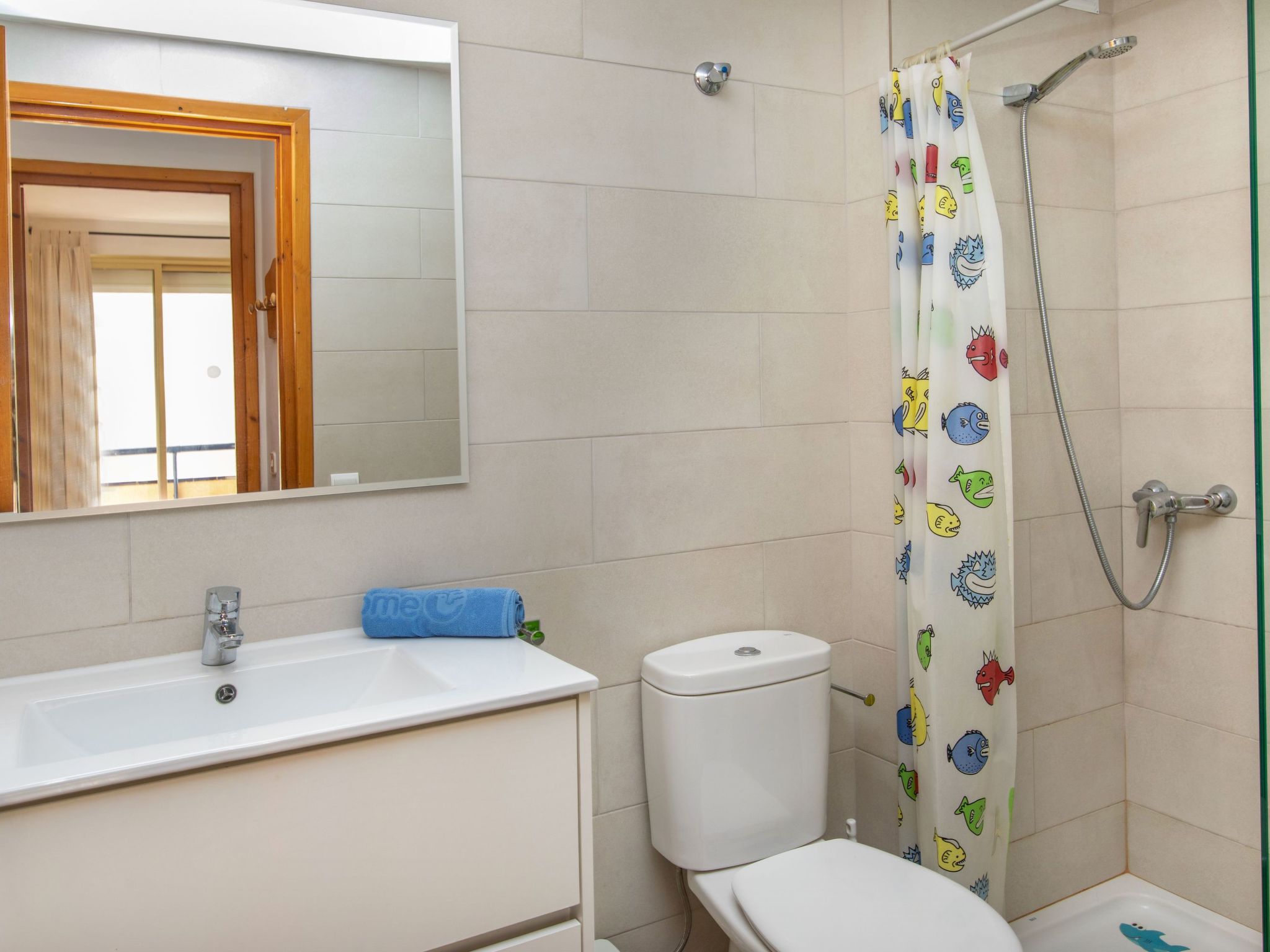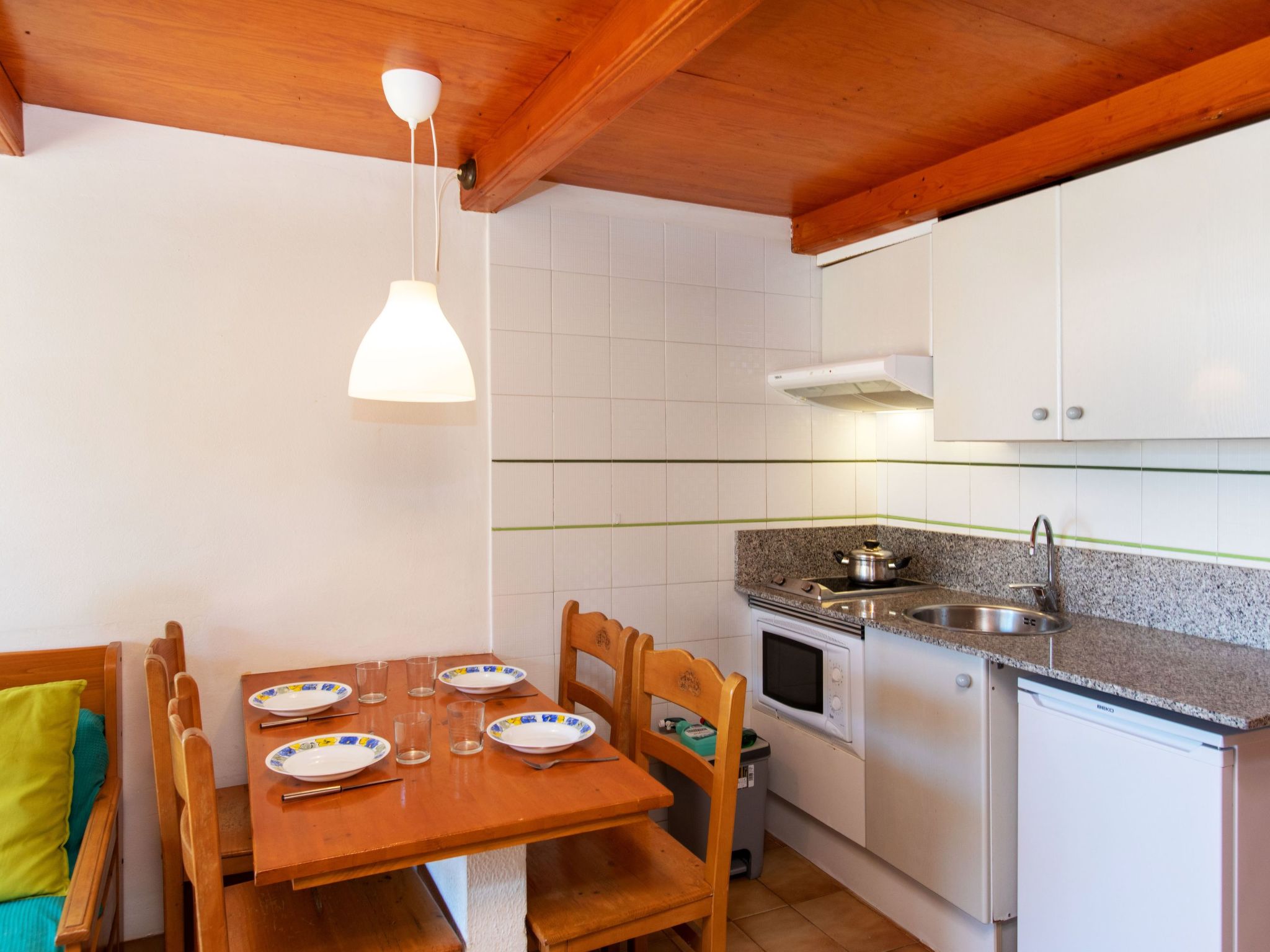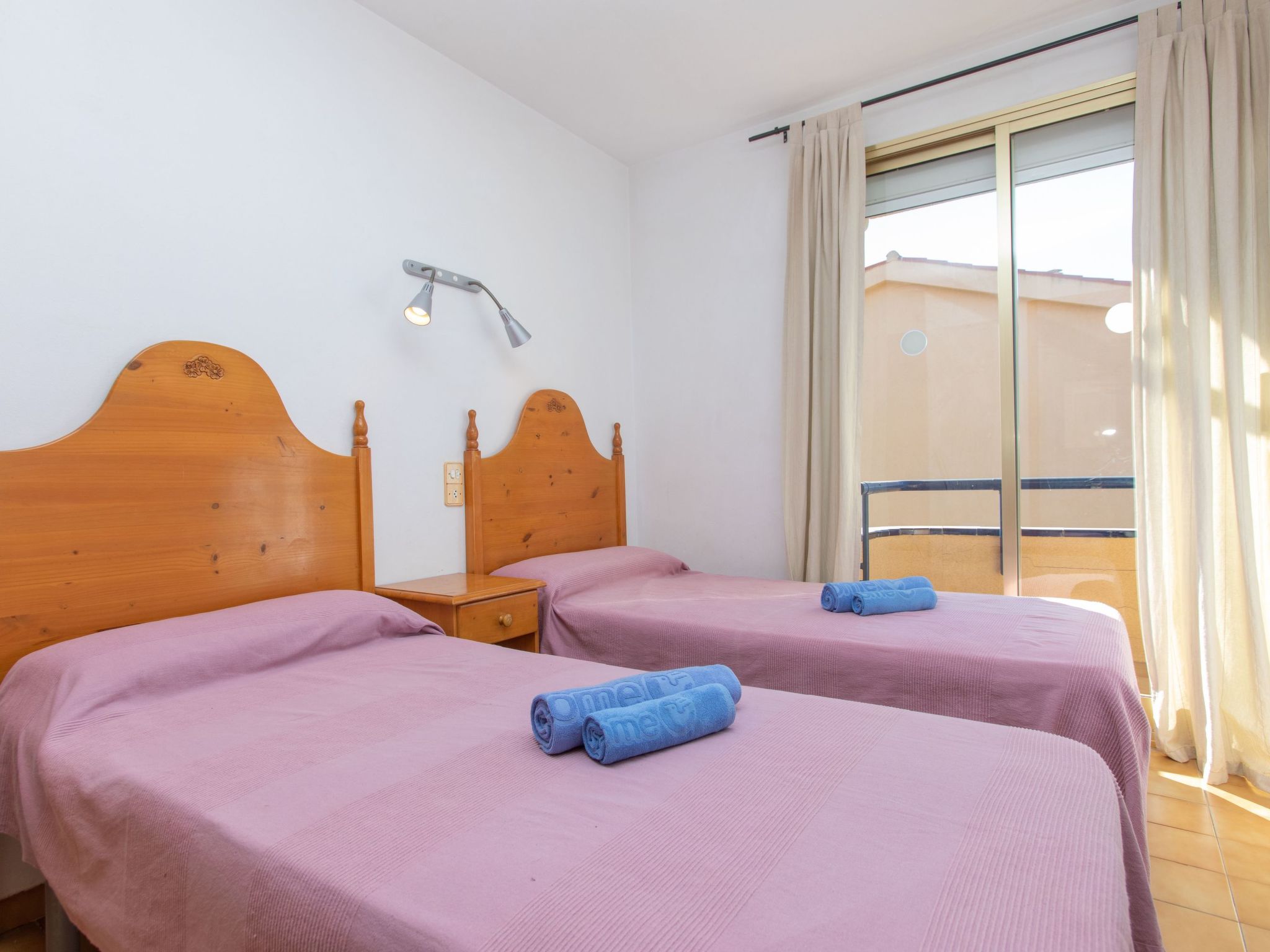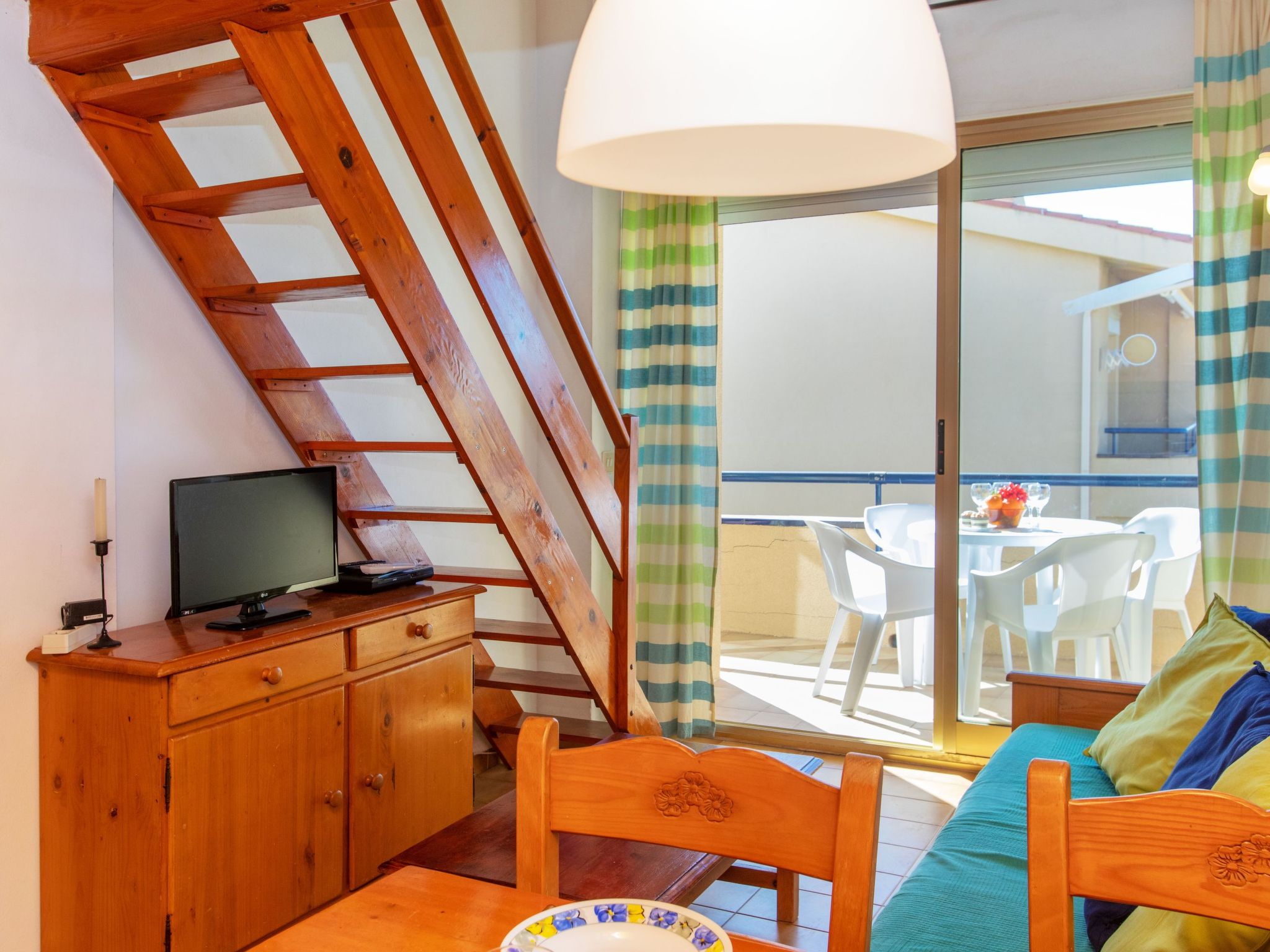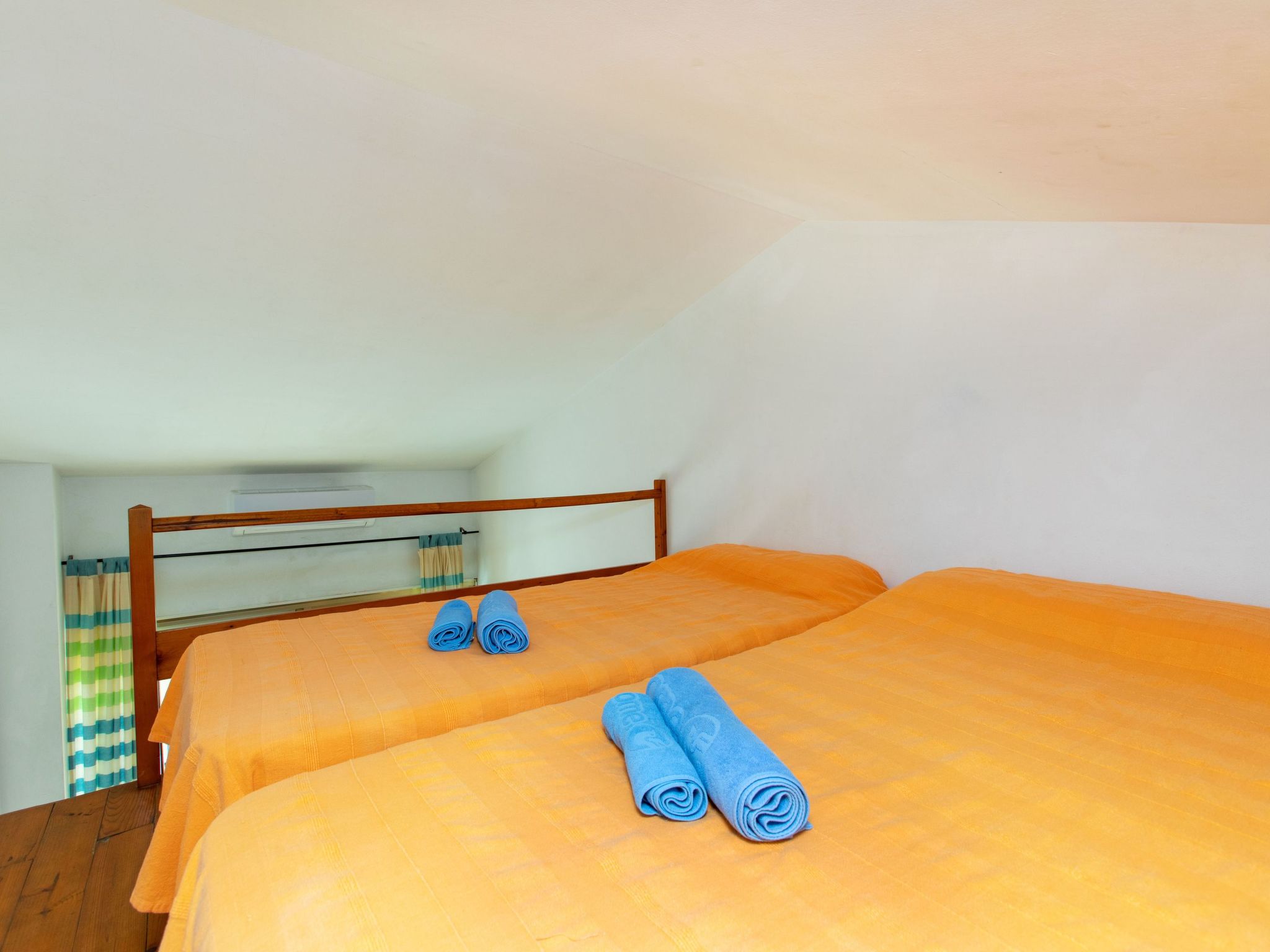 2-Zimmer-Wohnung 34 m2 im 2. Stock. Wohn-/Esszimmer mit 1 Diwanbett, Esstisch, Digital-TV, Flachbildschirm, DVD, Klimaanlage und Warmluftheizung. Ausgang zur Terrasse. 1 Zimmer mit 2 Betten (90 cm, Länge 190 cm). Ausgang zur Terrasse. Kochnische (2 Glaskeramikherd Platten, Toaster, Wasserkocher, Mikrowelle, elektrische Kaffeemaschine). Dusche/WC. Boiler (50 Liter). Obergeschoss: (steile Treppe) abgeschrägte, offene Galerie, Deckenhöhe 130 - 180 cm mit 2 Betten (90 cm, Länge 190 cm). Terrassenmöbel. Sicht auf das Schwimmbad und den Garten. Zur Verfügung: Waschmaschine, Bügeleisen, Haartrockner. Internet (Wireless LAN, gratis). Bitte beachten: TV nur ES. Kein Fahrstuhl. HUTG006008
