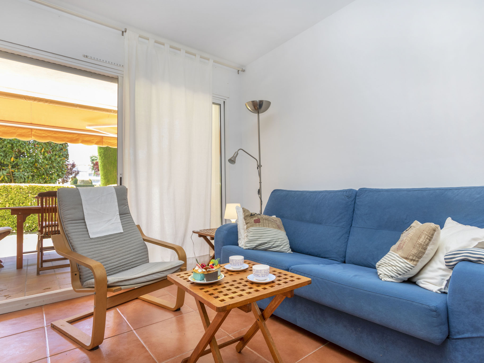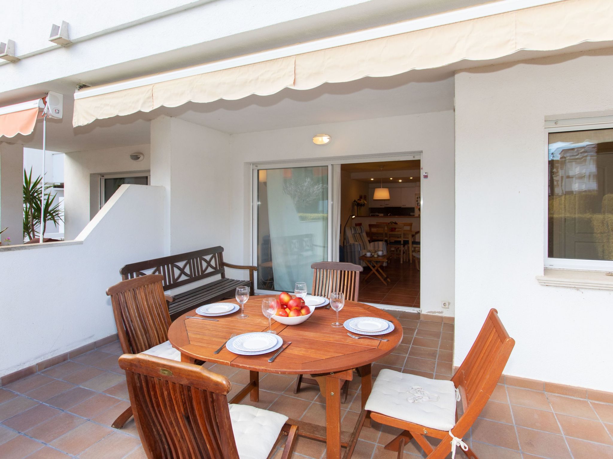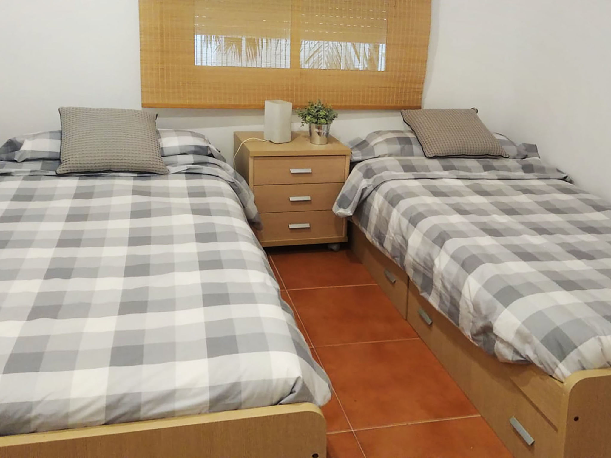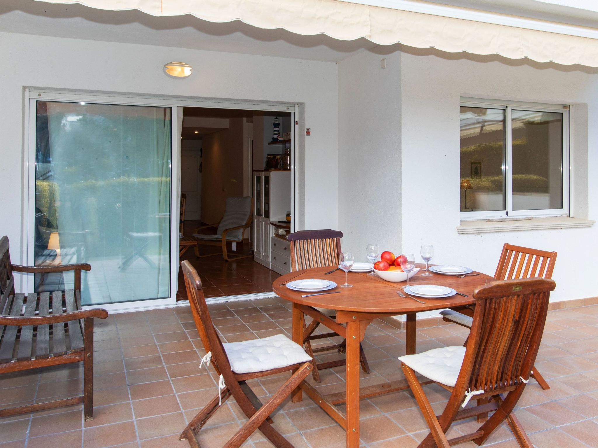 "Green Mar B", 4-Zimmer-Wohnung 90 m2. Zweckmässig eingerichtet: Wohn-/Esszimmer mit Digital-TV. Ausgang zur Terrasse. 1 Zimmer mit 2 Betten (90 cm, Länge 190 cm). Ausgang zur Terrasse. 1 Zimmer mit 1 franz. Bett (135 cm, Länge 190 cm). Offene Küche (Backofen, Geschirrspüler, 3 Glaskeramikherd Platten, Mikrowelle, elektrische Kaffeemaschine). Bad/Bidet/WC. Boiler (150 Liter). Grosser Gartensitzplatz. Terrassenmöbel, Loggia. Sicht auf das Schwimmbad und den Garten. Zur Verfügung: Waschmaschine, Bügeleisen, Kinderhochstuhl, Babybett, Haartrockner. Internet (Wireless LAN, gratis). Parkplatz Nr. B103. Bitte beachten: TV nur ES. IDWJ97V2SRB