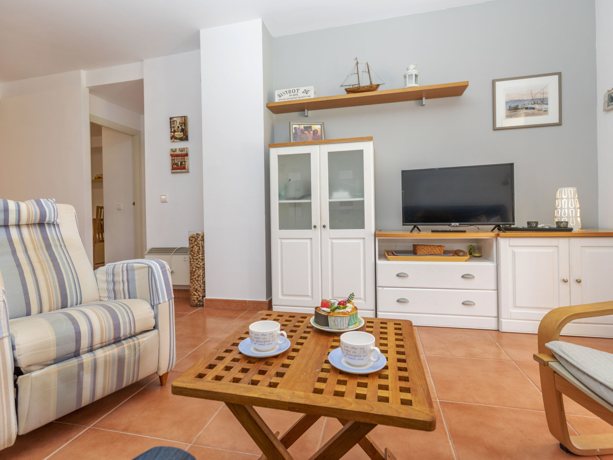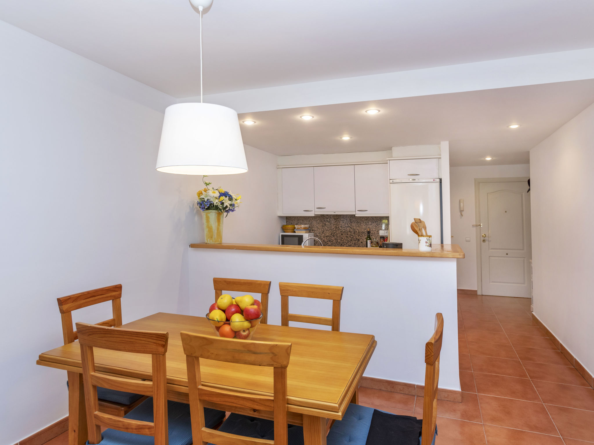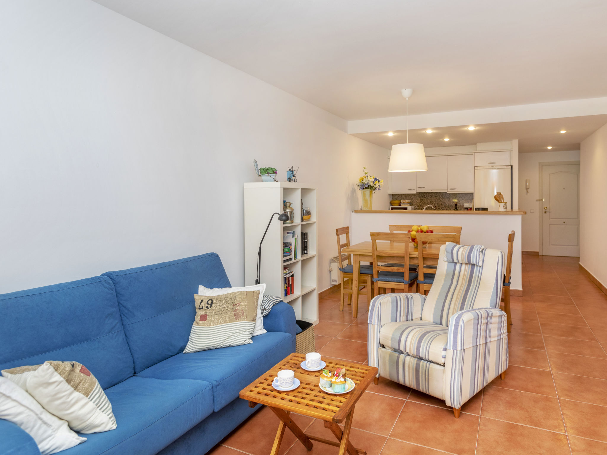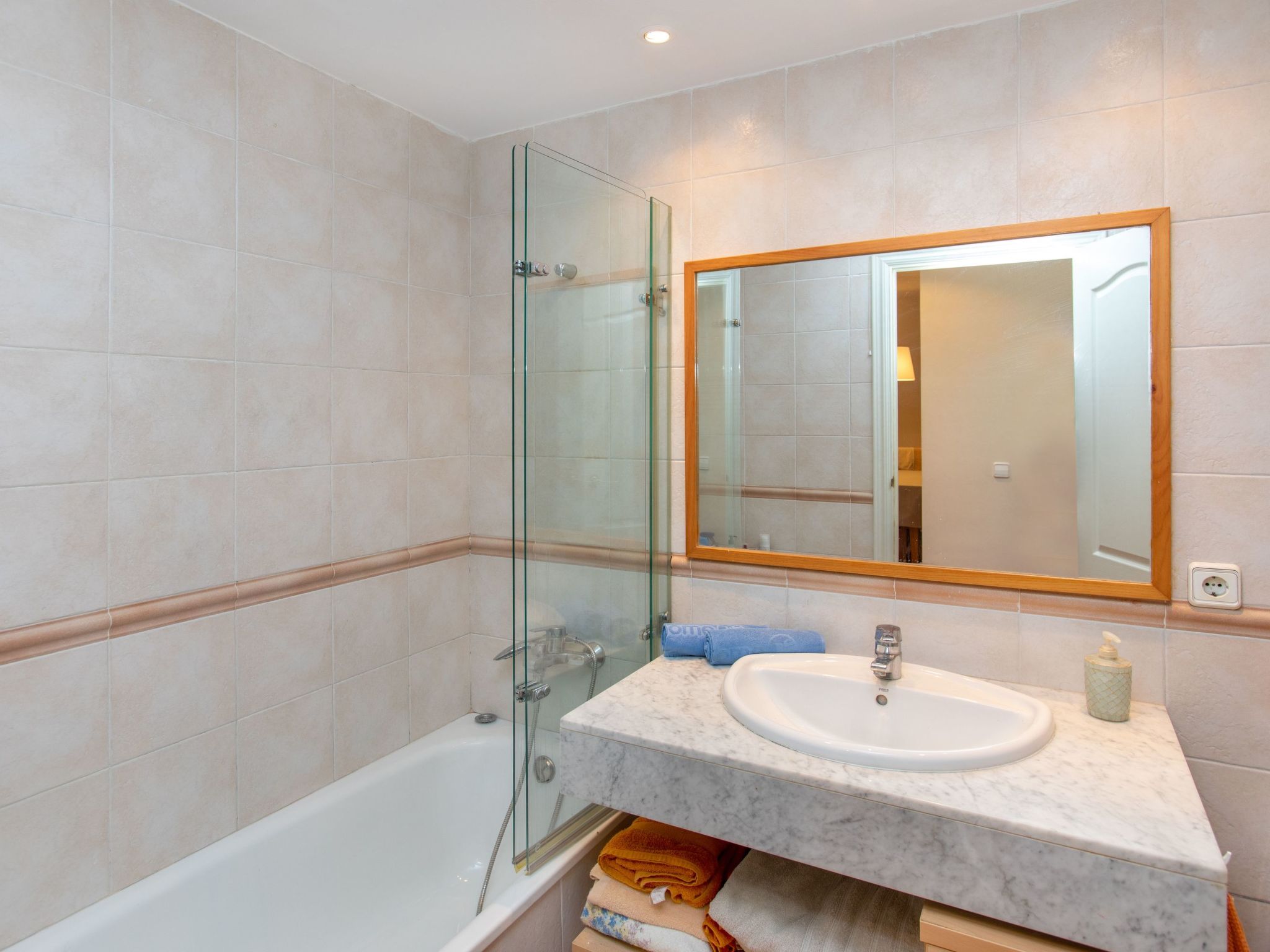 "Green Mar B", 4-Zimmer-Wohnung 90 m2. Zweckmässig eingerichtet: Wohn-/Esszimmer mit Digital-TV. Ausgang zur Terrasse. 1 Zimmer mit 2 Betten (90 cm, Länge 190 cm). Ausgang zur Terrasse. 1 Zimmer mit 1 franz. Bett (135 cm, Länge 190 cm). Offene Küche (Backofen, Geschirrspüler, 3 Glaskeramikherd Platten, Mikrowelle, elektrische Kaffeemaschine). Bad/Bidet/WC. Boiler (150 Liter). Grosser Gartensitzplatz. Terrassenmöbel, Loggia. Sicht auf das Schwimmbad und den Garten. Zur Verfügung: Waschmaschine, Bügeleisen, Kinderhochstuhl, Babybett, Haartrockner. Internet (Wireless LAN, gratis). Parkplatz Nr. B103. Bitte beachten: TV nur ES. IDWJ97V2SRB