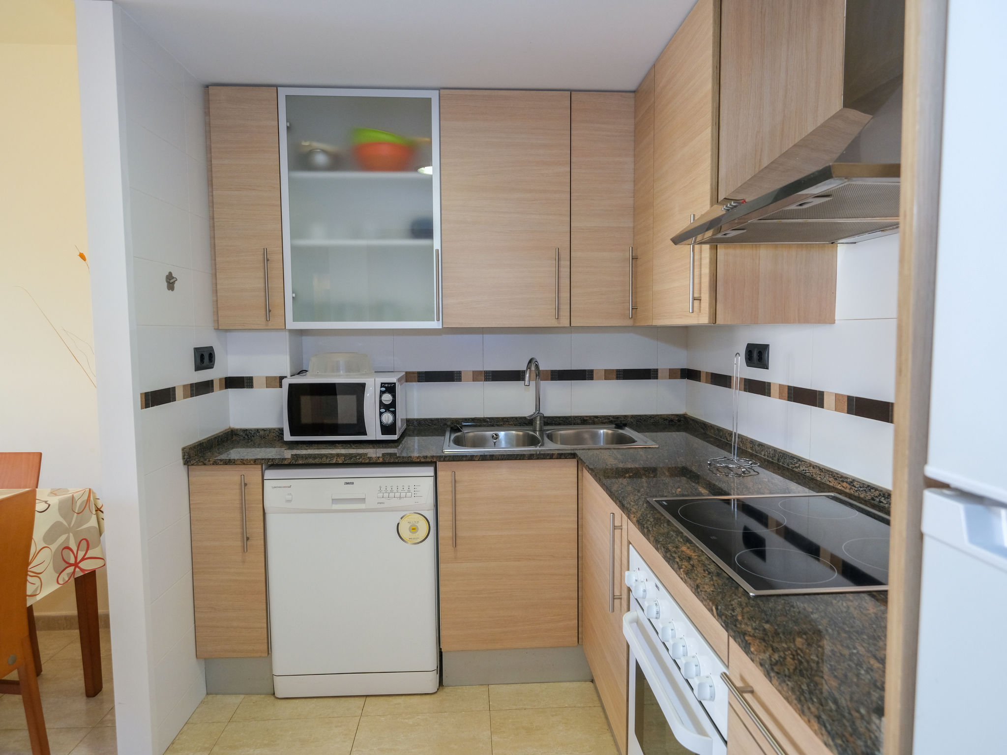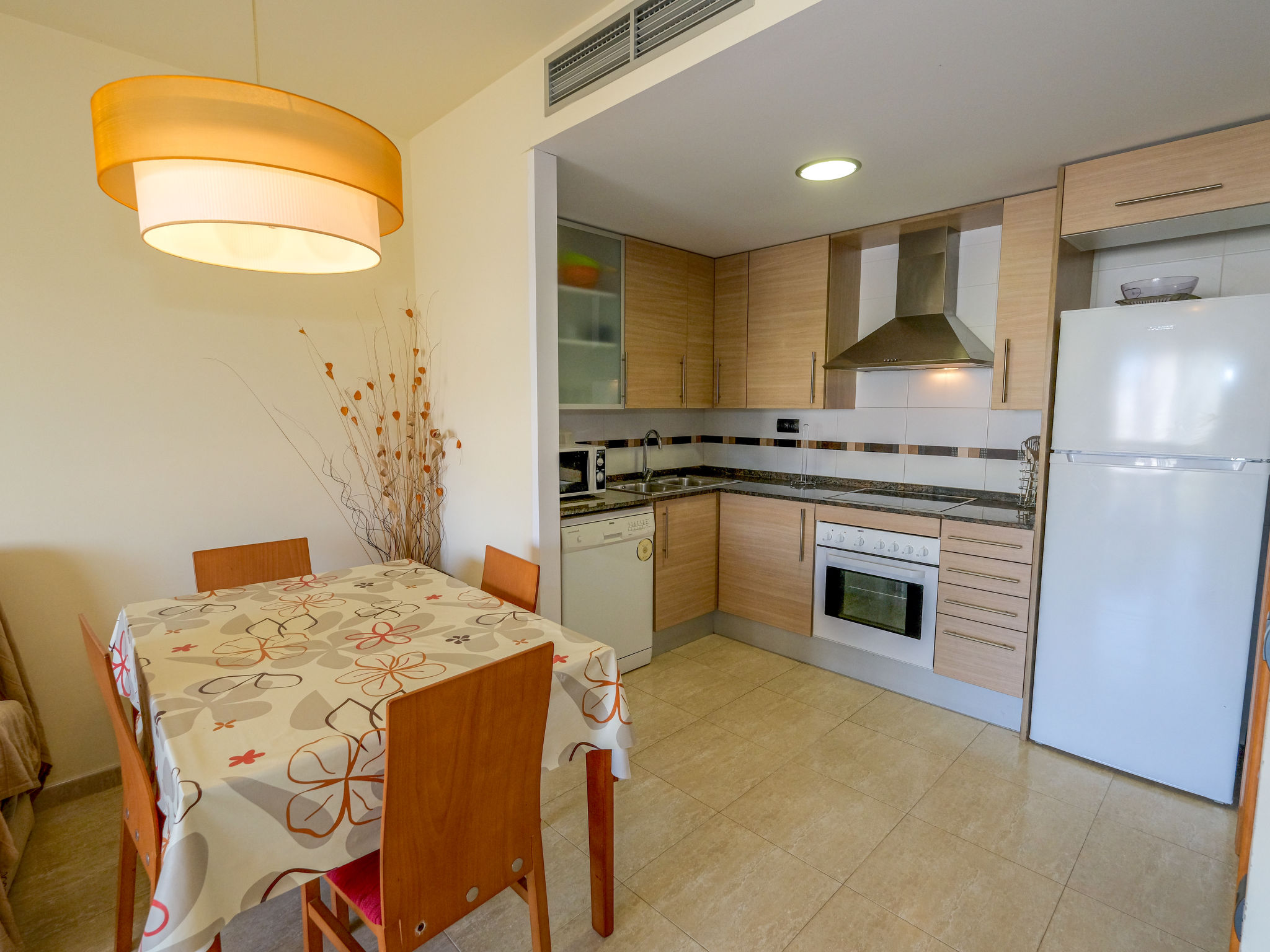 "Apartamentos Golden Beach", 2-Zimmer-Wohnung 68 m2. Komfortabel eingerichtet: Wohn-/Esszimmer mit 1 Diwanbett (110 cm), Esstisch und Digital-TV. Ausgang zum Balkon. 1 Zimmer mit 2 Betten (190 cm, Länge 90 cm). Ausgang zum Balkon. Offene Küche (Geschirrspüler, 4 Glaskeramikherd Platten, Toaster, Wasserkocher, Mikrowelle, elektrische Kaffeemaschine). Bad/Bidet/WC. Klimaanlage. Terrasse. Seitliche Sicht auf das Meer. Zur Verfügung: Waschmaschine, Bügeleisen. HUTTE001052