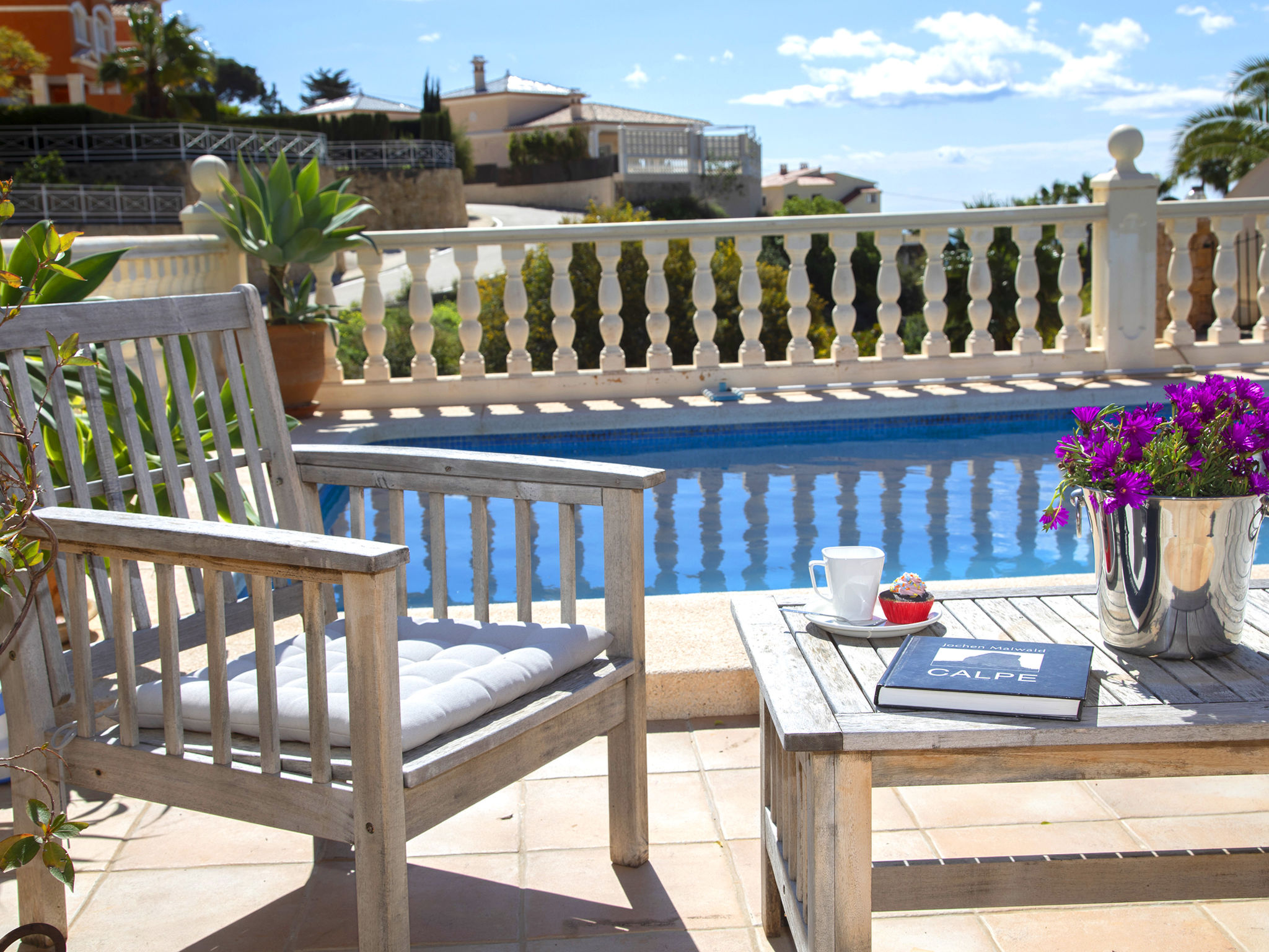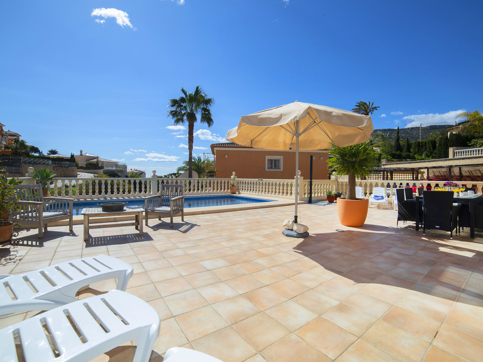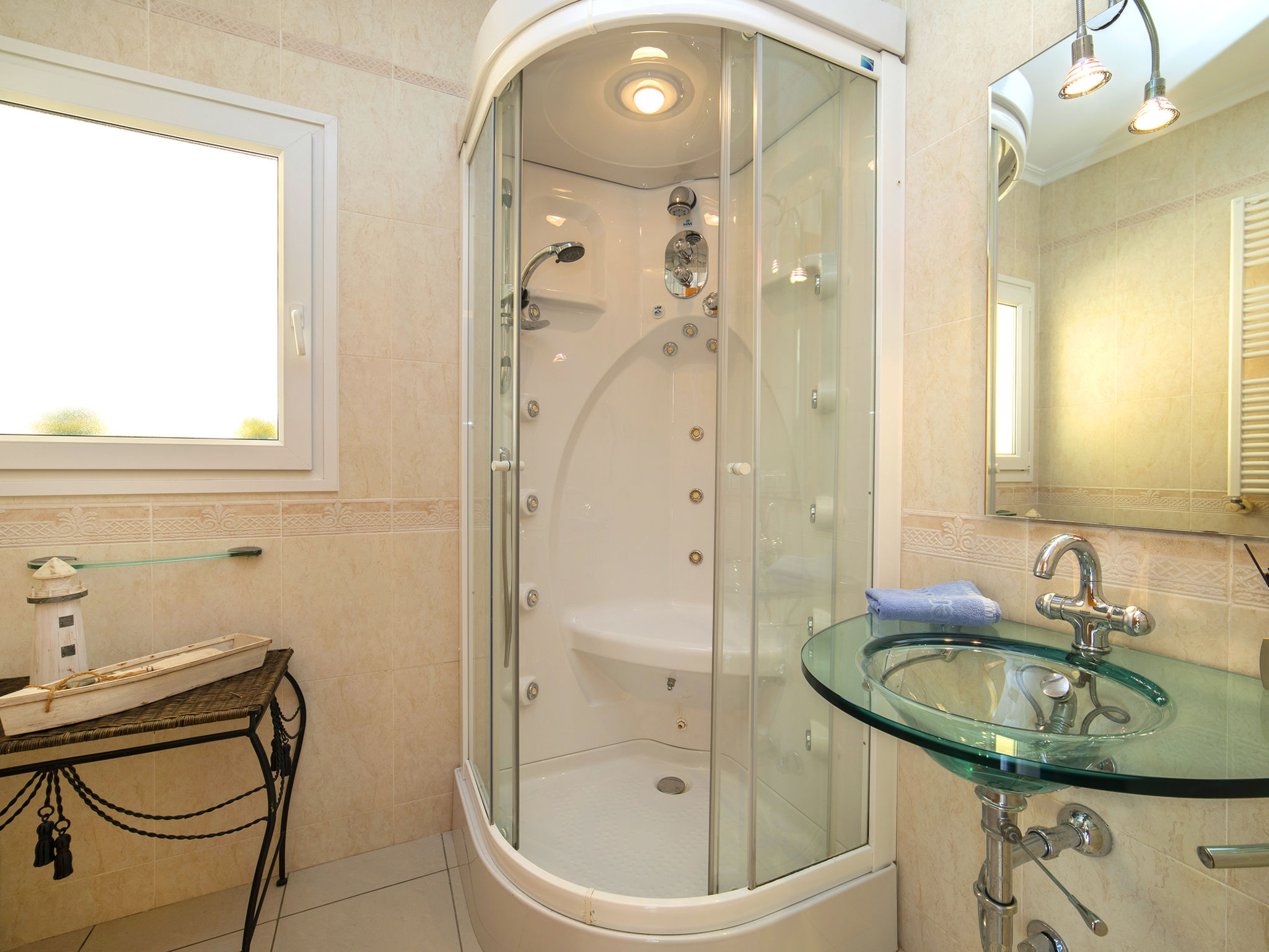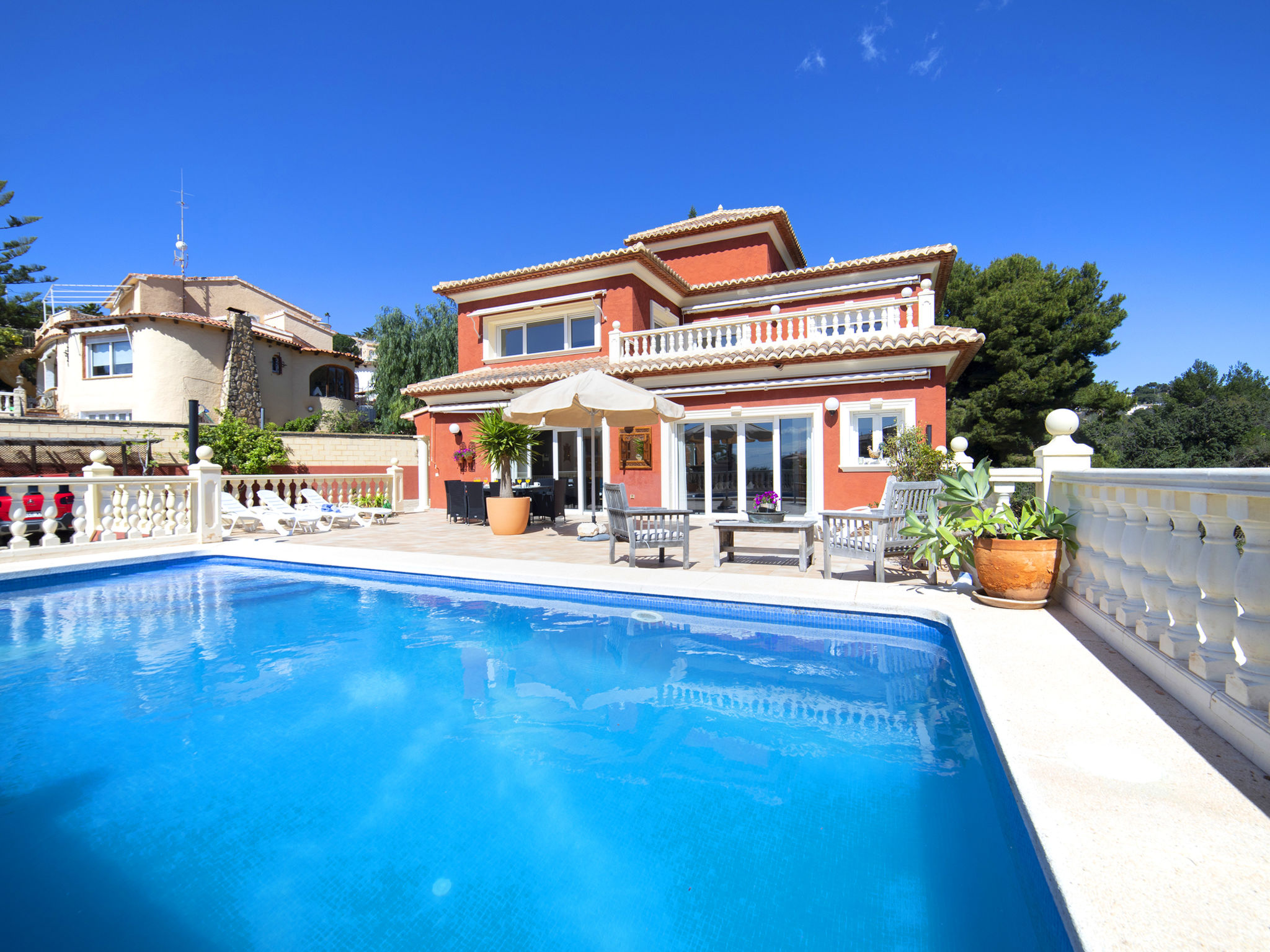 "Fleur", 7-Zimmer-Haus 224 m2 auf 2 Stockwerken. Hell, komfortabel und schön eingerichtet: Wohn-/Esszimmer 30 m2 mit Sat-TV, Digital-TV und Klimaanlage. Ausgang zur Terrasse. 1 Zimmer mit 1 franz. Bett (135 cm, Länge 190 cm), Dusche/WC, Hydromassage-Dusche und Klimaanlage. 2 Zimmer, jedes Zimmer mit 1 franz. Bett (150 cm, Länge 190 cm), Klimaanlage. Küche (Backofen, Geschirrspüler, 4 Glaskeramikherd Platten, Toaster, Wasserkocher, Mikrowelle, Tiefkühler, elektrische Kaffeemaschine). Dusche/WC. Heizung. Obergeschoss: (Aussentreppe) Wohn-/Esszimmer 25 m2 mit Sat-TV, Digital-TV und Klimaanlage. Ausgang zur Terrasse. 1 Zimmer mit 1 franz. Bett (135 cm, Länge 190 cm), Klimaanlage. Ausgang zur Terrasse. 1 Zimmer mit 1 Doppelbett (2 x 80 cm, Länge 190 cm), Klimaanlage. Ausgang zur Terrasse. Offene Küche (Backofen, 4 Glaskeramikherd Platten, Toaster, Wasserkocher, Mikrowelle, Tiefkühler, elektrische Kaffeemaschine). Dusche/WC. Heizung. Grosse Terrasse. Terrassenmöbel, Gartengrill, Liegestühle (10). Zur Verfügung: Waschmaschine, Wäschetrockner, Bügeleisen, Kinderhochstuhl, Babybett bis 2 Jahre, Haartrockner. Internet (Wireless LAN, gratis). Parkplatz beim Haus. R000000001