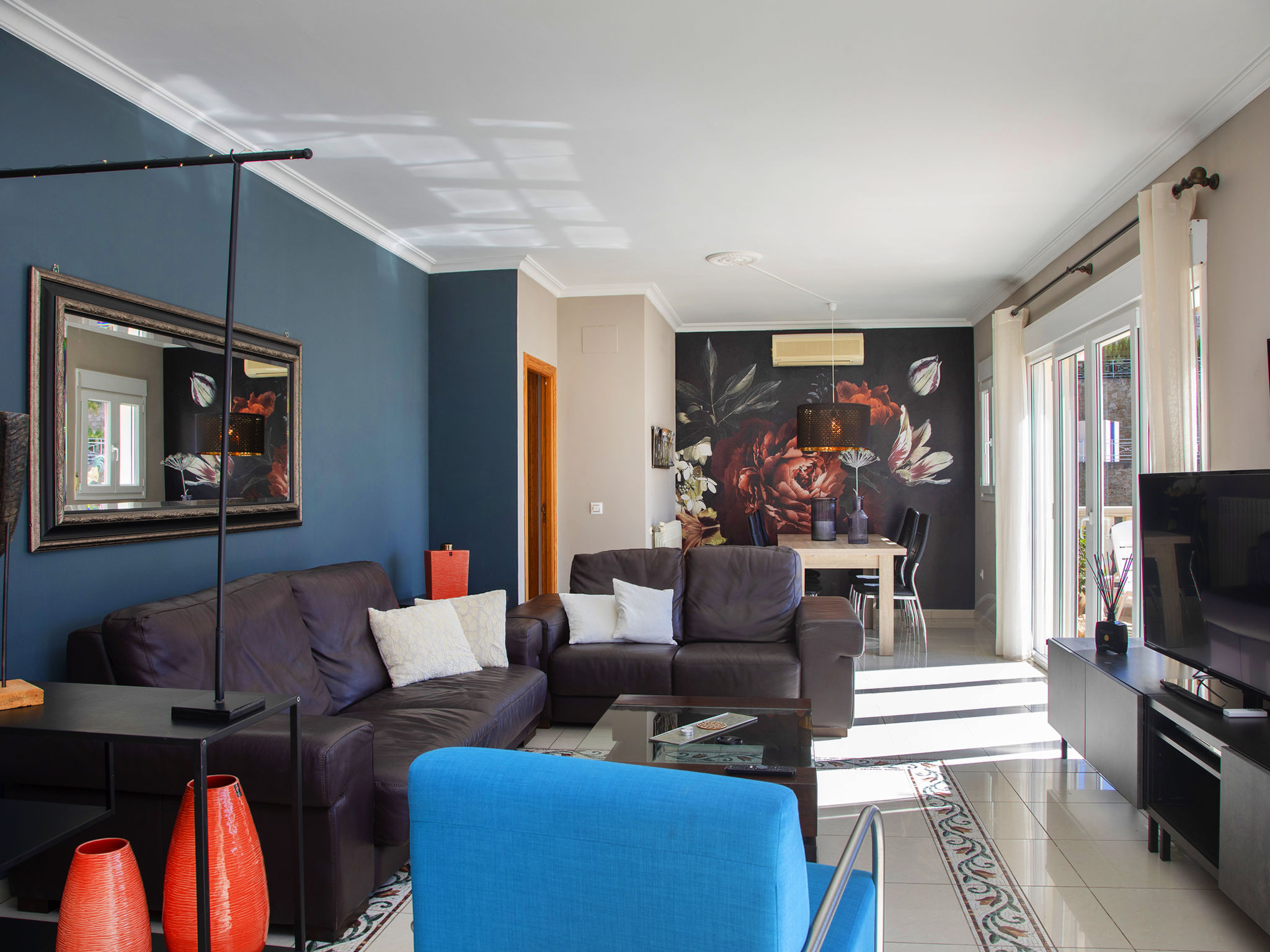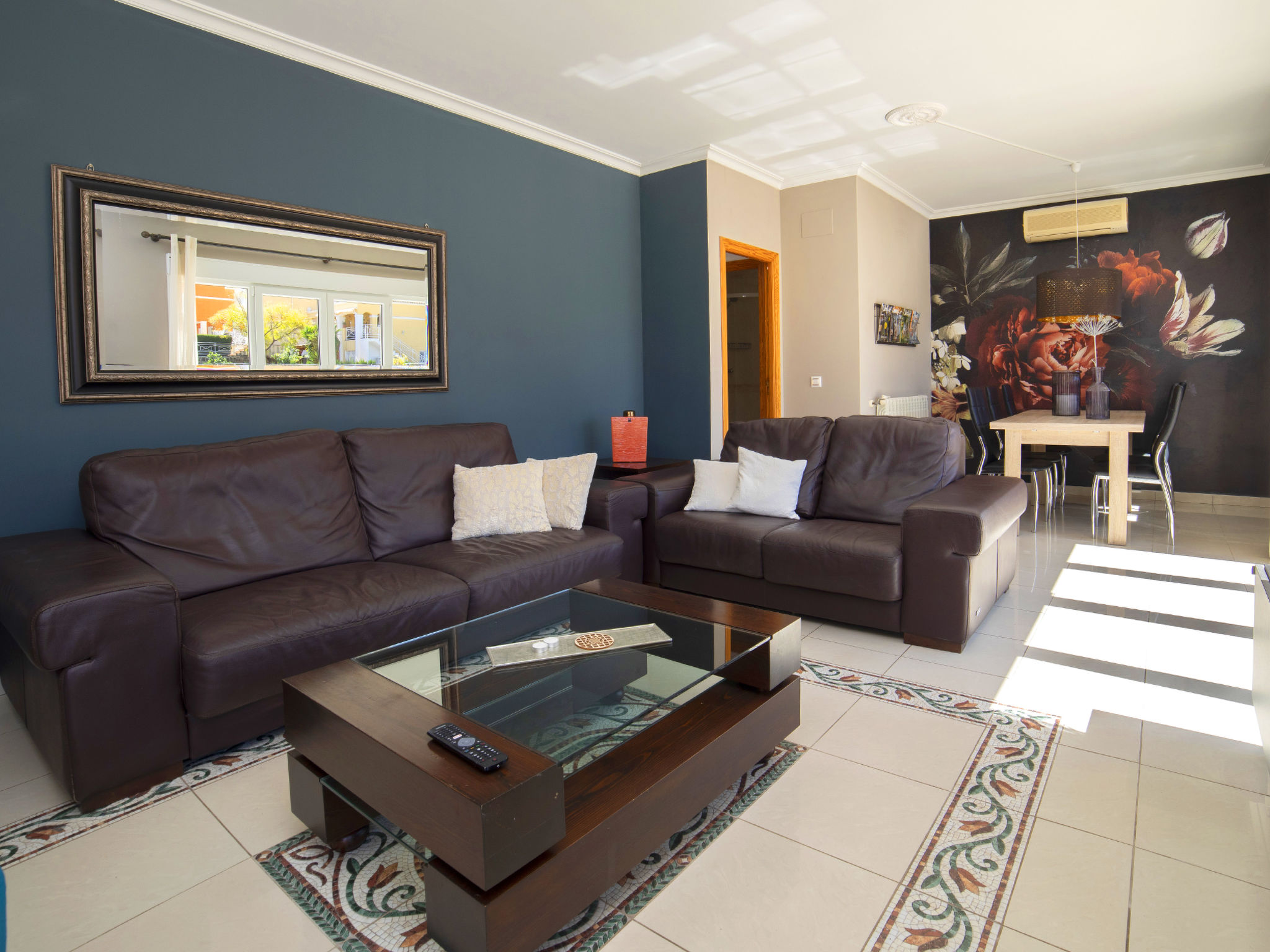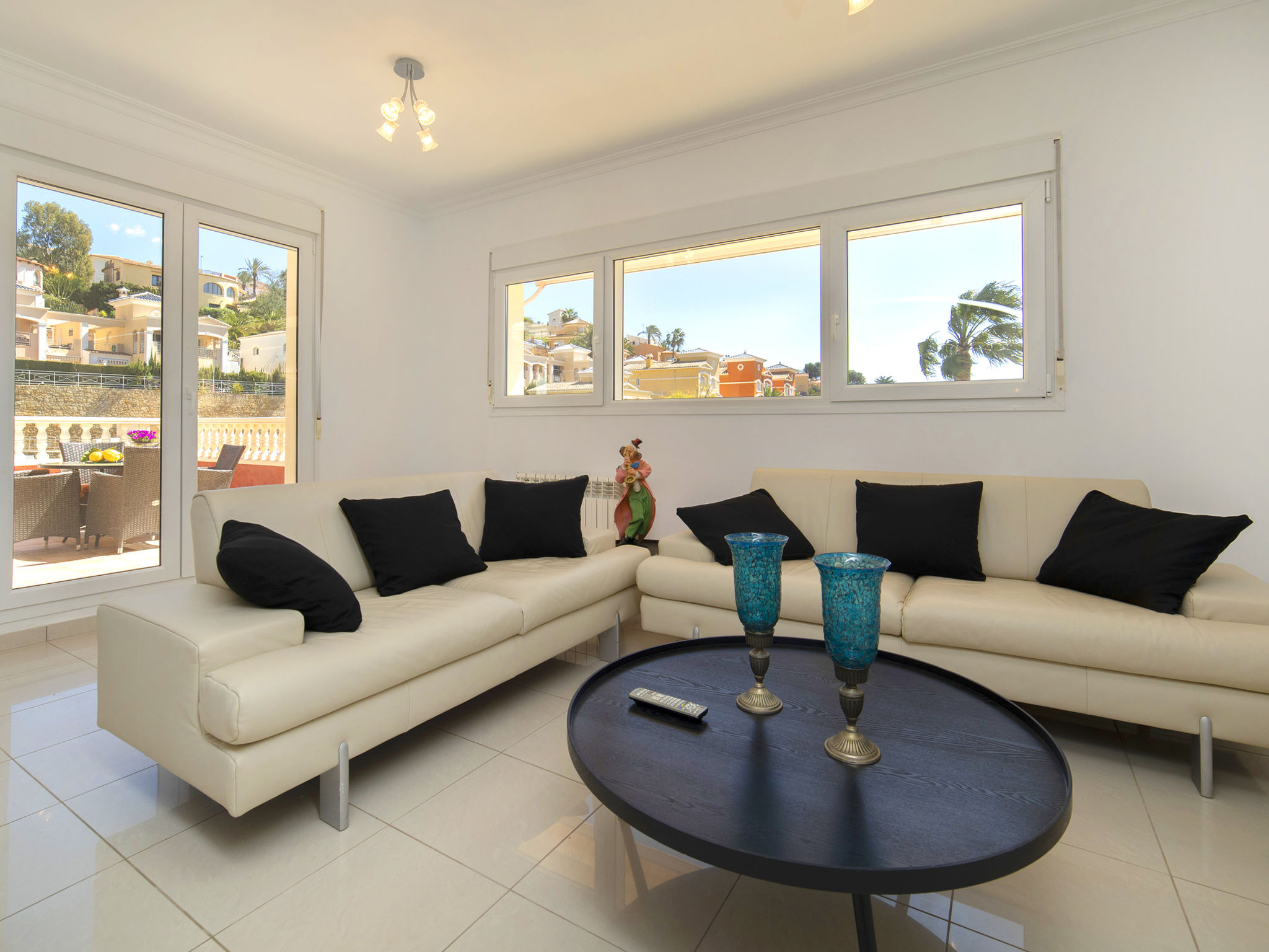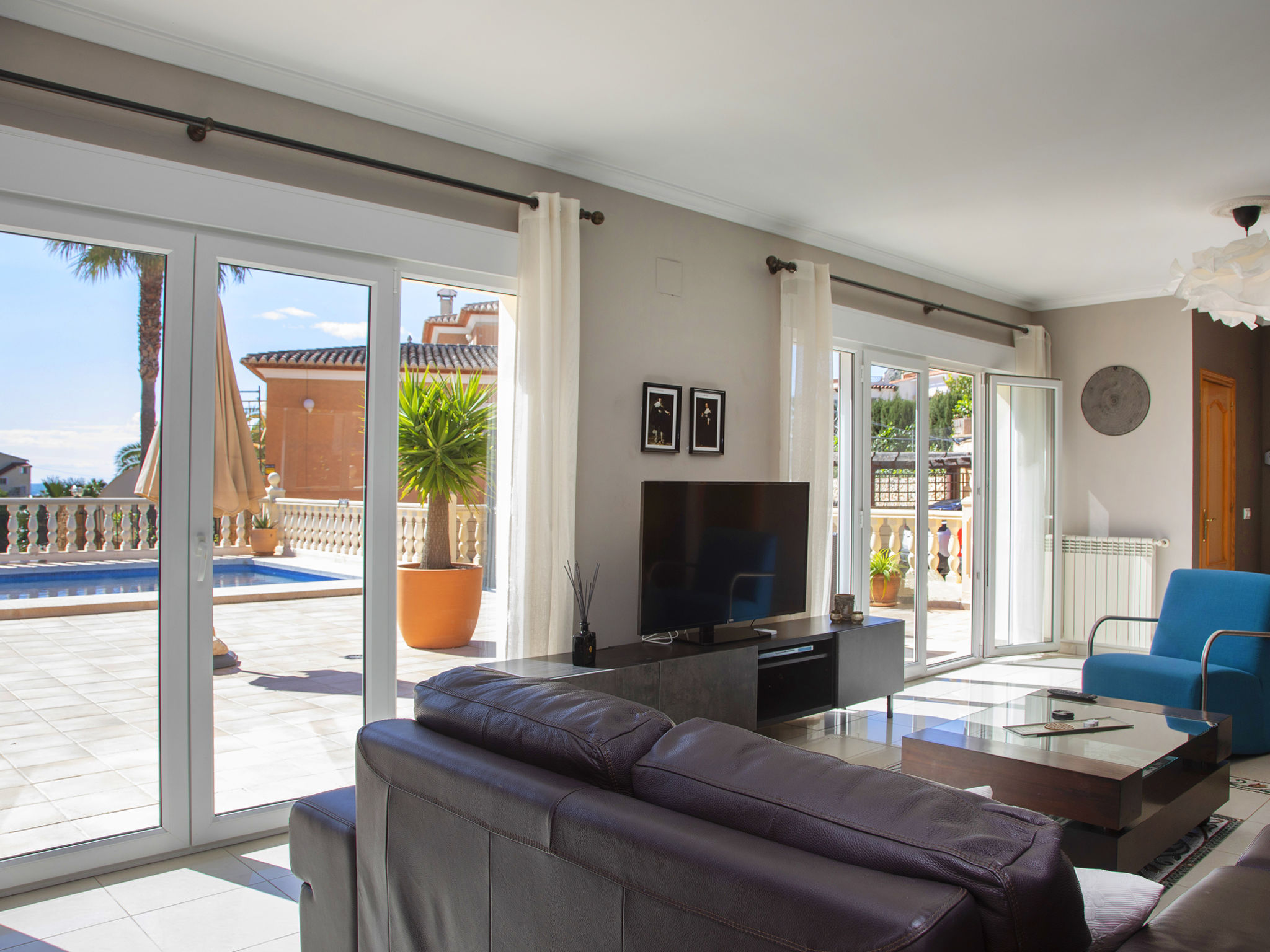 "Fleur", 7-Zimmer-Haus 224 m2 auf 2 Stockwerken. Hell, komfortabel und schön eingerichtet: Wohn-/Esszimmer 30 m2 mit Sat-TV, Digital-TV und Klimaanlage. Ausgang zur Terrasse. 1 Zimmer mit 1 franz. Bett (135 cm, Länge 190 cm), Dusche/WC, Hydromassage-Dusche und Klimaanlage. 2 Zimmer, jedes Zimmer mit 1 franz. Bett (150 cm, Länge 190 cm), Klimaanlage. Küche (Backofen, Geschirrspüler, 4 Glaskeramikherd Platten, Toaster, Wasserkocher, Mikrowelle, Tiefkühler, elektrische Kaffeemaschine). Dusche/WC. Heizung. Obergeschoss: (Aussentreppe) Wohn-/Esszimmer 25 m2 mit Sat-TV, Digital-TV und Klimaanlage. Ausgang zur Terrasse. 1 Zimmer mit 1 franz. Bett (135 cm, Länge 190 cm), Klimaanlage. Ausgang zur Terrasse. 1 Zimmer mit 1 Doppelbett (2 x 80 cm, Länge 190 cm), Klimaanlage. Ausgang zur Terrasse. Offene Küche (Backofen, 4 Glaskeramikherd Platten, Toaster, Wasserkocher, Mikrowelle, Tiefkühler, elektrische Kaffeemaschine). Dusche/WC. Heizung. Grosse Terrasse. Terrassenmöbel, Gartengrill, Liegestühle (10). Zur Verfügung: Waschmaschine, Wäschetrockner, Bügeleisen, Kinderhochstuhl, Babybett bis 2 Jahre, Haartrockner. Internet (Wireless LAN, gratis). Parkplatz beim Haus. R000000001