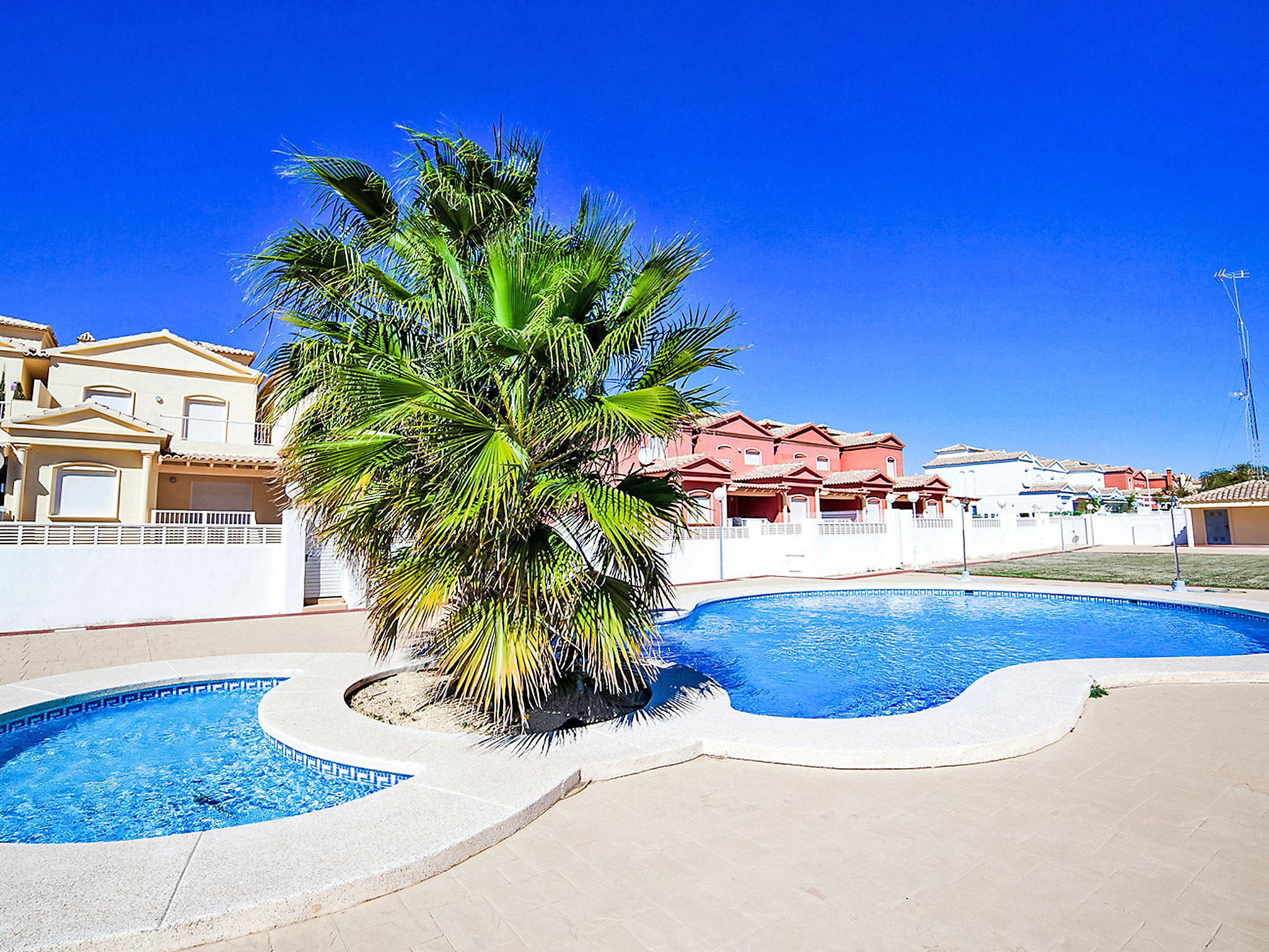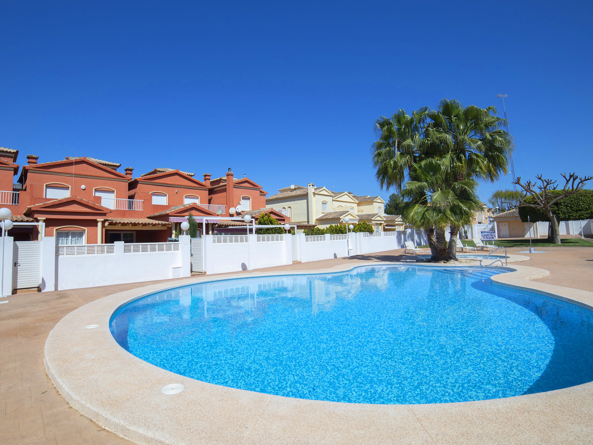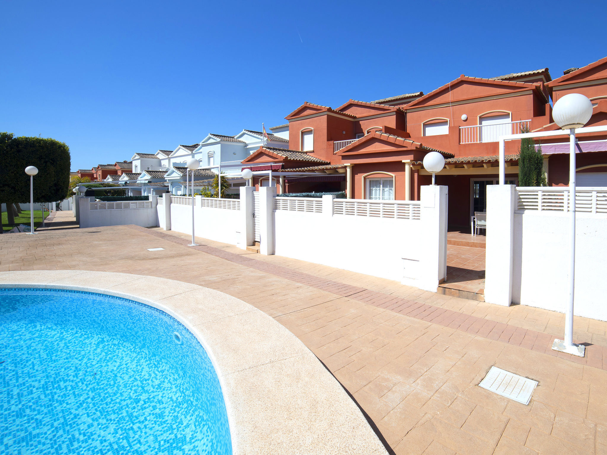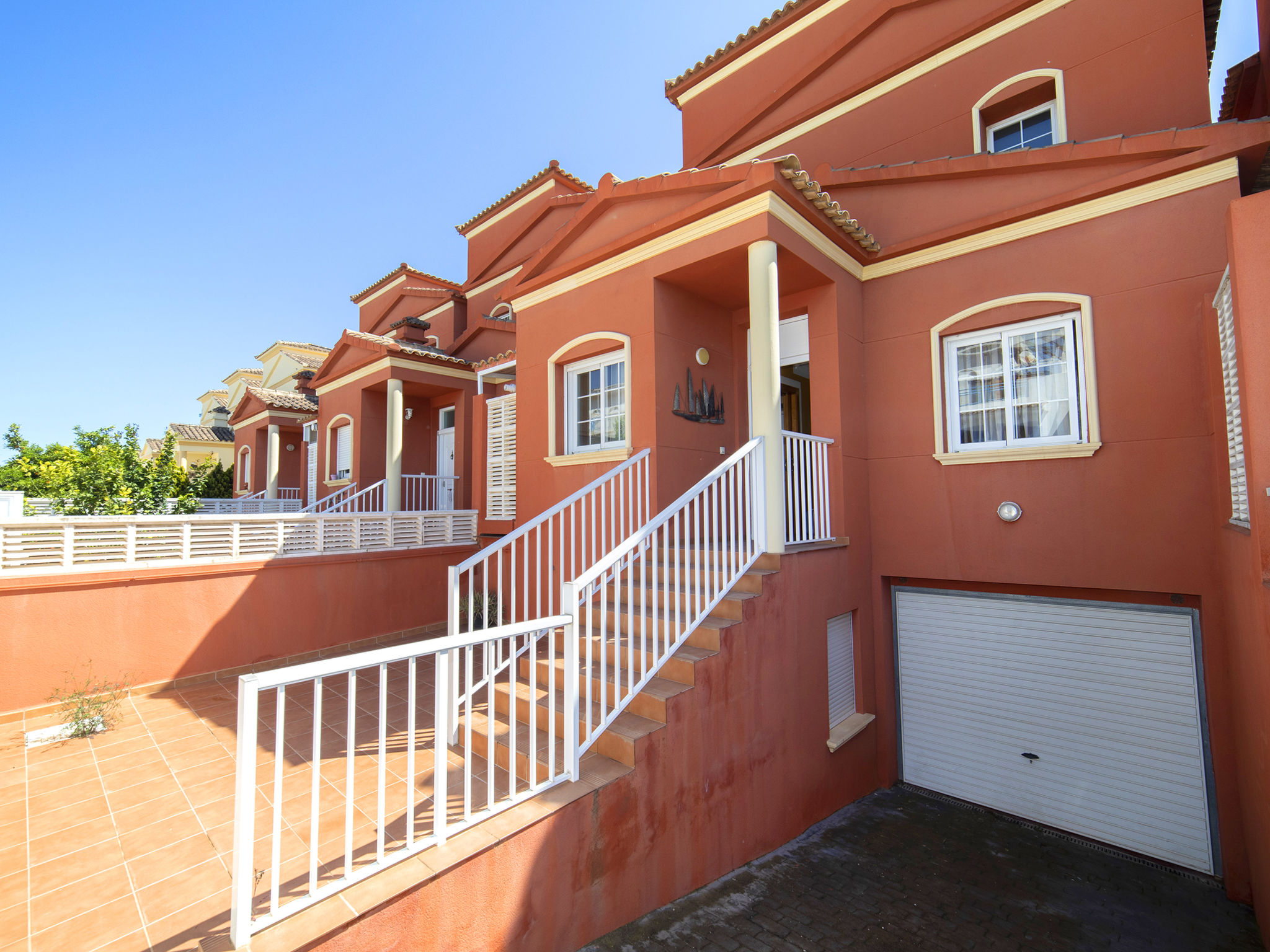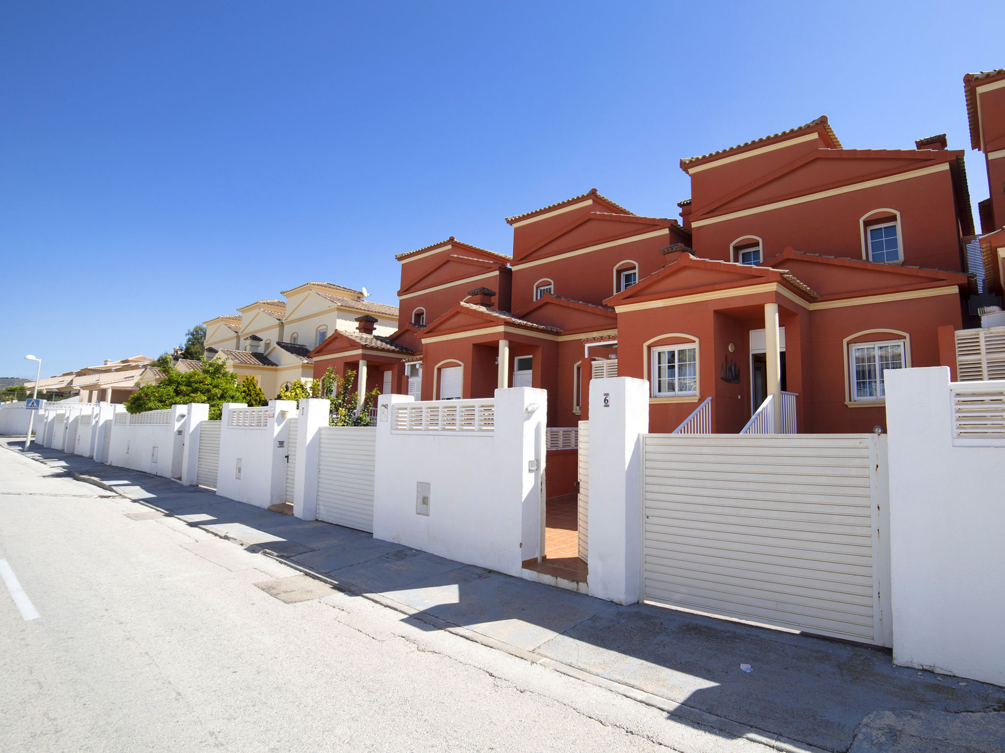 "Jazmines VI", 5-Zimmer-Reihenhaus 214 m2 auf 3 Stockwerken. Geräumig und hell, zweckmässig und komfortabel eingerichtet: offenes Wohn-/Esszimmer mit Sat-TV, Digital-TV, Klimaanlage und Warmluftheizung. Ausgang zur Terrasse. 1 Zimmer mit 1 franz. Bett (150 cm, Länge 200 cm), Dusche/Bidet/WC, Klimaanlage und Warmluftheizung. 1 Zimmer mit 2 Betten (90 cm, Länge 190 cm), Klimaanlage und Warmluftheizung. Küche (Backofen, Geschirrspüler, Toaster, Wasserkocher, Mikrowelle, elektrische Kaffeemaschine). Dusche/WC. Obergeschoss: 1 Zimmer mit 1 franz. Bett (135 cm, Länge 190 cm), Klimaanlage und Warmluftheizung. Ausgang zur Terrasse. 1 Zimmer mit 2 Betten (90 cm, Länge 190 cm), Klimaanlage und Warmluftheizung. Ausgang zur Terrasse. Bad/WC. Grosse Terrasse. Terrassenmöbel, Gartengrill. Zur Verfügung: Waschmaschine, Bügeleisen, Kinderhochstuhl, Babybett bis 2 Jahre, Haartrockner. Garage (2 Autos). Geeignet für Familien. R000000001