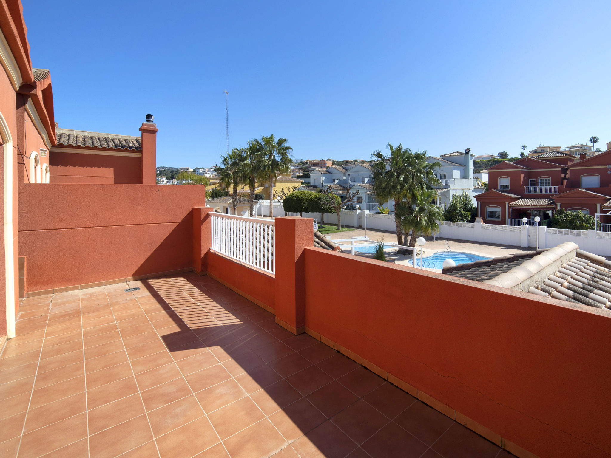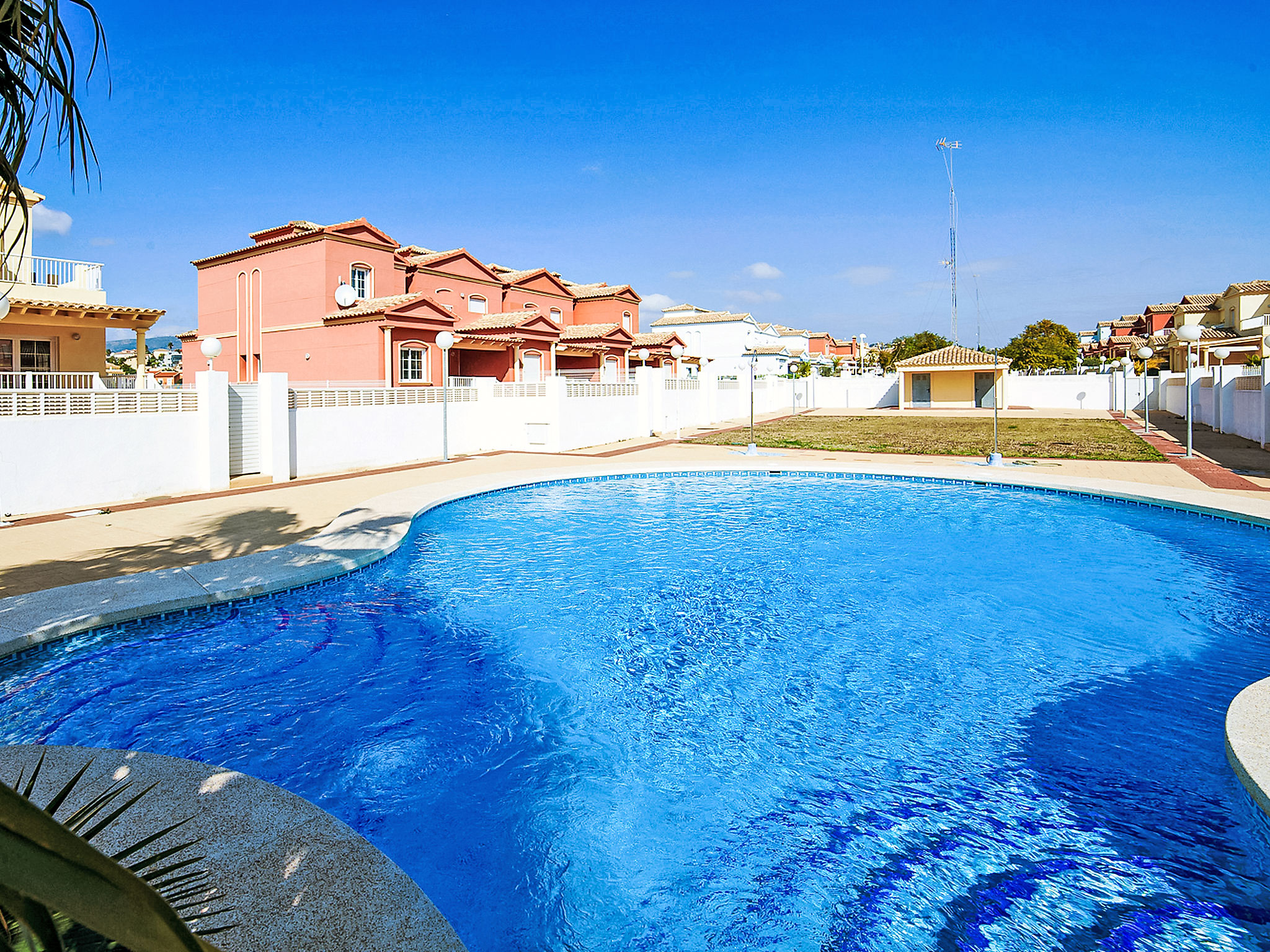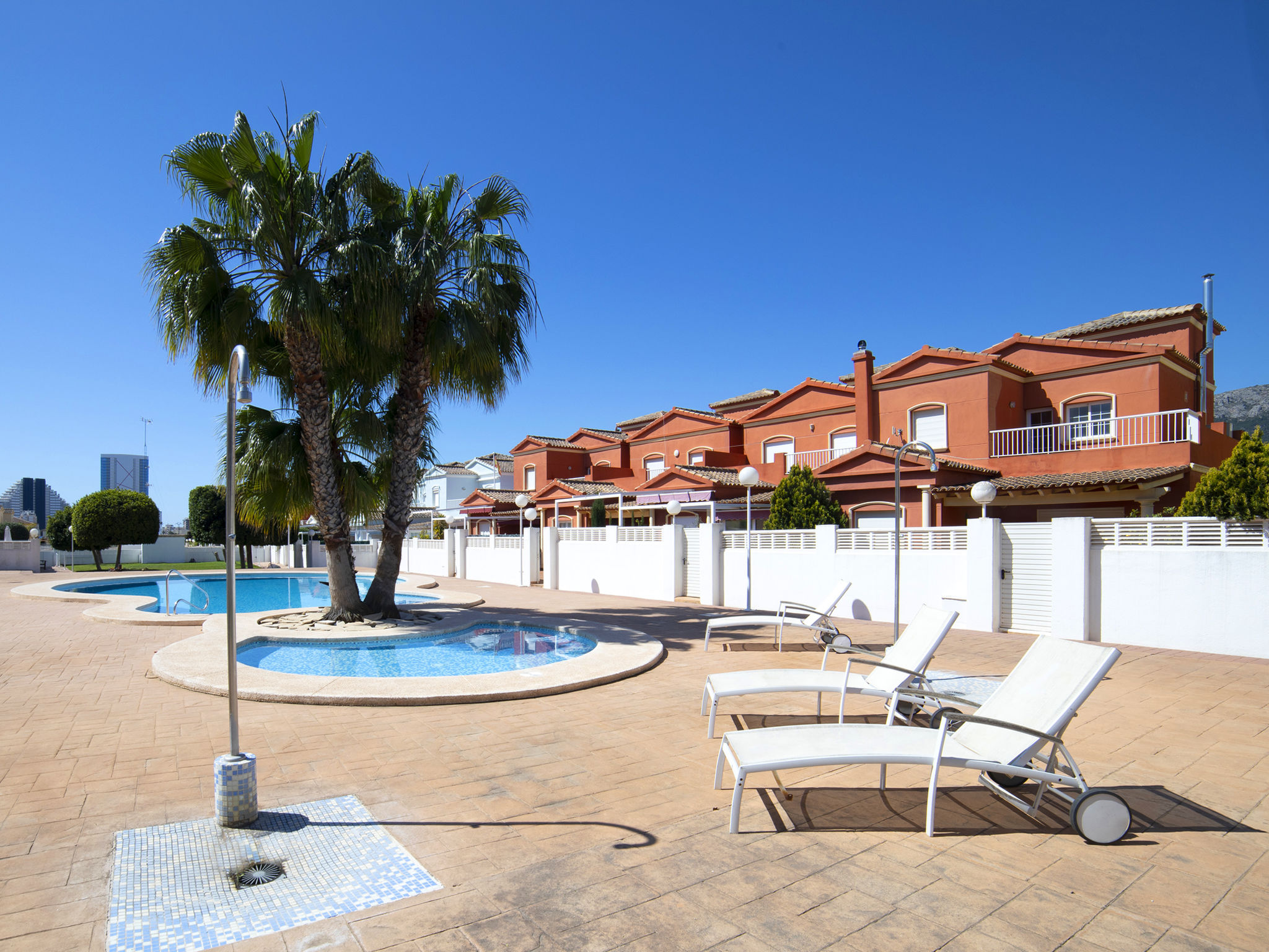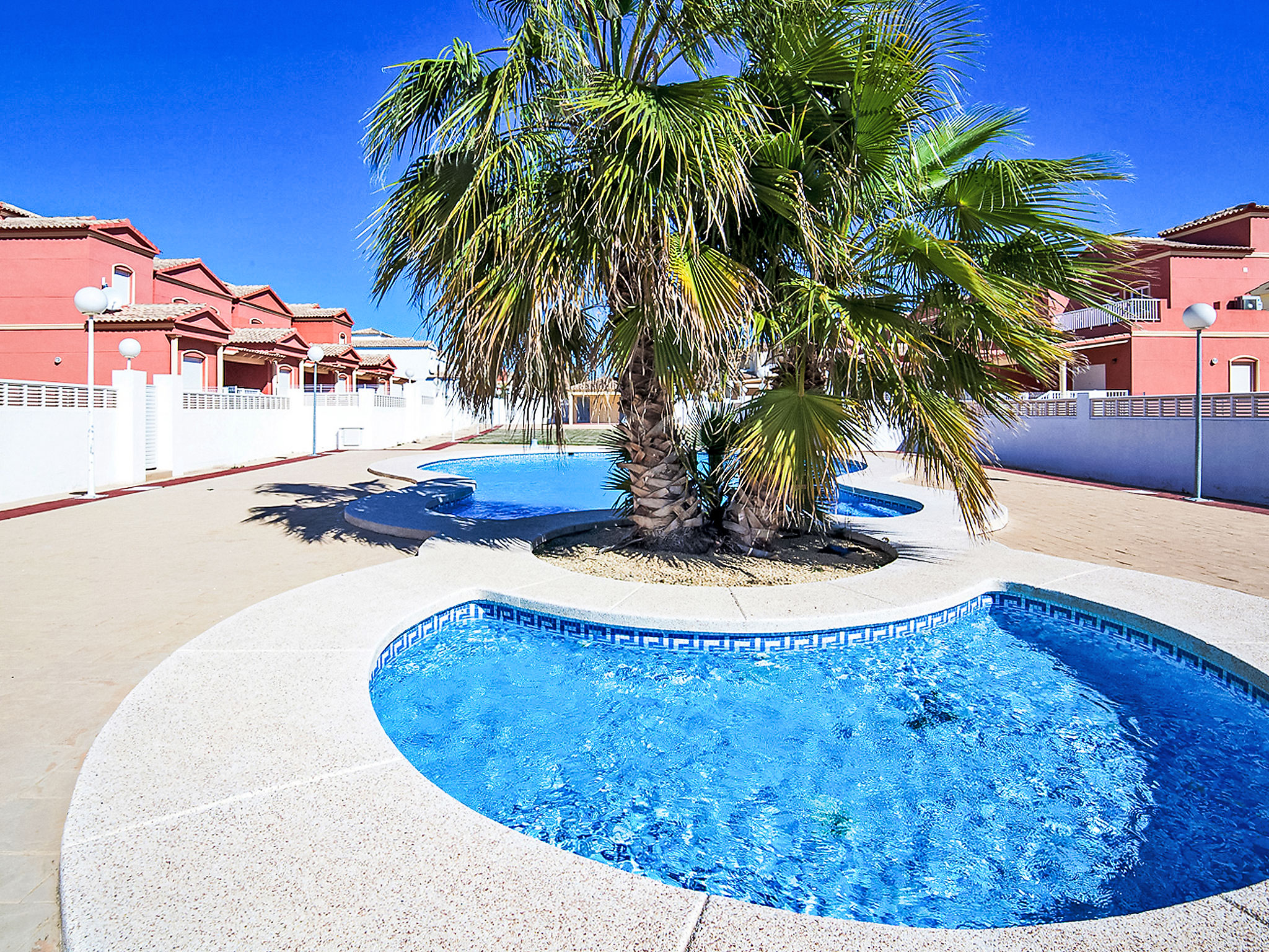 "Jazmines VI", 5-Zimmer-Reihenhaus 214 m2 auf 3 Stockwerken. Geräumig und hell, zweckmässig und komfortabel eingerichtet: offenes Wohn-/Esszimmer mit Sat-TV, Digital-TV, Klimaanlage und Warmluftheizung. Ausgang zur Terrasse. 1 Zimmer mit 1 franz. Bett (150 cm, Länge 200 cm), Dusche/Bidet/WC, Klimaanlage und Warmluftheizung. 1 Zimmer mit 2 Betten (90 cm, Länge 190 cm), Klimaanlage und Warmluftheizung. Küche (Backofen, Geschirrspüler, Toaster, Wasserkocher, Mikrowelle, elektrische Kaffeemaschine). Dusche/WC. Obergeschoss: 1 Zimmer mit 1 franz. Bett (135 cm, Länge 190 cm), Klimaanlage und Warmluftheizung. Ausgang zur Terrasse. 1 Zimmer mit 2 Betten (90 cm, Länge 190 cm), Klimaanlage und Warmluftheizung. Ausgang zur Terrasse. Bad/WC. Grosse Terrasse. Terrassenmöbel, Gartengrill. Zur Verfügung: Waschmaschine, Bügeleisen, Kinderhochstuhl, Babybett bis 2 Jahre, Haartrockner. Garage (2 Autos). Geeignet für Familien. R000000001