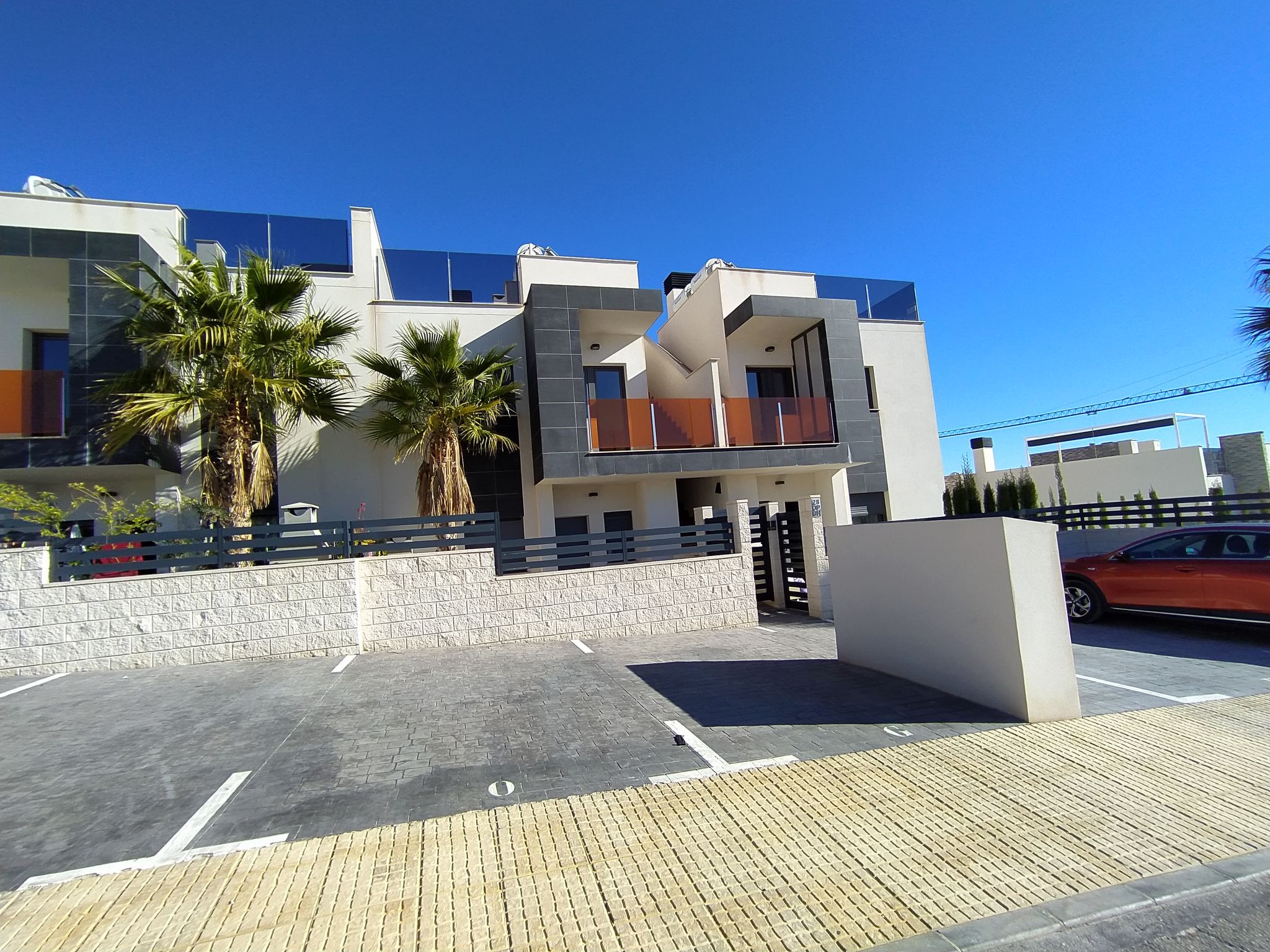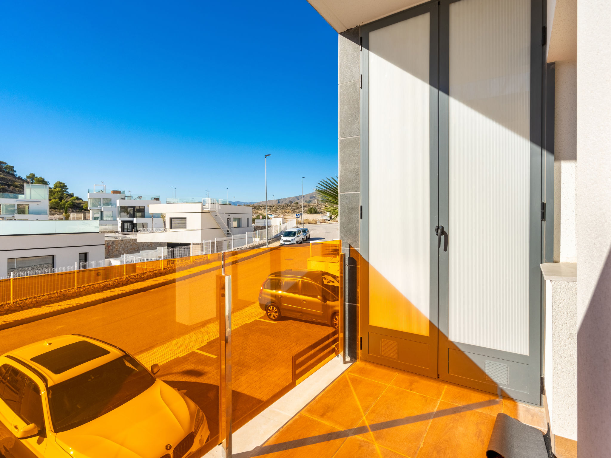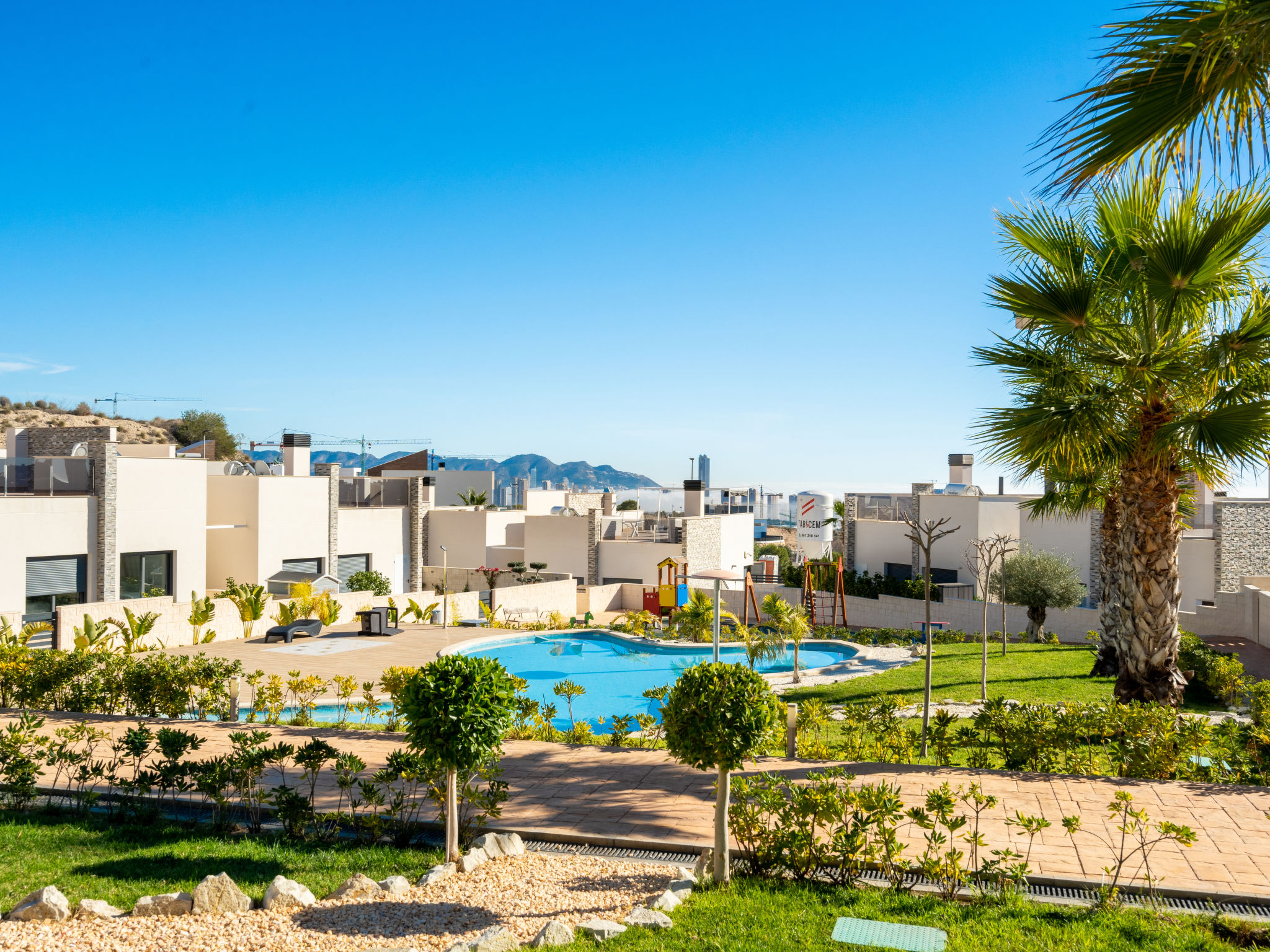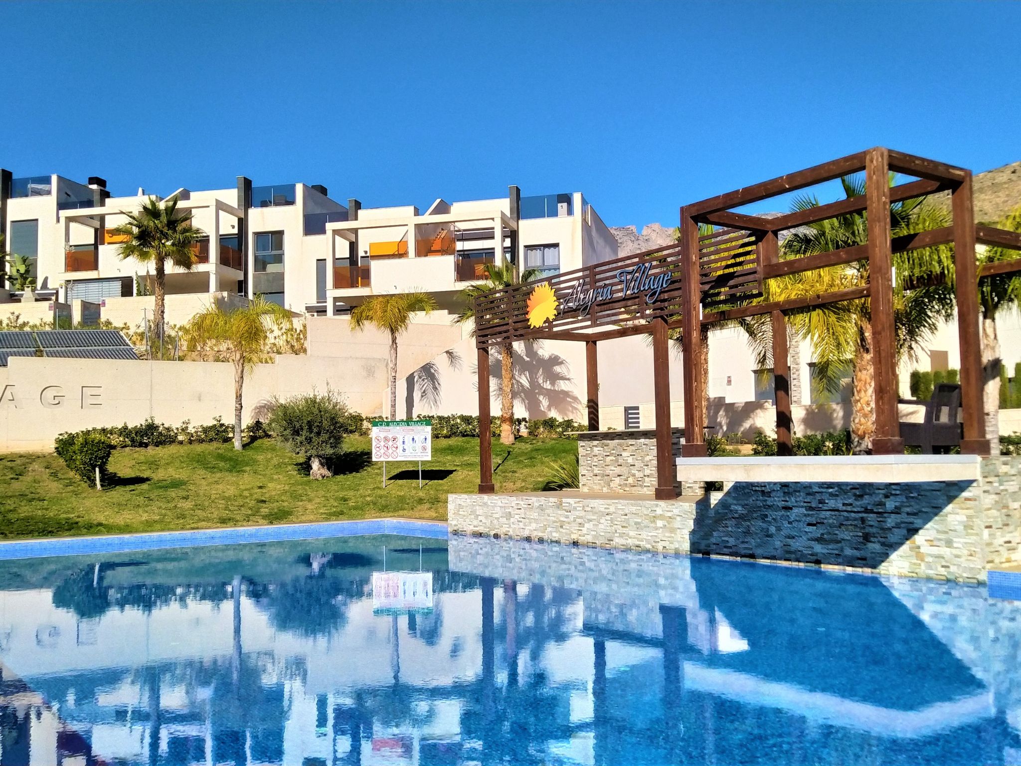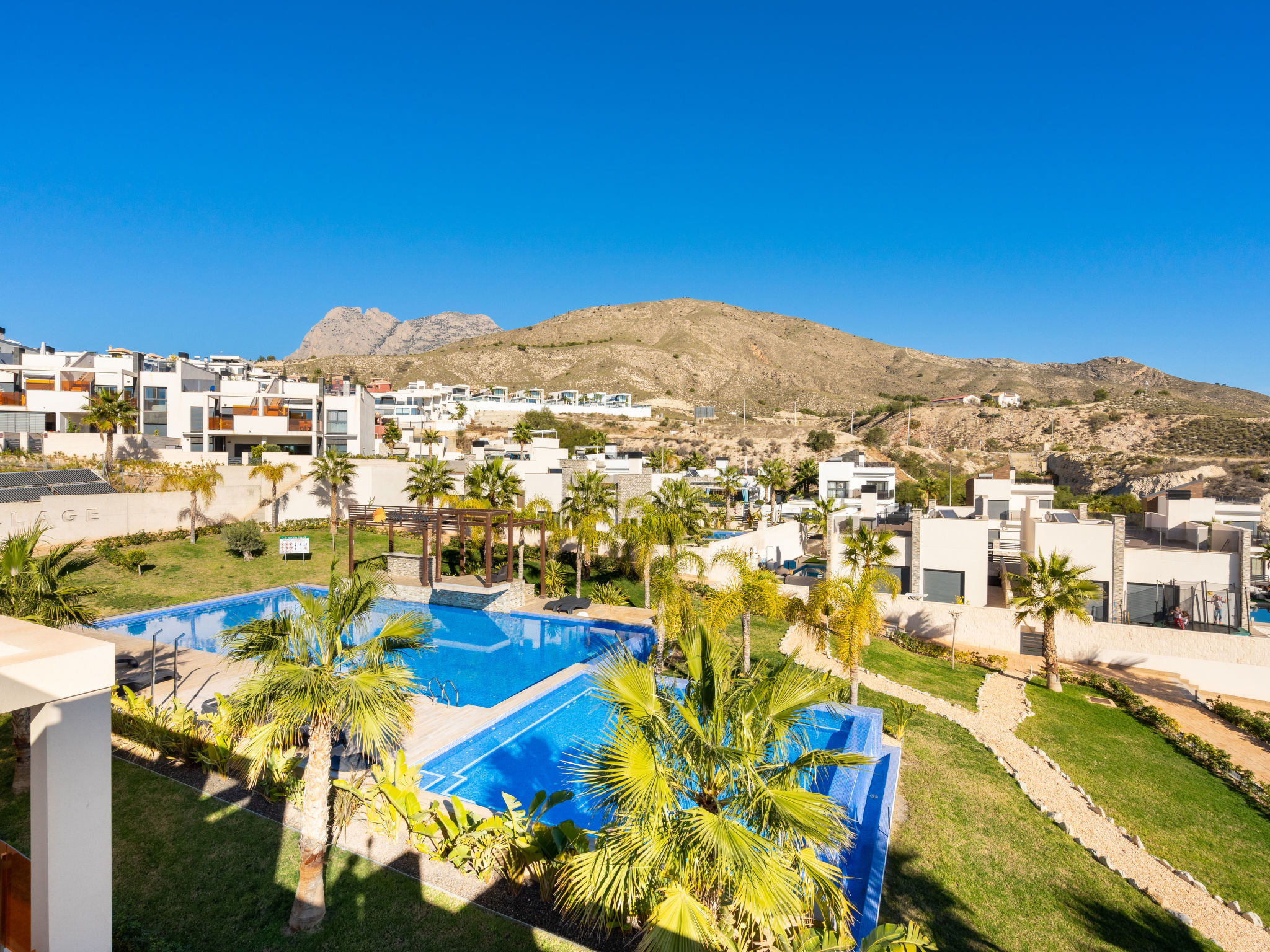 Modernes, komfortables Appartementhaus "Alegría Village", auf 3 Stockwerken, Baujahr 2021. Am Ortsrand, 4 km vom Zentrum von Benidorm, ausserhalb des Ortes, 2 km vom Zentrum von Finestrat, alleinstehende, ruhige, sonnige Lage, 4 km vom Meer, 4 km vom Strand. Zur Mitbenutzung: Grundstück (eingezäunt), Terrassengarten mit Rasen, Schwimmbad (7 x 20 m, 50 - 170 cm tief, saisonale Verfügbarkeit: 01.Jan.-31.Dez.). Aussendusche, Sitzplatz, Kinderspielplatz, Parkplatz auf dem Grundstück. Supermarkt 2 km, Restaurant 2 km, Bar 2 km. Golfplatz (9 Loch) 2 km, Wanderwege ab Haus 300 m. Nahe gelegene Sehenswürdigkeiten: Aqualandia 14 km, MundoMar 14 km, Terramítica 6 km, Terranatura 6 km, Alicante 44 km, Aeropuerto Alicante 58 km. Bitte beachten: kein Fahrstuhl vorhanden. Der Besitzer akzeptiert keine Jugendgruppen. Die Nachbarschaft ist sehr lärmempfindlich. Ruhe und gutes Benehmen wird erwartet.