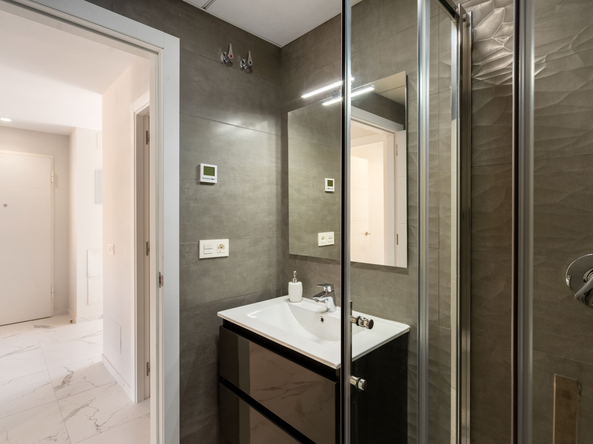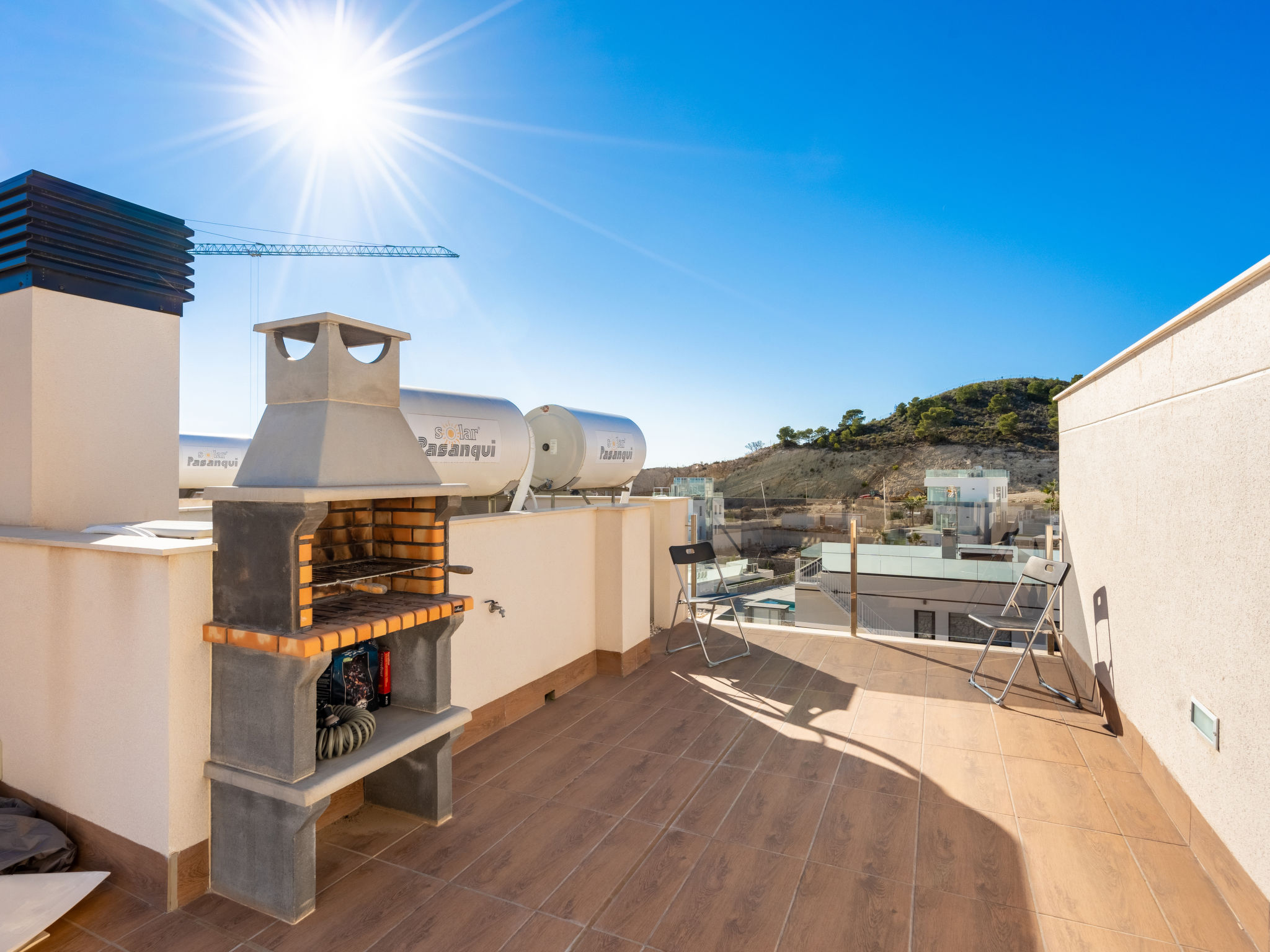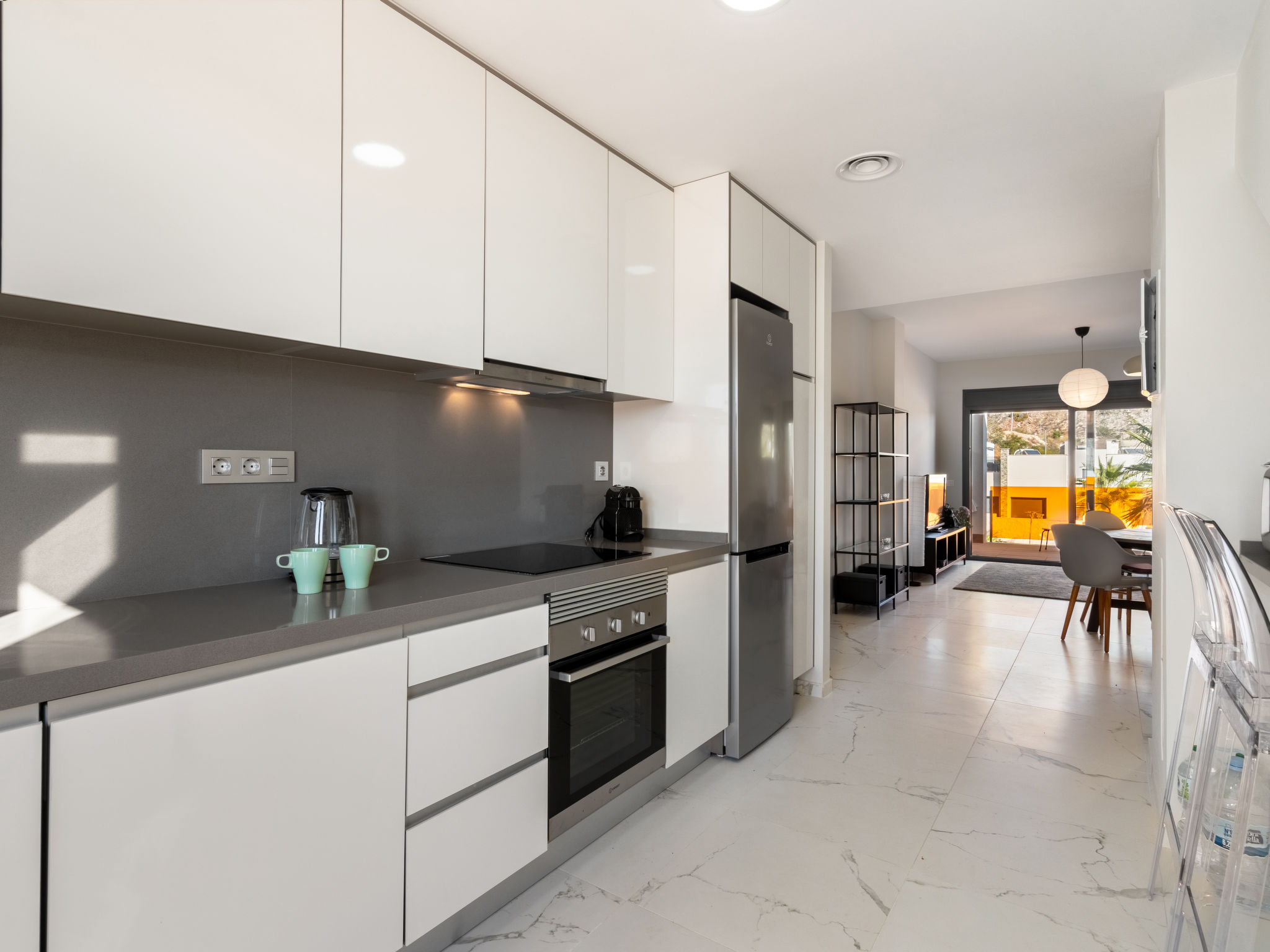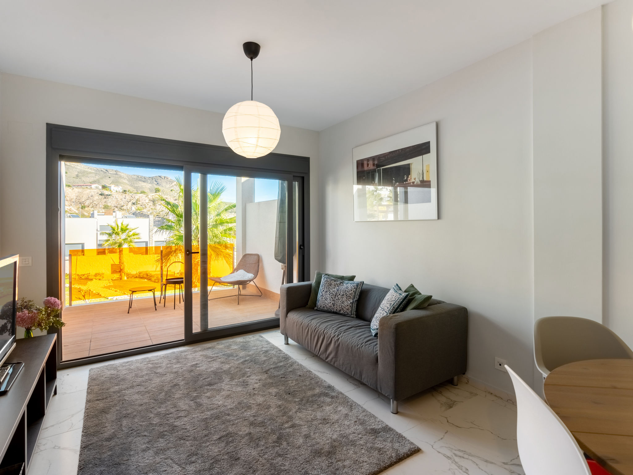 Modernes, komfortables Appartementhaus "Alegría Village", auf 3 Stockwerken, Baujahr 2021. Am Ortsrand, 4 km vom Zentrum von Benidorm, ausserhalb des Ortes, 2 km vom Zentrum von Finestrat, alleinstehende, ruhige, sonnige Lage, 4 km vom Meer, 4 km vom Strand. Zur Mitbenutzung: Grundstück (eingezäunt), Terrassengarten mit Rasen, Schwimmbad (7 x 20 m, 50 - 170 cm tief, saisonale Verfügbarkeit: 01.Jan.-31.Dez.). Aussendusche, Sitzplatz, Kinderspielplatz, Parkplatz auf dem Grundstück. Supermarkt 2 km, Restaurant 2 km, Bar 2 km. Golfplatz (9 Loch) 2 km, Wanderwege ab Haus 300 m. Nahe gelegene Sehenswürdigkeiten: Aqualandia 14 km, MundoMar 14 km, Terramítica 6 km, Terranatura 6 km, Alicante 44 km, Aeropuerto Alicante 58 km. Bitte beachten: kein Fahrstuhl vorhanden. Der Besitzer akzeptiert keine Jugendgruppen. Die Nachbarschaft ist sehr lärmempfindlich. Ruhe und gutes Benehmen wird erwartet.
