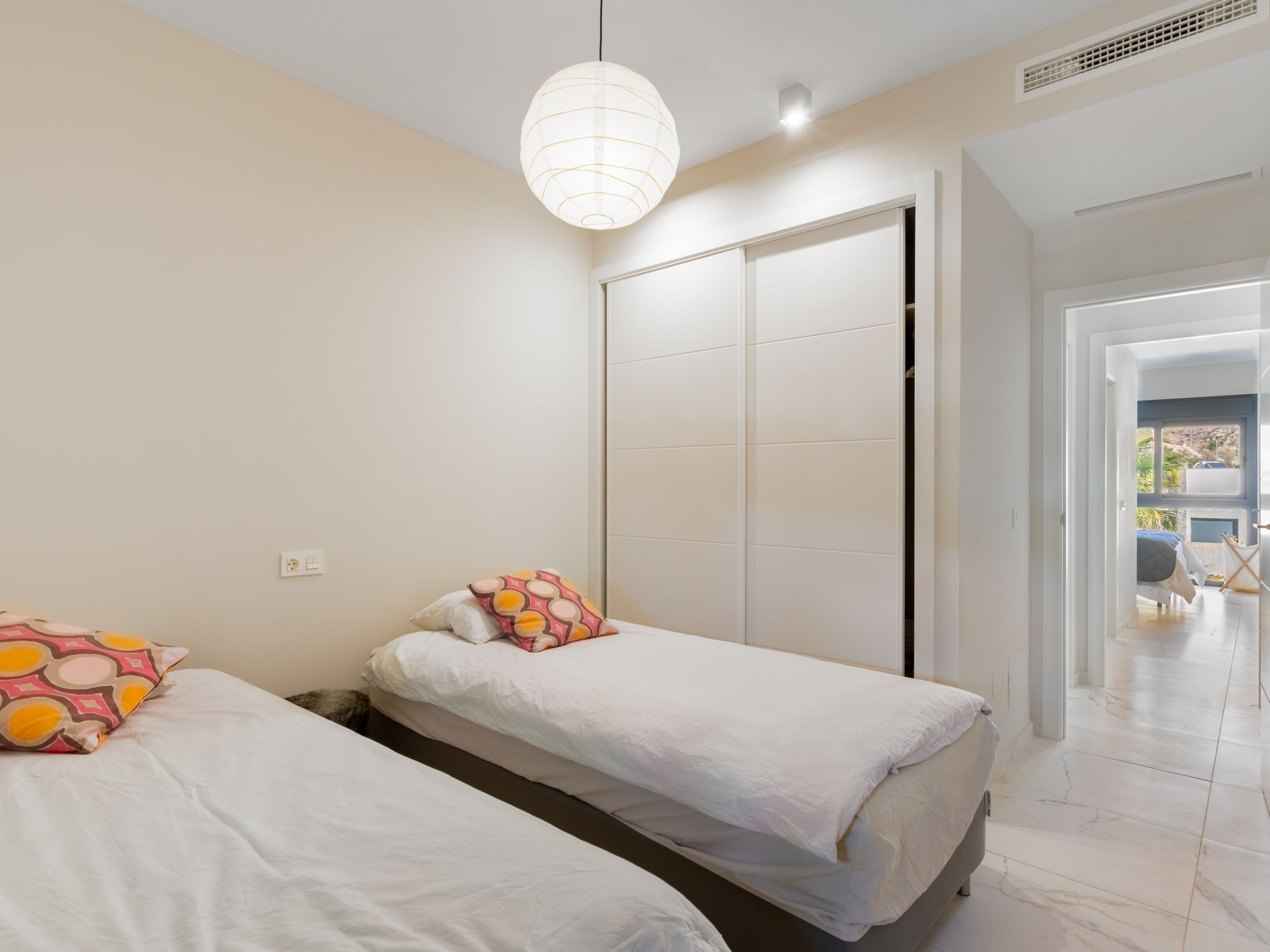 "Alegría Village", 3-Zimmer-Wohnung 80 m2 auf 2 Stockwerken im 1. Stock. Objekt geeignet für 4 Erwachsene. Geräumig und hell, komfortabel eingerichtet: Wohn-/Esszimmer 18 m2 mit Digital-TV und Klimaanlage. Ausgang zur Terrasse. 9 m2, 1 Zimmer mit 1 franz. Bett (135 cm, Länge 190 cm), Dusche/WC und Klimaanlage. 1 Zimmer 9 m2 mit 2 Betten (90 cm, Länge 190 cm), Klimaanlage. Kochnische (Backofen, Geschirrspüler, 3 Induktionskochplatten, Toaster, Wasserkocher, Mikrowelle, Tiefkühler, elektrische Kaffeemaschine). Dusche/WC. Terrasse 7 m2, grosse Terrasse 45 m2. Terrassenmöbel, Gartengrill. Sicht auf das Schwimmbad, den Garten und die Ortschaft. Zur Verfügung: Waschmaschine, Bügeleisen, Kinderhochstuhl, Babybett bis 2 Jahre, Haartrockner. Parkplatz Nr. 51. VT-487938-A