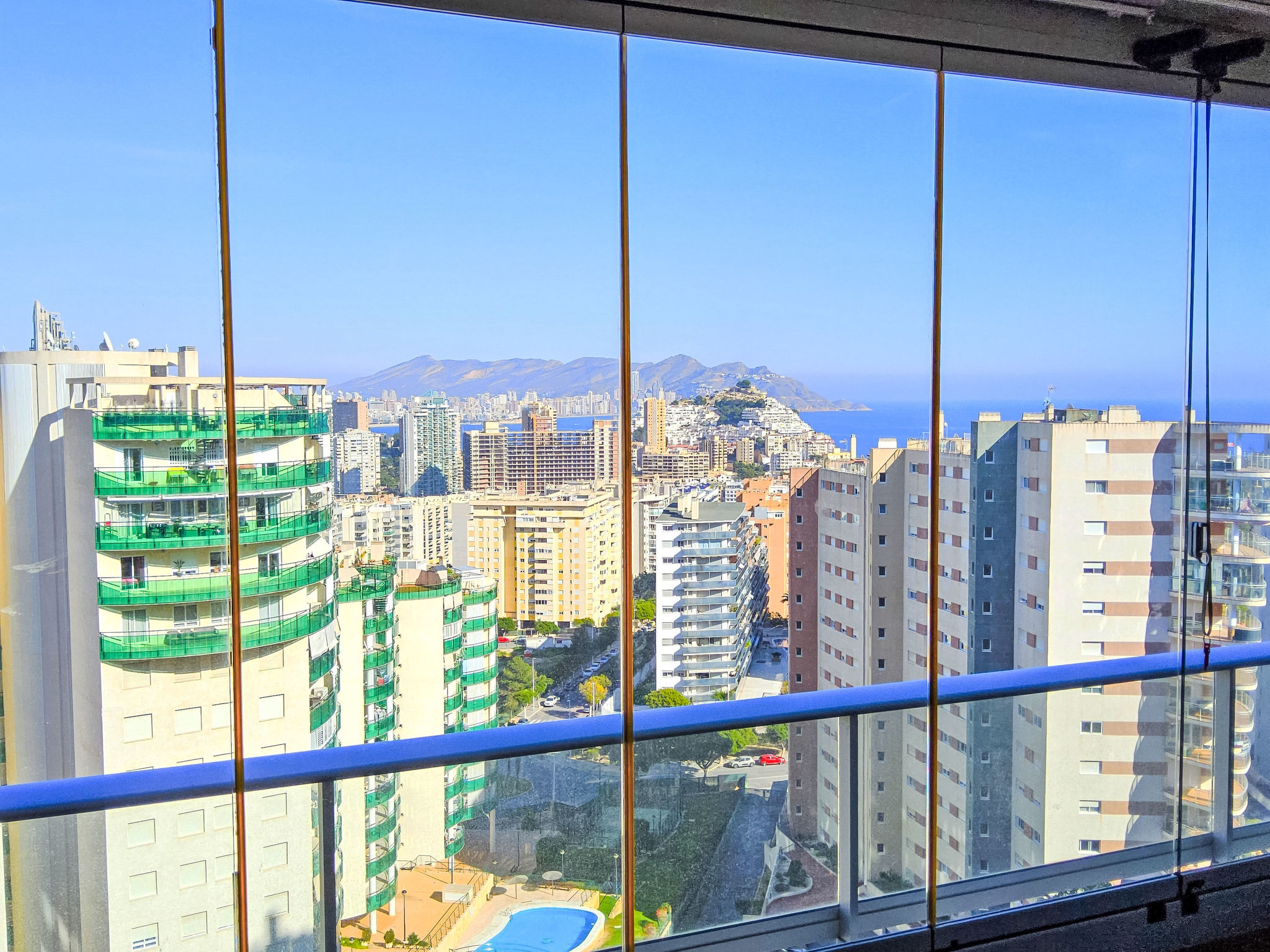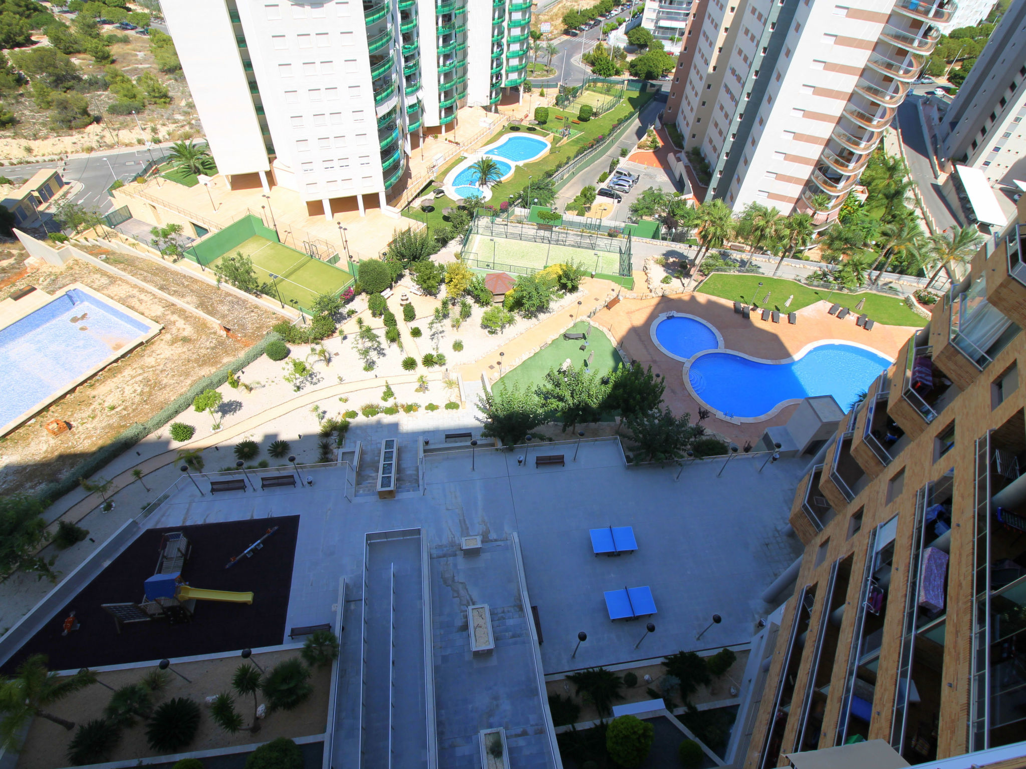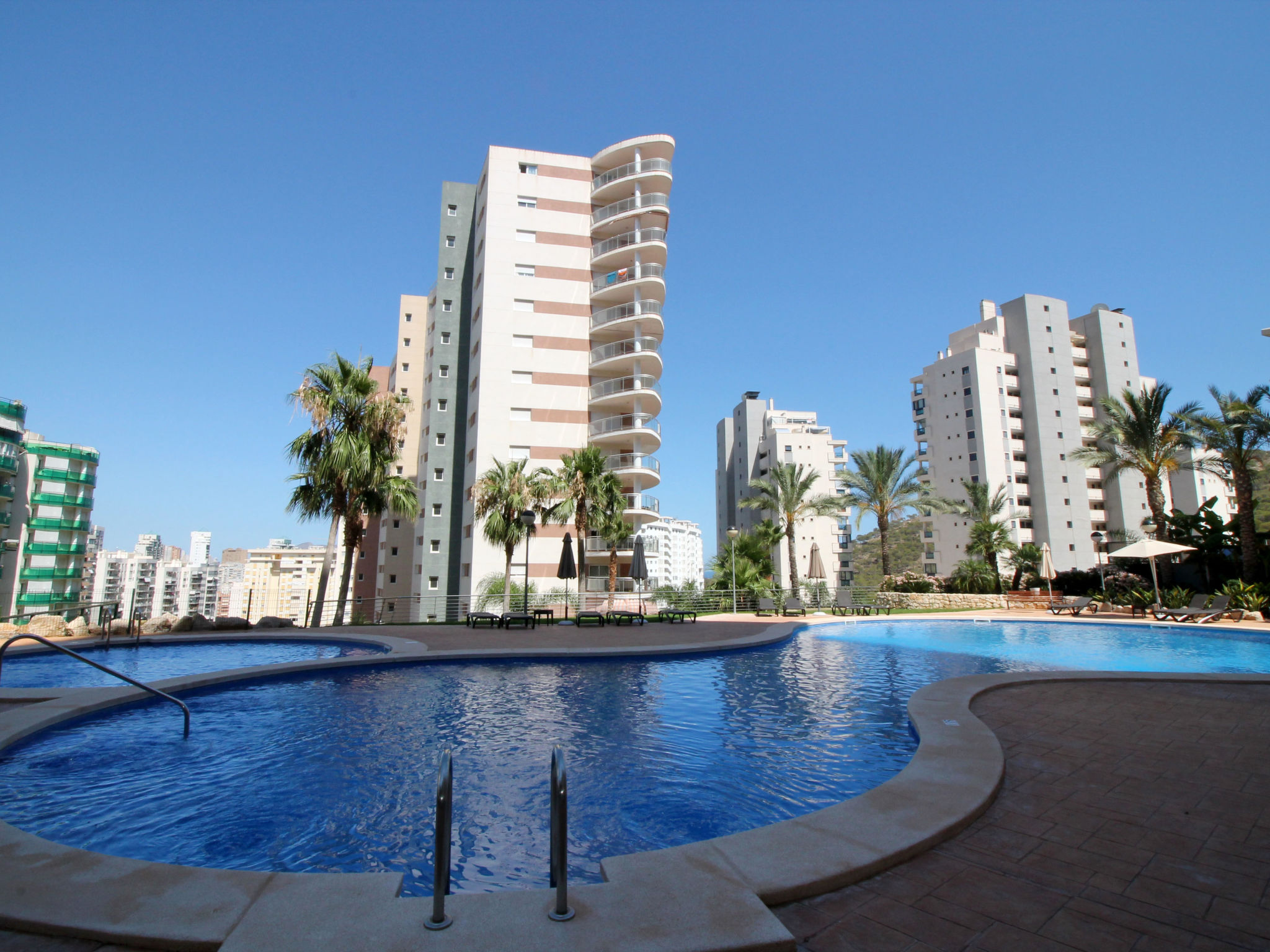 Cala Villajoyosa: Grosses, modernes Appartementhaus "Torre Mestral", auf 16 Stockwerken. Am Ortsrand, 4 km vom Zentrum von Benidorm, ruhige, sonnige Lage am Hang, 800 m vom Meer, 800 m vom Strand. Zur Mitbenutzung: Grundstück (eingezäunt), Terrassengarten, Schwimmbad (110 - 220 cm tief, saisonale Verfügbarkeit: 01.Jan.-31.Dez.). Dusche/WC im Poolbereich. Im Hause: Fahrstuhl. Steile Zufahrt. Öffentliche Parkplätze auf der Strasse. Supermarkt 800 m, Restaurant, Bar 300 m, Bushaltestelle "Benidorm" 800 m, Bahnstation "Benidorm" 4 km. Golfplatz (18 Loch) 4 km, Wanderwege ab Haus 100 m. Nahe gelegene Sehenswürdigkeiten: Terra Mitica 4 km, Terra Natura 4 km, Aqualandia 6 km, Mundomar 6 km, Alicante 40 km, Aeropuerto Alicante 52 km. Bitte beachten: Babyausstattung auf Anfrage. Der Besitzer akzeptiert keine Jugendgruppen. Die Nachbarschaft ist sehr lärmempfindlich. Ruhe und gutes Benehmen wird erwartet.