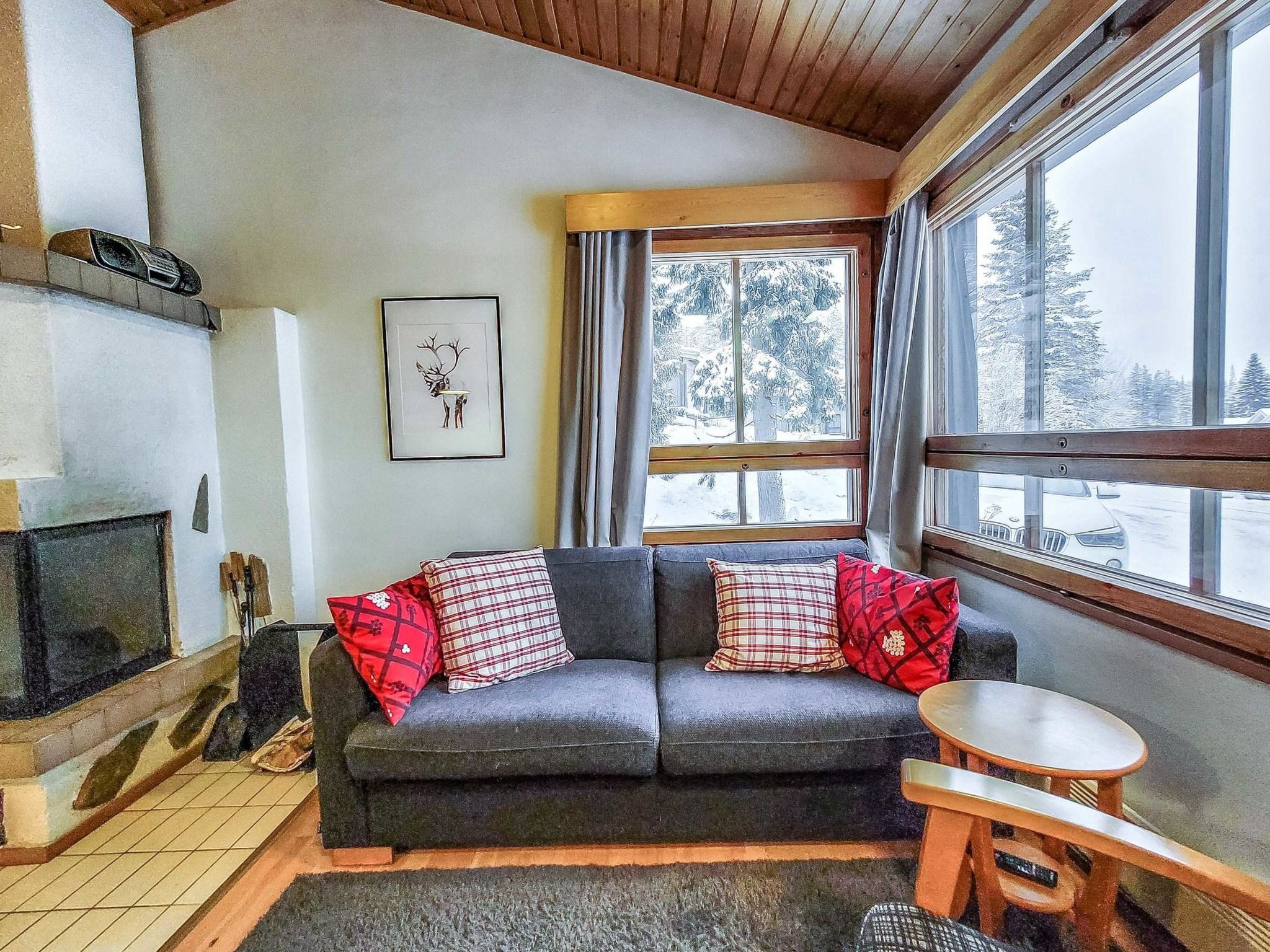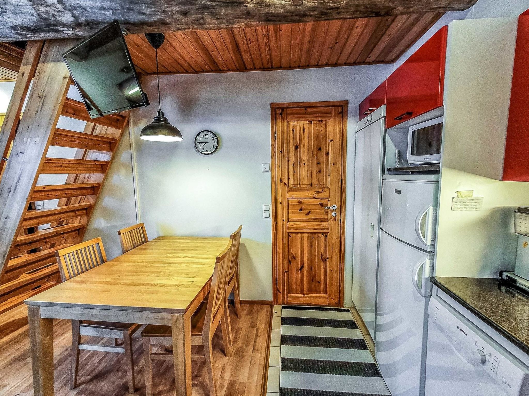 27 km to the north from Kuusamo, Ruka village (West-Ruka) 1,5 km. 2-storey stone- and kelo log-built apartment in row house, built in 1990. The upper floor has low room height (standing height), steep stairs and an electric sauna.
