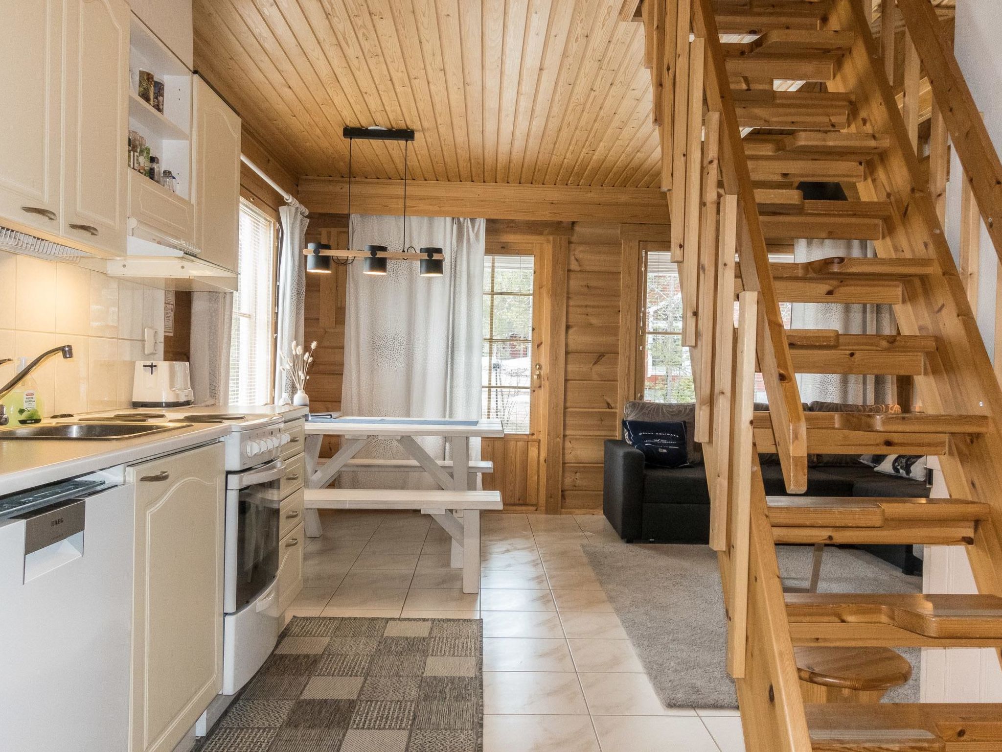 Praktische Giebel-Ferienwohnung, im Reihenhaus, weniger als einen Kilometer von diversen Dienstleistungen des Touristenzentrums Levi entfernt. 170 km nördlich von Rovaniemi, im Touristenzentrum von Levi, im Bezirk Mylly. Blockgiebelwohnung, im Reihenhaus, Baujahr 2002. Wohnküche mit Schlafcouch, Schlafnische mit 2 Betten in Verbindung mit Dachboden, 2 Betten im Dachboden, steile Treppe zum Dachboden, Sauna, Waschraum/WC, Duschkabine im Waschraum, kleine Terrasse und Abstellraum. Die Wohnung befindet sich nur wenige Gehminuten vom Touristenzentrum Levi entfernt. Zum Beispiel Geschäfte Levi Markt/S-Markt - 400 Meter, Skipisten - 700 Meter.