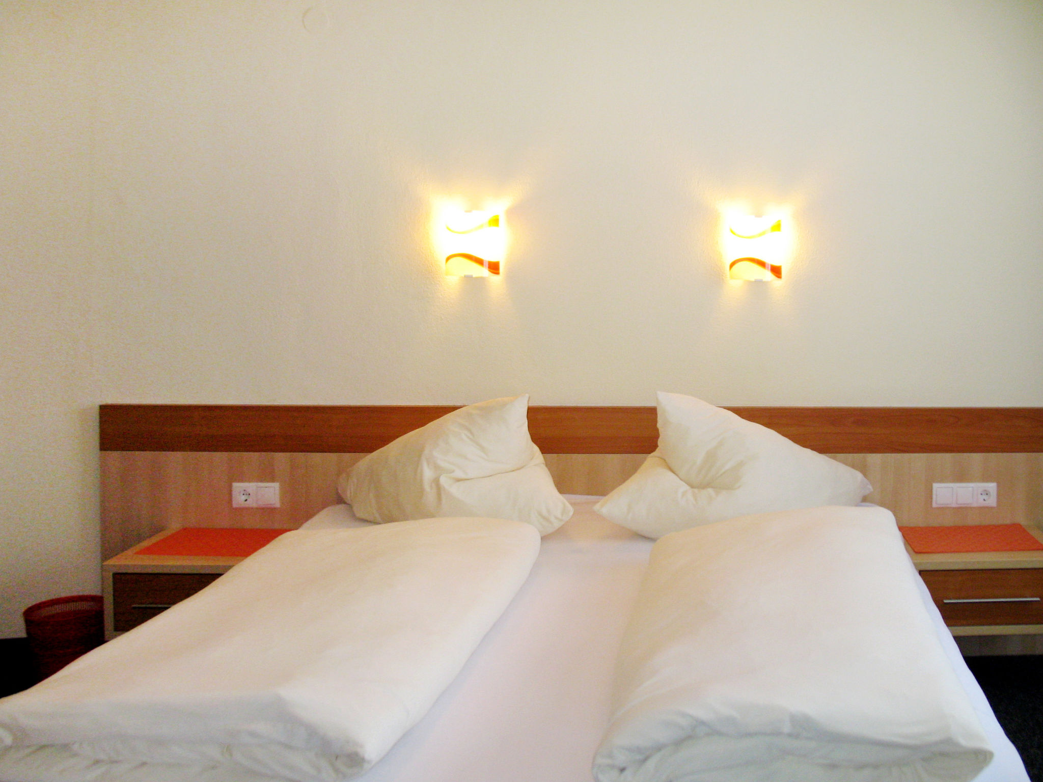 4-Zimmer-Wohnung, 1. Etage, ca. 80 m². Eingang in Doppelzimmer mit Dusche/WC, Balkonausgang und Zugang zu weiterem Doppelzimmer mit Dusche/WC, Balkonausgang, von hier in Wohnküche (4 Platten, Backofen, Mikrowelle, Geschirrspüler, Kühlschrank, Kaffeemaschine, Wasserkocher) mit Essplatz (Eckbank), Sitzcouch, Balkonausgang. Schlafzimmer mit Doppelbett, Einzelbett, Dusche/WC.