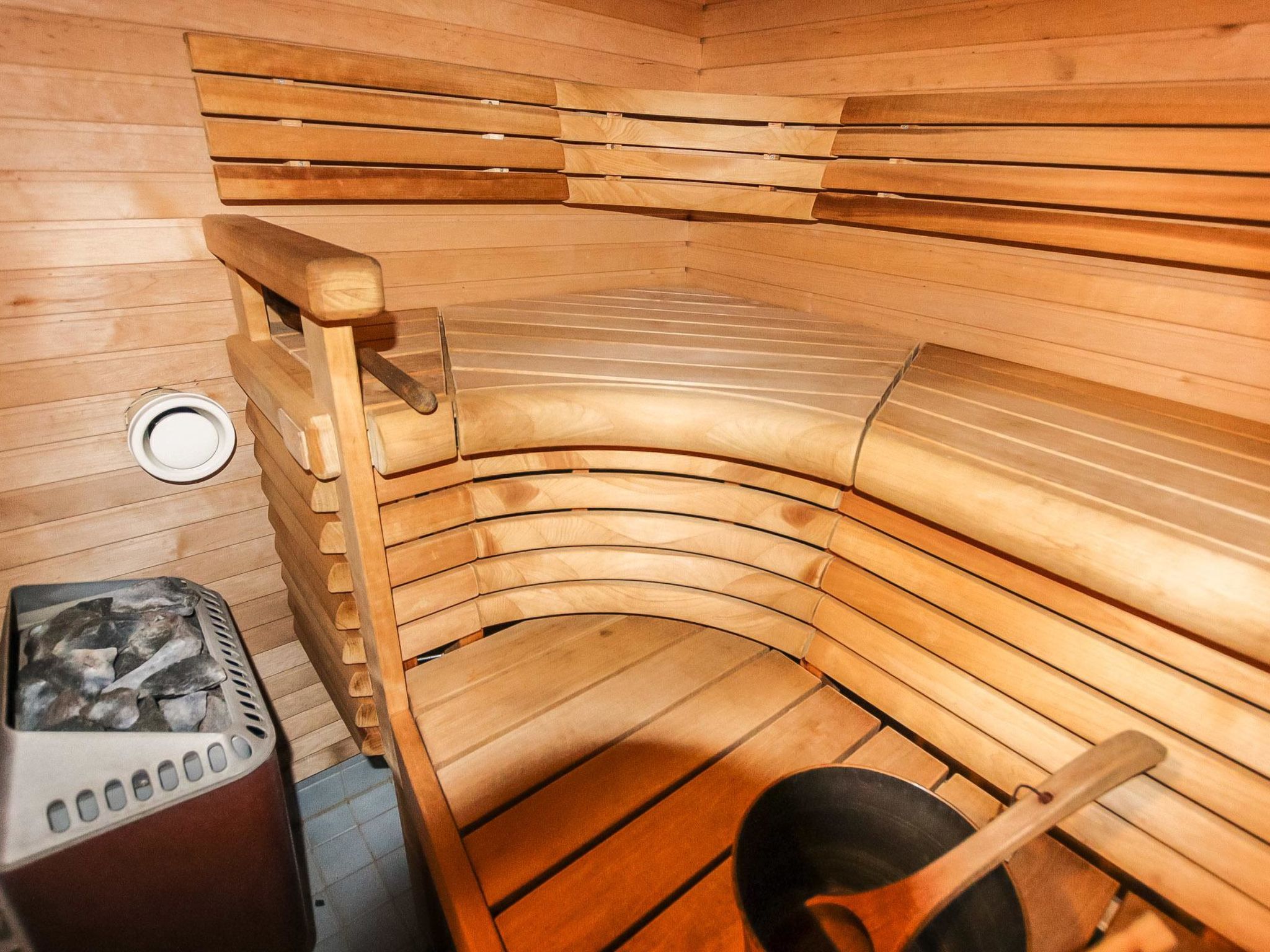 The downstairs of a double semi-detached house located in the Ukkohalla tourism centre, 35m2, built in 1992. Kitchen, bedroom with a bunk bed, sauna, shower room/toilet, terrace, storage, living room sofa-bed. A dock in shared use, lean-to and fireplace.