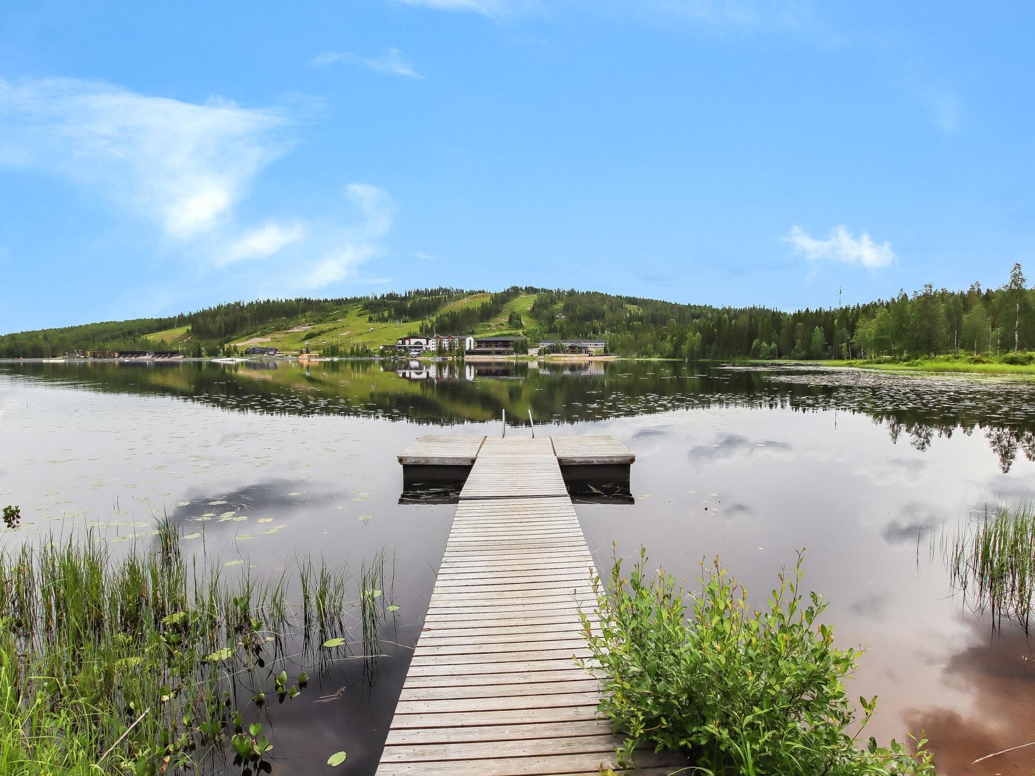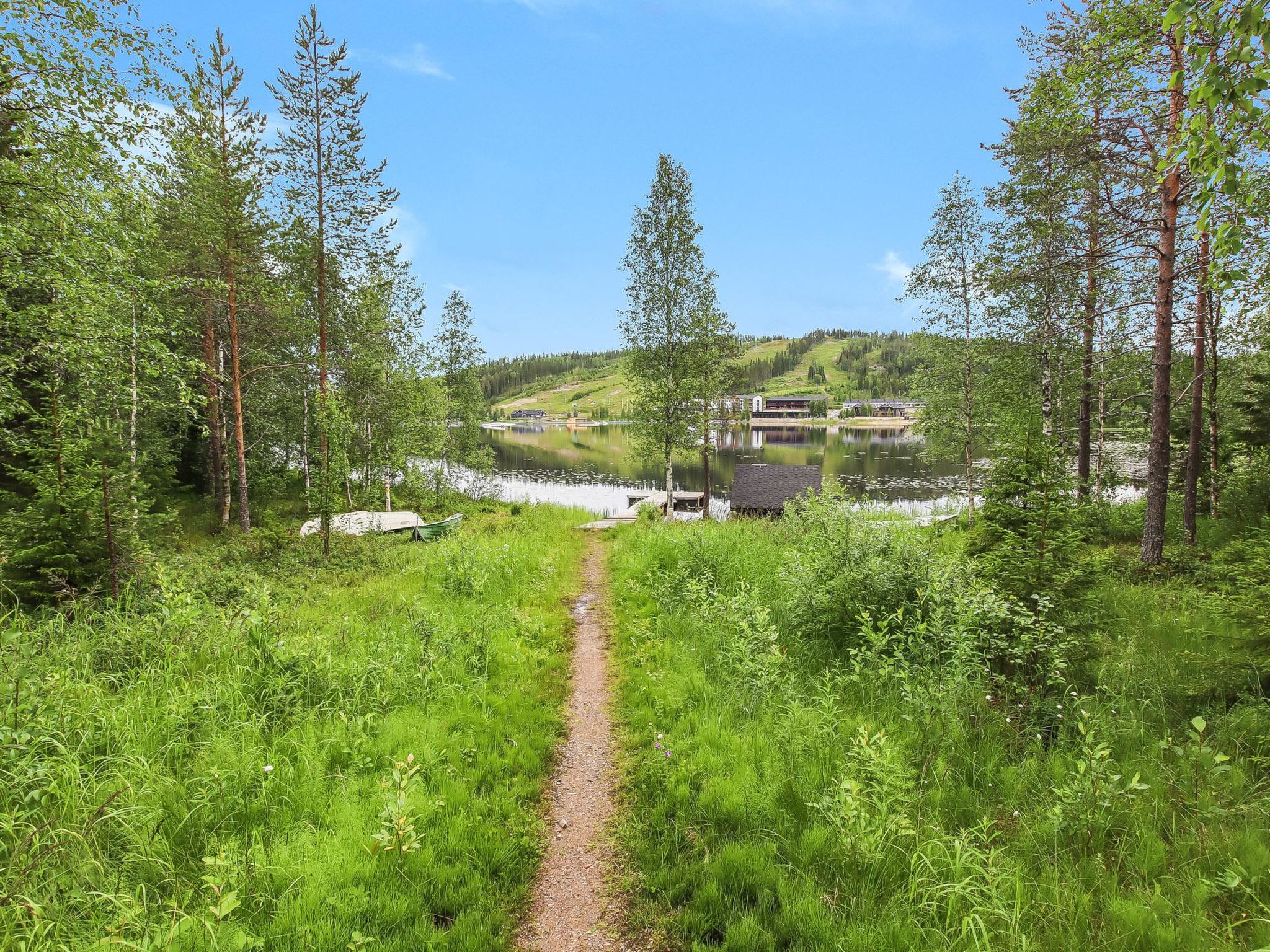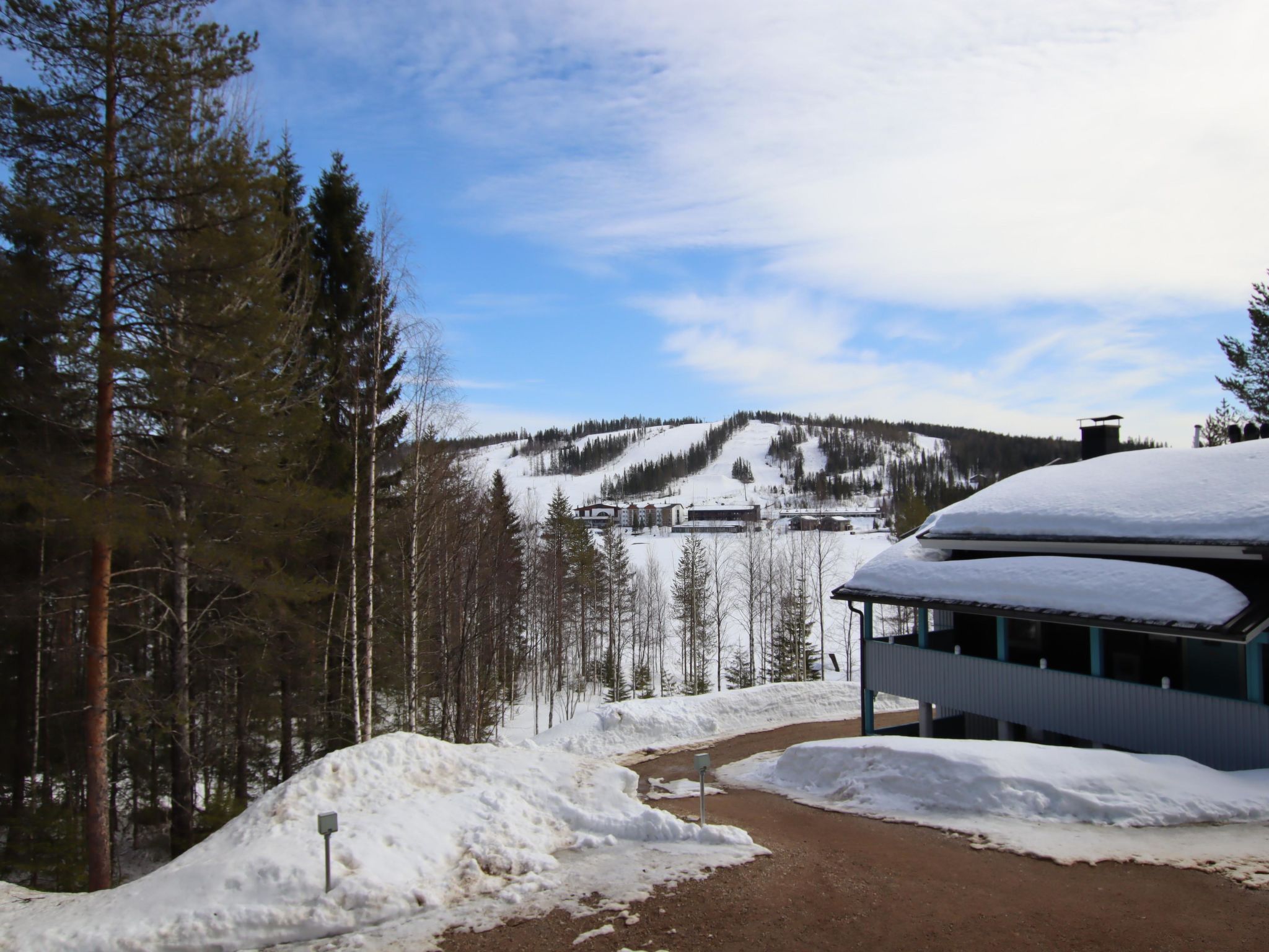 Ukkohalla: Tourism centre located by Lake Syväjärvi, with an information centre, store, restaurant, spa, slope centre, snowmobile tracks, ski tracks, programme services, beach (further information at www.ukkohalla.fi). Distance to the Ukkohalla services 1.5 km. Kajaani airport 86 km, Oulu 170 km, Helsinki 650 km, bus stop Hyrynsalmi 18 km, railway station Kontiomäki 66 km. Pets prohibited. View over the slopes and Lake Syväjärvi. Cottage is available at 4.00pm on arriving day - till 12.00 on departure day.