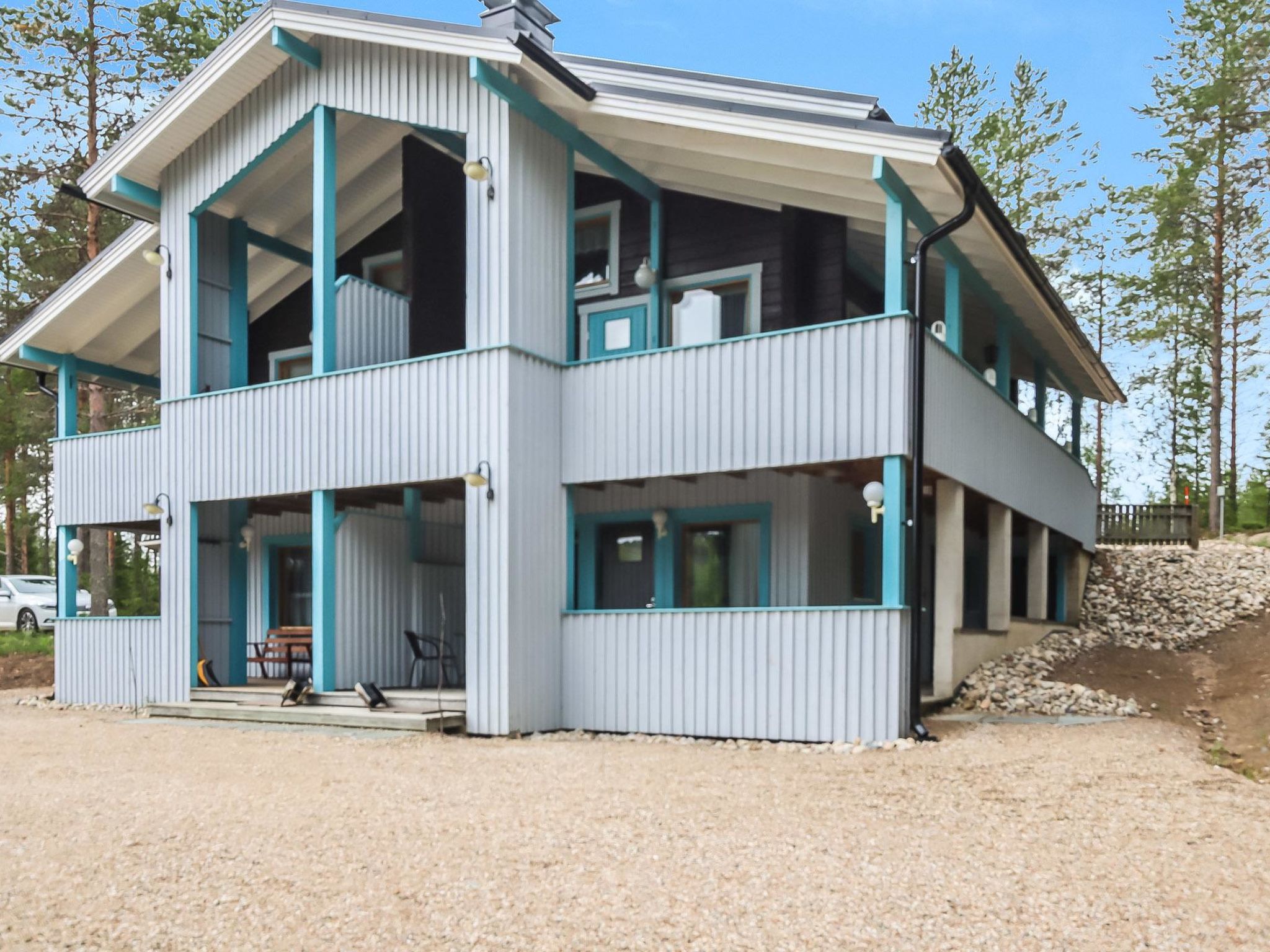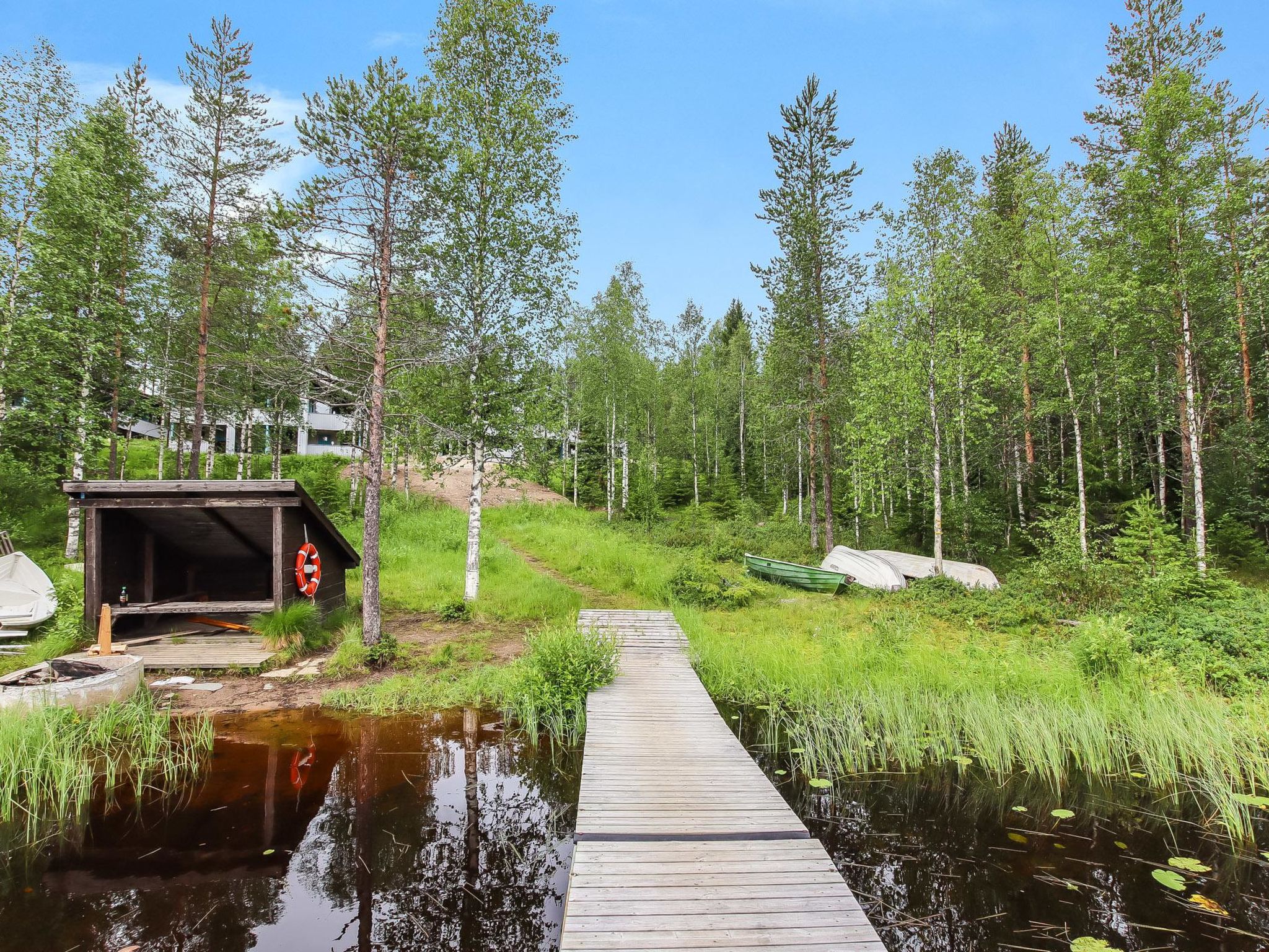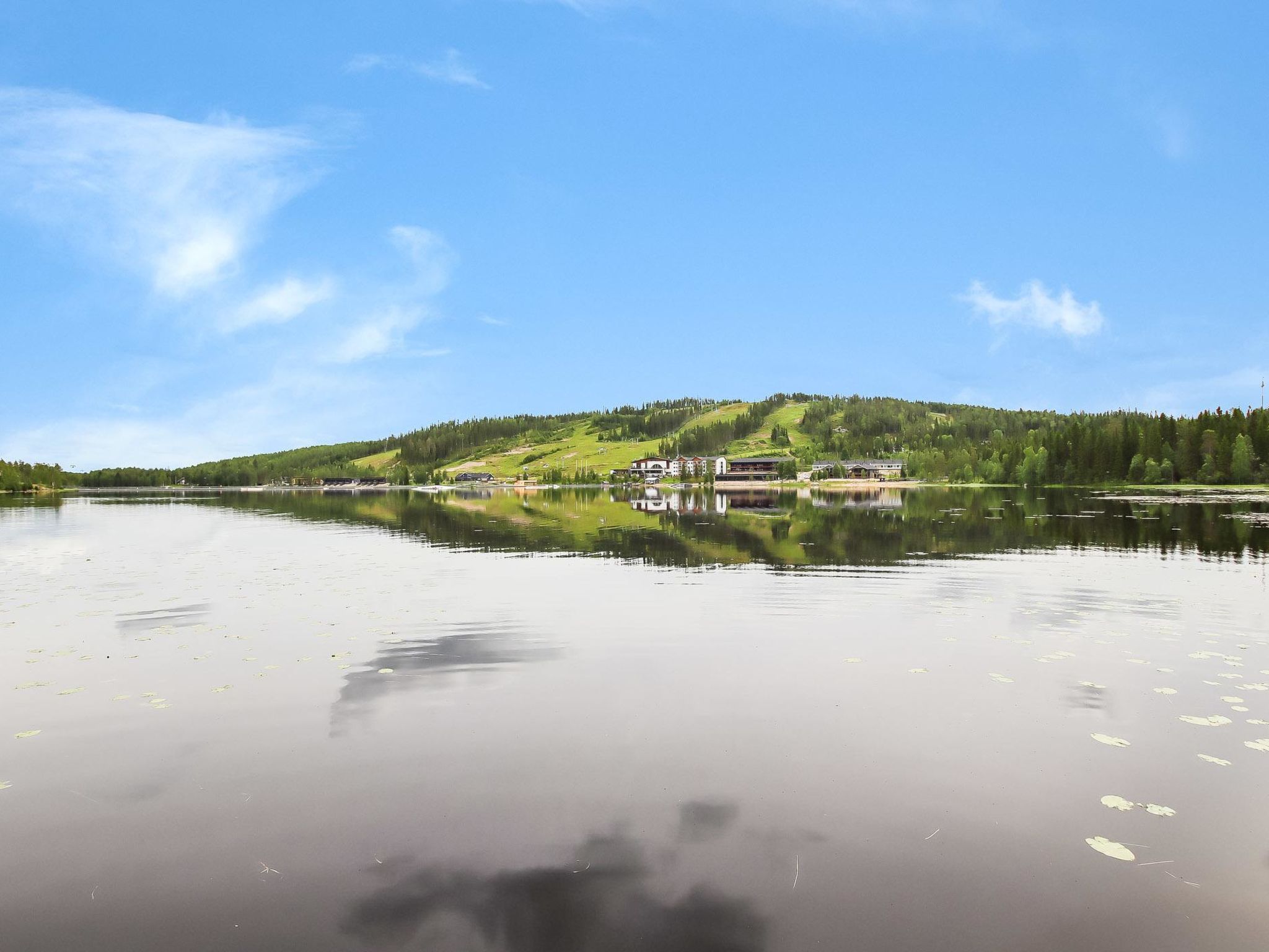 Ukkohalla: Tourism centre located by Lake Syväjärvi, with an information centre, store, restaurant, spa, slope centre, snowmobile tracks, ski tracks, programme services, beach (further information at www.ukkohalla.fi). Distance to the Ukkohalla services 1.5 km. Kajaani airport 86 km, Oulu 170 km, Helsinki 650 km, bus stop Hyrynsalmi 18 km, railway station Kontiomäki 66 km. Pets prohibited. View over the slopes and Lake Syväjärvi. Cottage is available at 4.00pm on arriving day - till 12.00 on departure day.