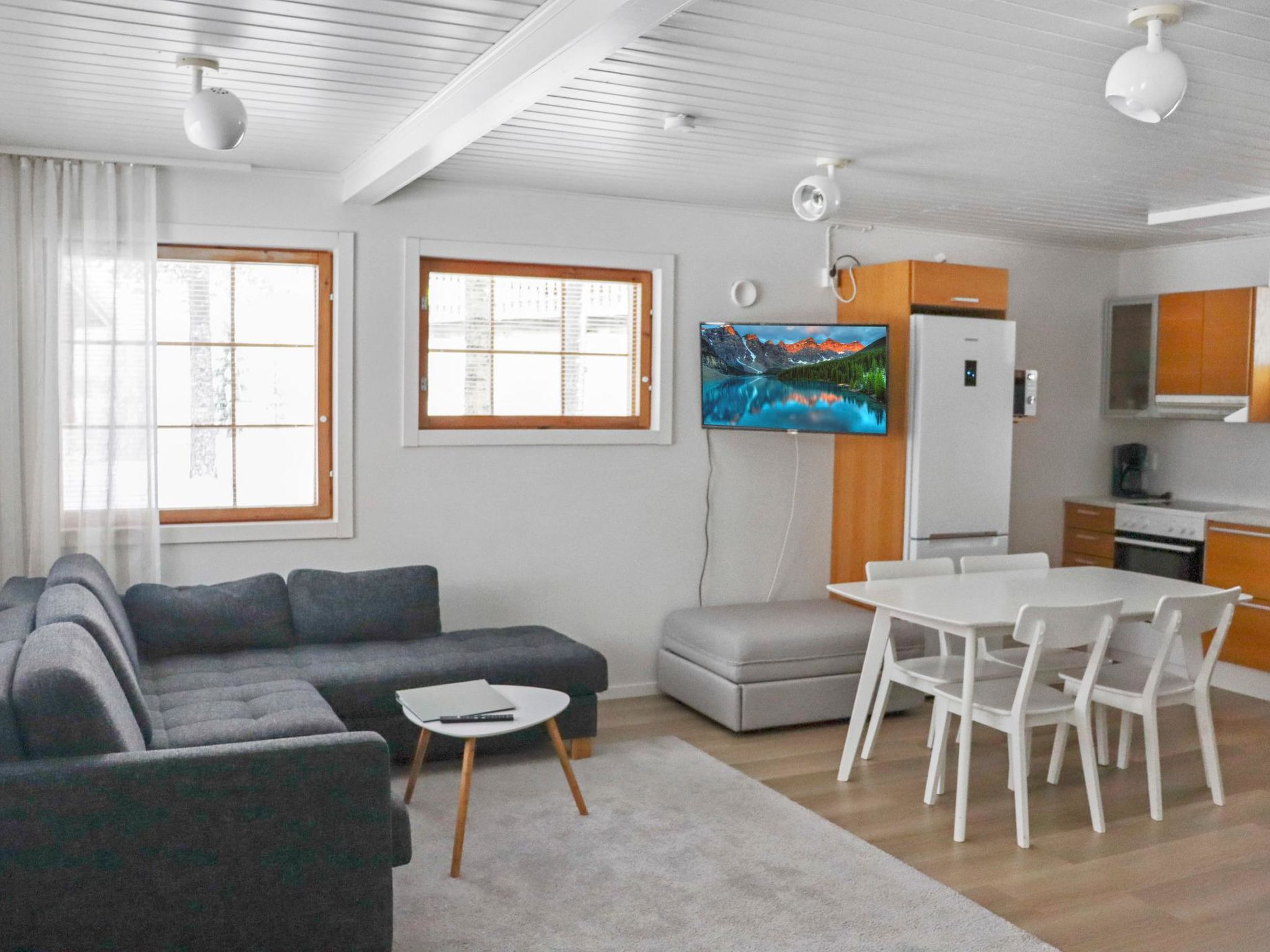 Ukkohalla: Tourism centre located by Lake Syväjärvi, with an information centre, store, restaurant, spa, slope centre, snowmobile tracks, ski tracks, programme services, beach (further information at www.ukkohalla.fi). Distance to the Ukkohalla services 1.5 km. Kajaani airport 86 km, Oulu 170 km, Helsinki 650 km, bus stop Hyrynsalmi 18 km, railway station Kontiomäki 66 km. Pets prohibited, beautiful view over the slopes and Lake Syväjärvi. Cottage is available at 4.00pm on arriving day - till 12.00 on departure day.
