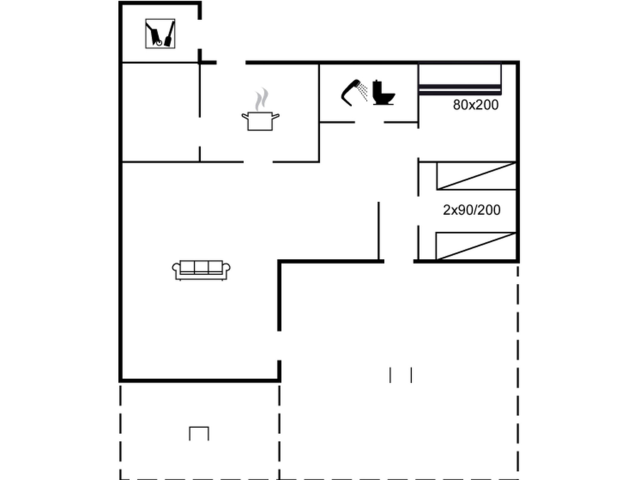 "Olin" - 600m from the sea", 2-Zimmer-Haus 64 m2. Objekt geeignet für 4 Erwachsene + 1 Kind. Wohnzimmer mit Radio. 1 Zimmer mit 2 Betten. 1 Zimmer mit 1 x 2 Etagenbetten. Küche (Backofen, 4 Glaskeramikplatten, Tiefkühler). Dusche/WC. Terrasse 20 m2, überdacht. Zur Verfügung: Babybett. Maximal 2 Haustiere/Hunde erlaubt. 860-31623