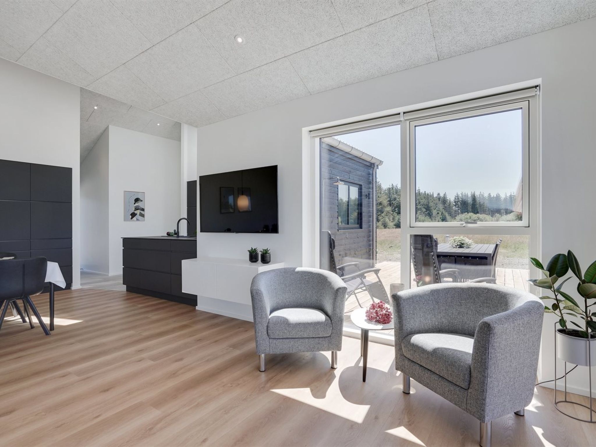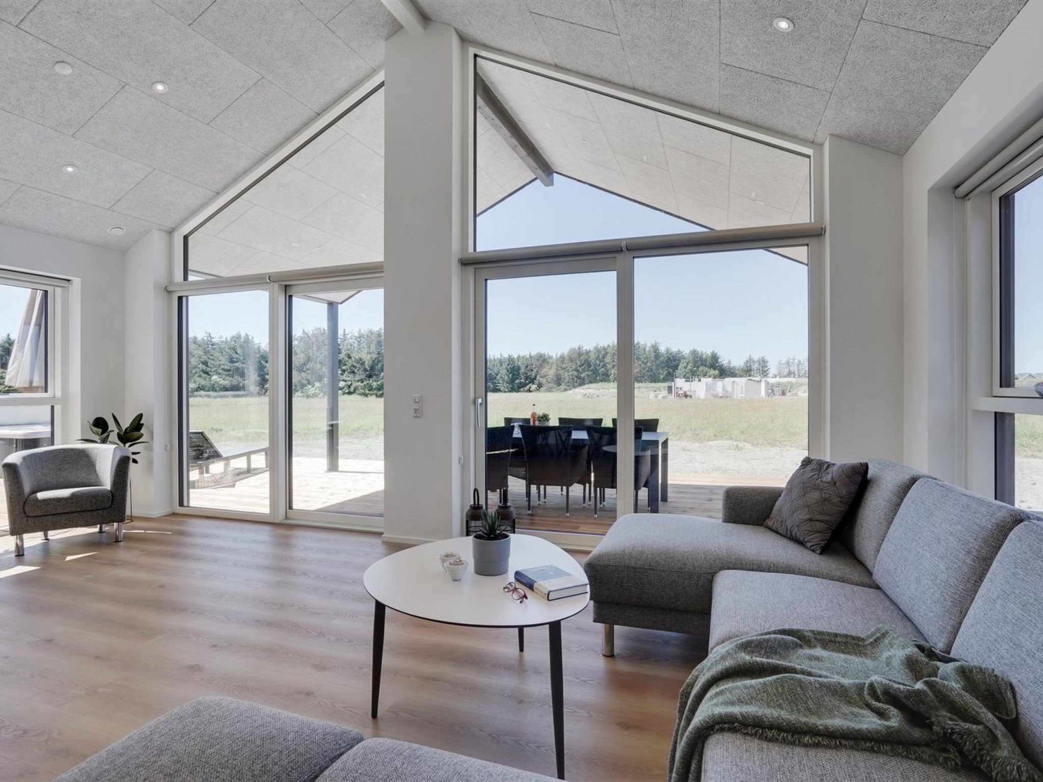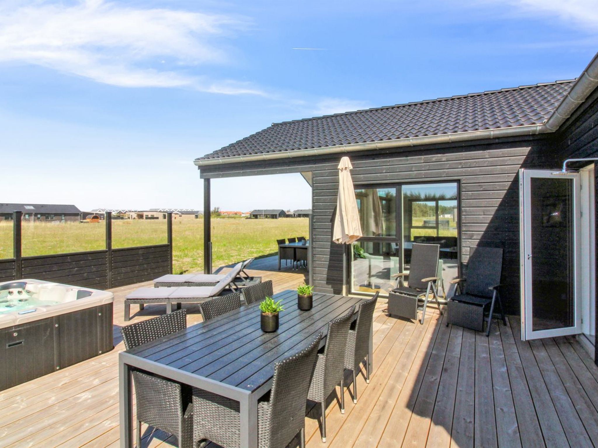 Einfamilienhaus, Baujahr 2022. 950 m vom Meer. Zur Alleinbenutzung: naturbelassenes Grundstück 595 m2. Aussendusche, Grill, Kinderspielplatz (Rutschbahn, Schaukel). Im Hause: Sauna, Waschmaschine, Wäschetrockner. Parkplatz beim Haus. Carport. E-Ladestation. Lebensmittelgeschäft 800 m. Golfplatz 200 m. Der Besitzer akzeptiert keine Jugendgruppen.