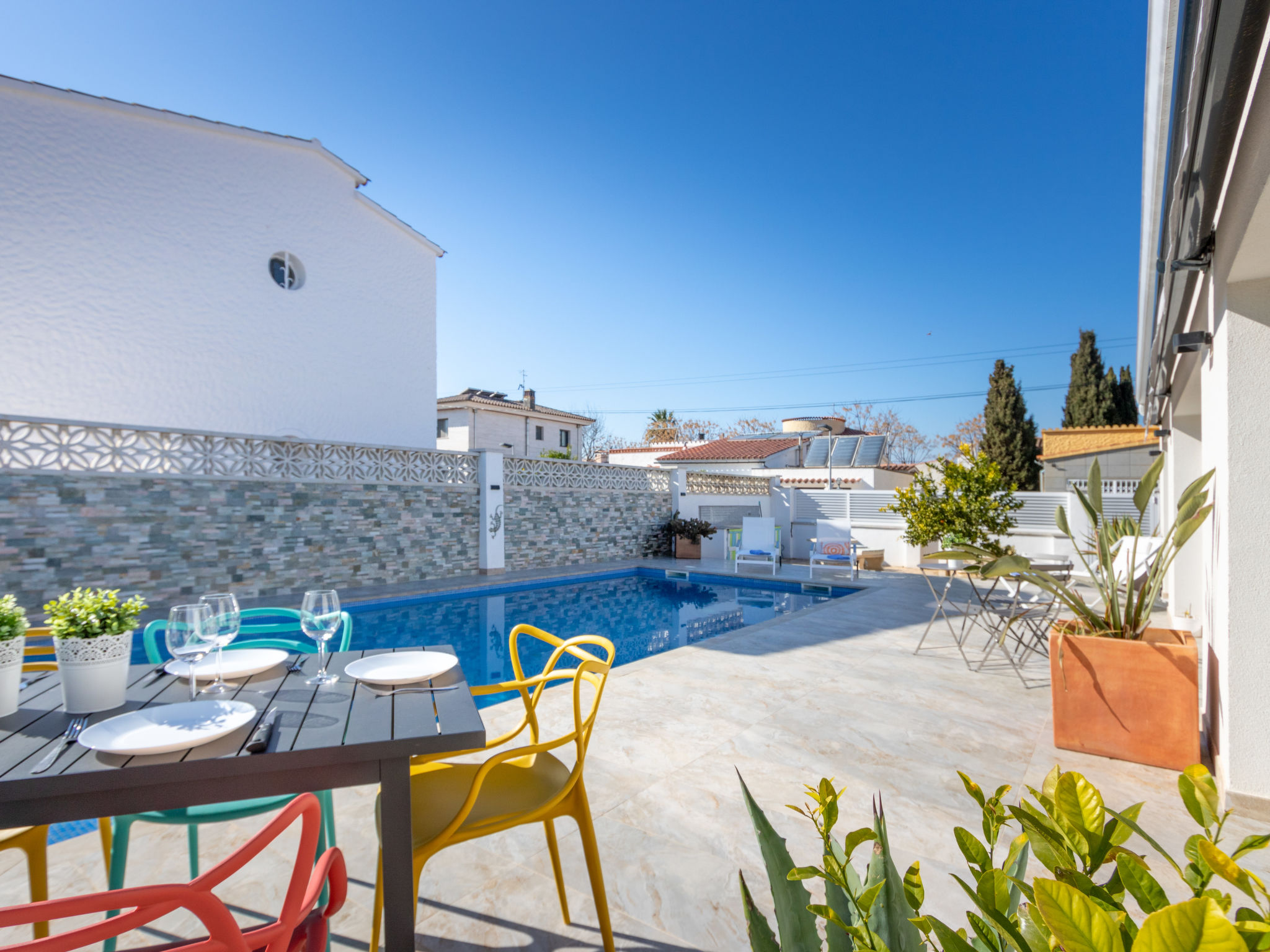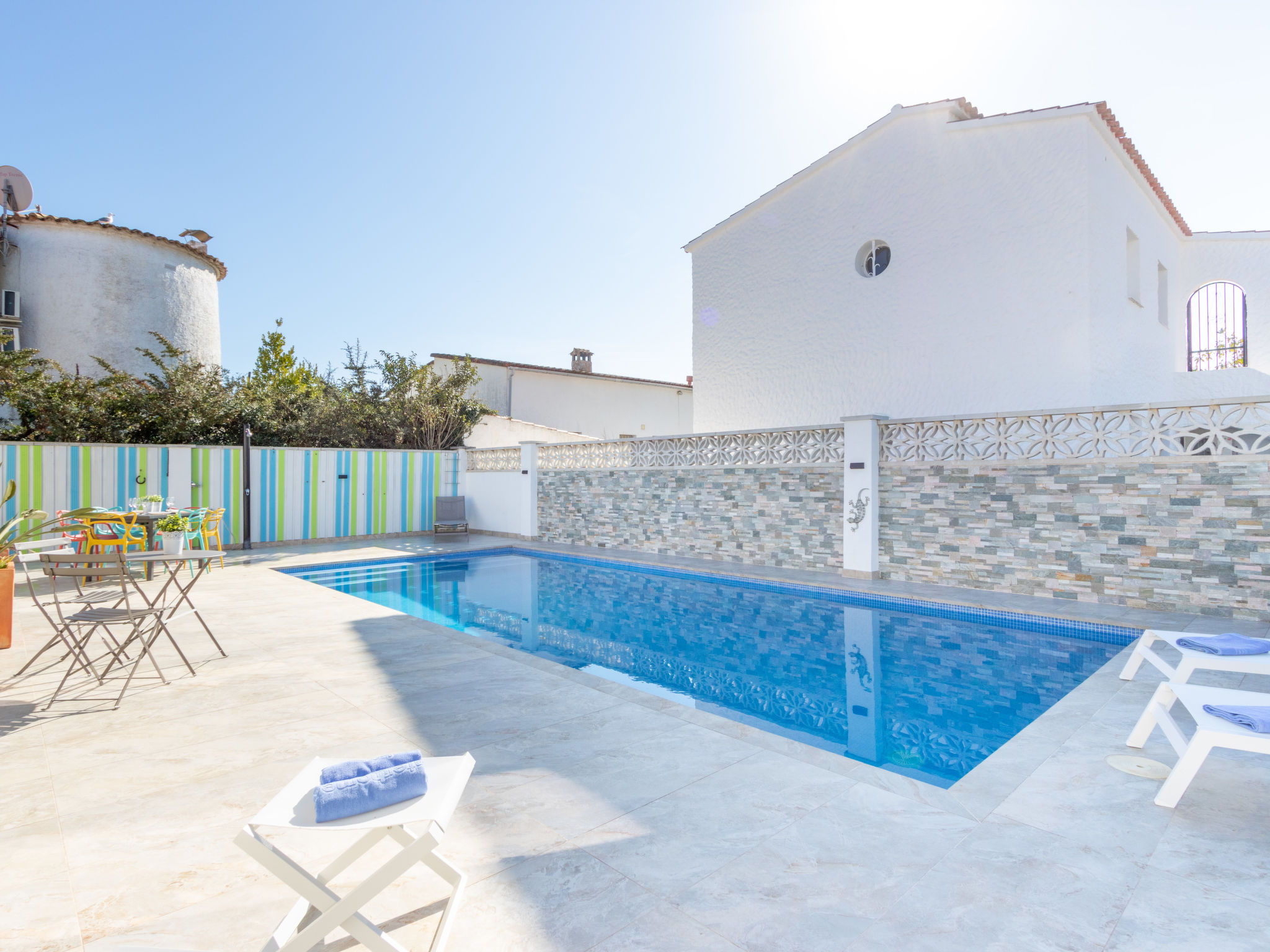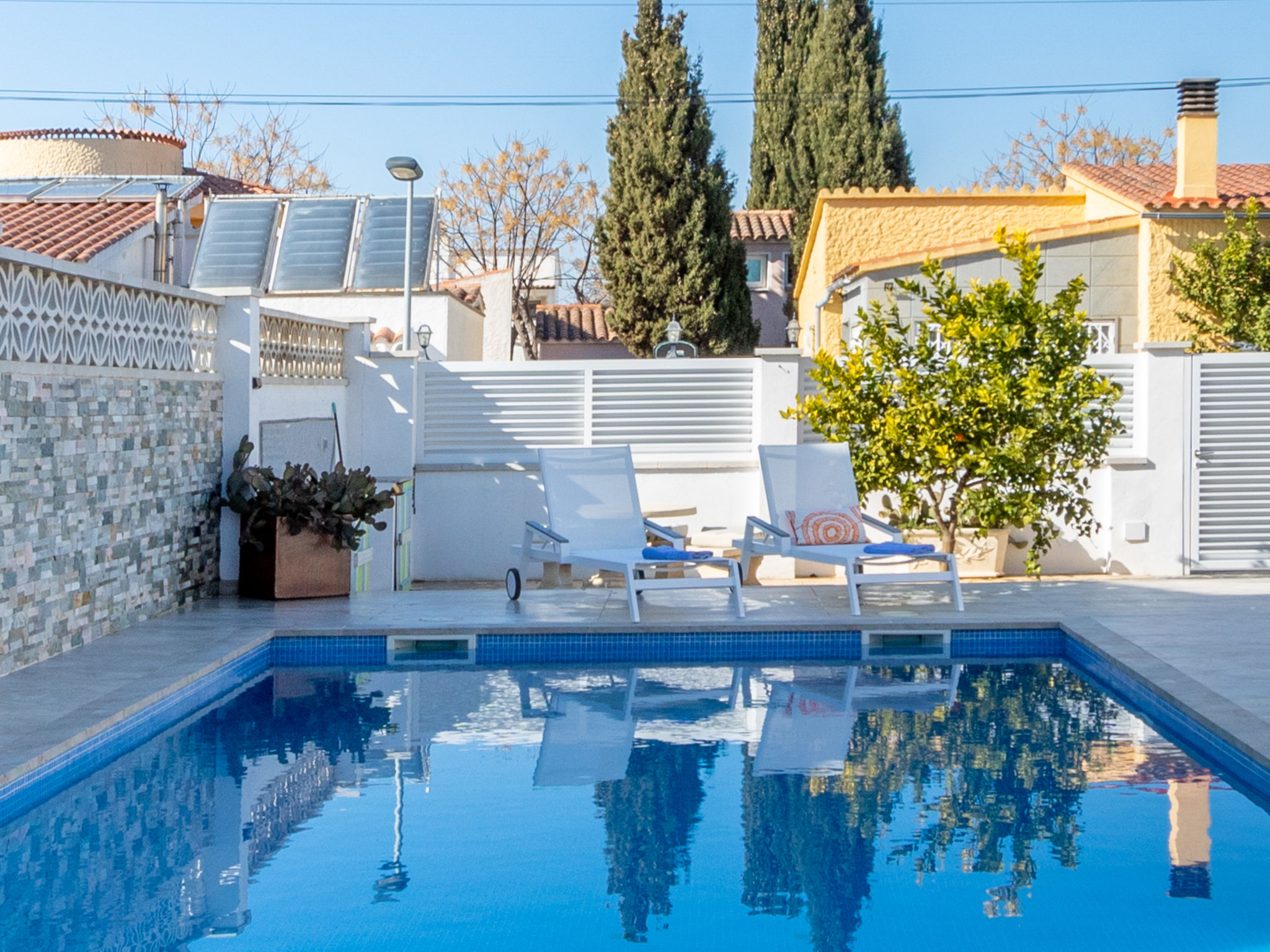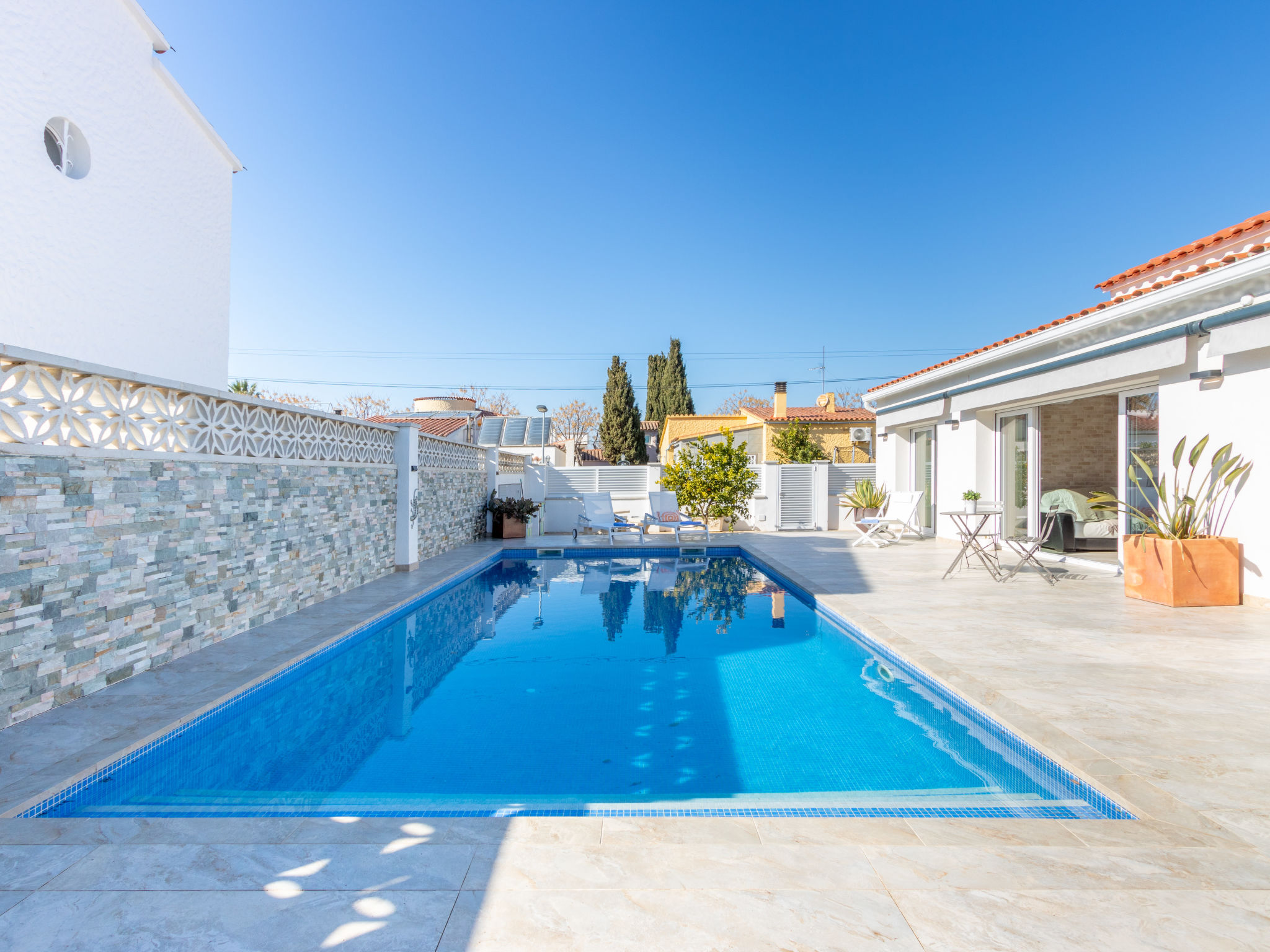 Modernes, gemütliches, komfortables Haus "CASA FILISA", renoviert im Jahre 2021. Im Ortsteil Montgri, 800 m vom Zentrum von Empuriabrava, ruhige, sonnige Lage im Villenviertel, verkehrsberuhigte Zone, 1 km vom Meer, 1 km vom Strand, 220 m vom Fluss, in einer Sackgasse. Zur Alleinbenutzung: Grundstück (eingezäunt), schöner, gepflegter Garten mit Pflanzen, Schwimmbad eckig (4 x 10 m, 100 - 200 cm tief, saisonale Verfügbarkeit: 01.Apr.-30.Okt.) mit Innentreppe. Aussendusche, Pergola, Terrasse, Gartenmöbel. Im Hause: Waschmaschine, Wäschetrockner. Parkplatz auf dem Grundstück. Einkaufsgeschäft, Lebensmittelgeschäft 300 m, Supermarkt 1 km, Einkaufszentrum 800 m, Restaurant, Bar, Bäckerei, Café, Bushaltestelle 300 m, Sandstrand "Empuriabrava" 1.2 km. Sporthafen 3 km, Golfplatz (18 Loch) 5 km, Surfschule 1.5 km, Segelschule 1.5 km, Tennis 2 km, Minigolf 800 m, Wanderwege ab Haus, Radweg 50 m. Nahe gelegene Sehenswürdigkeiten: Túnel del viento y skydive Empuriabrava 2 km, Parque Acuático Roses 6 km, Casino y festival de Peralada 12 km, Museo Dalí Figueres 15 km, Ruïnes de Empuries 21 km, Monasterio de Sant Pere de Rodes 23 km. Wandergebiete: Cadaqués / Cap de Creus 20 km. Der Besitzer akzeptiert keine Gruppen.