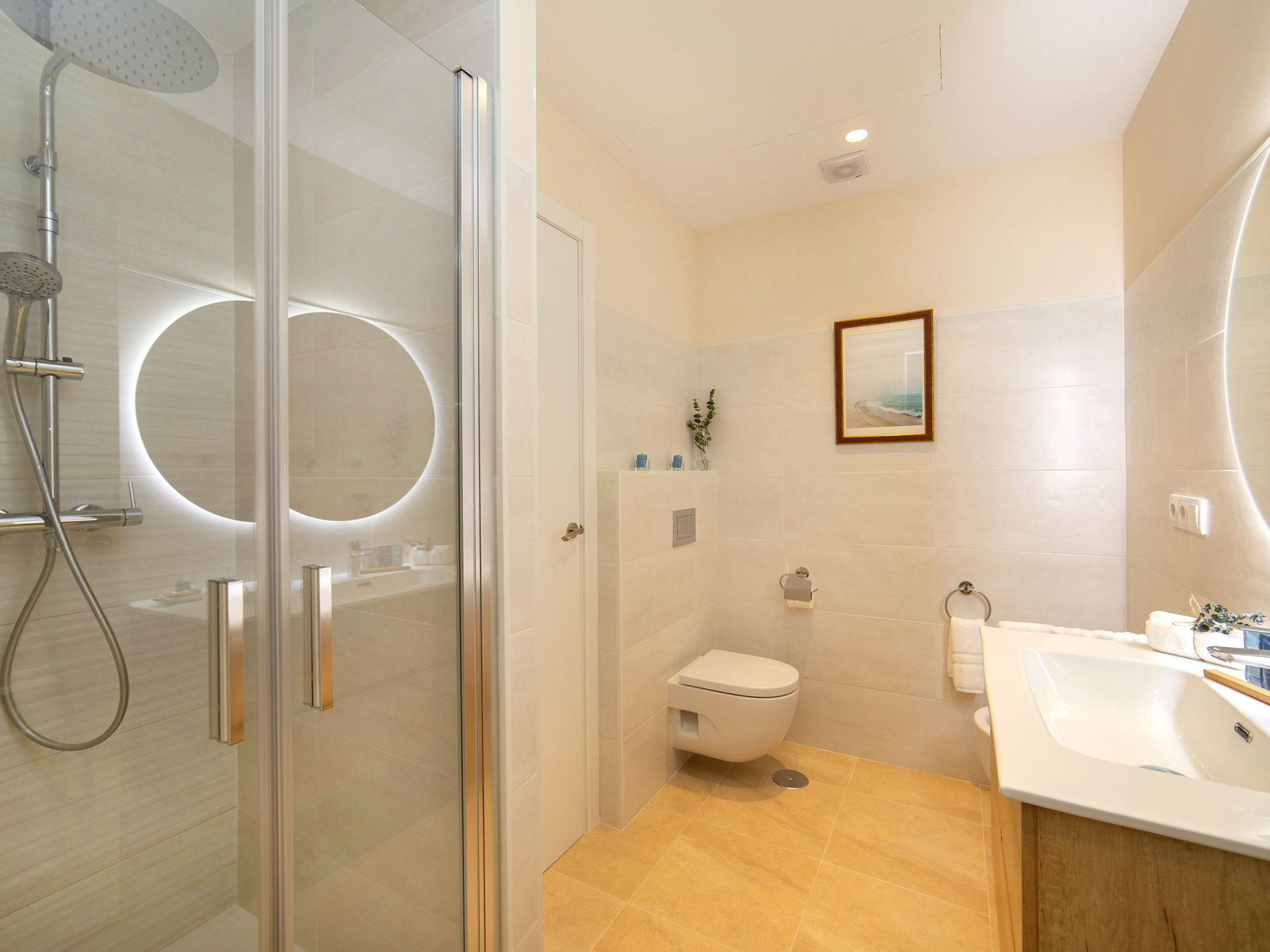 "Frentemar 03", 3-Zimmer-Wohnung 129 m2 im 3. Stock. Hell, renoviert im Jahre 2022, komfortabel und modern eingerichtet: Wohn-/Esszimmer mit 1 Diwanbett, Digital-TV, Klimaanlage und Warmluftheizung. Ausgang zur Terrasse. 1 Zimmer mit 2 Betten (90 cm, Länge 190 cm), Klimaanlage und Warmluftheizung. 1 Zimmer mit 1 franz. Bett (150 cm, Länge 200 cm), Klimaanlage und Warmluftheizung. Küche (Geschirrspüler, 4 Glaskeramikherd Platten, Toaster, Wasserkocher, Mikrowelle, Tiefkühler, Grill, elektrische Kaffeemaschine). Dusche/WC. E-Heizung, Boiler (50 Liter). Heizung nur verfügbar von 01.11. bis 30.04. Terrassenmöbel. Seitliche, auf das Meer. Zur Verfügung: Waschmaschine, Bügeleisen, Kinderhochstuhl, Babybett bis 2 Jahre, Haartrockner. Internet (Wireless LAN, gratis). R0000000001