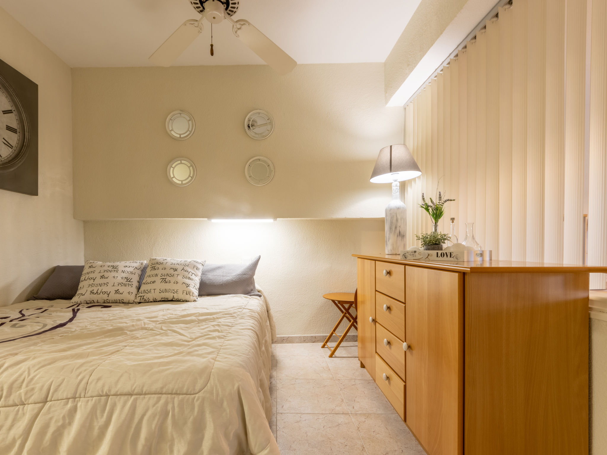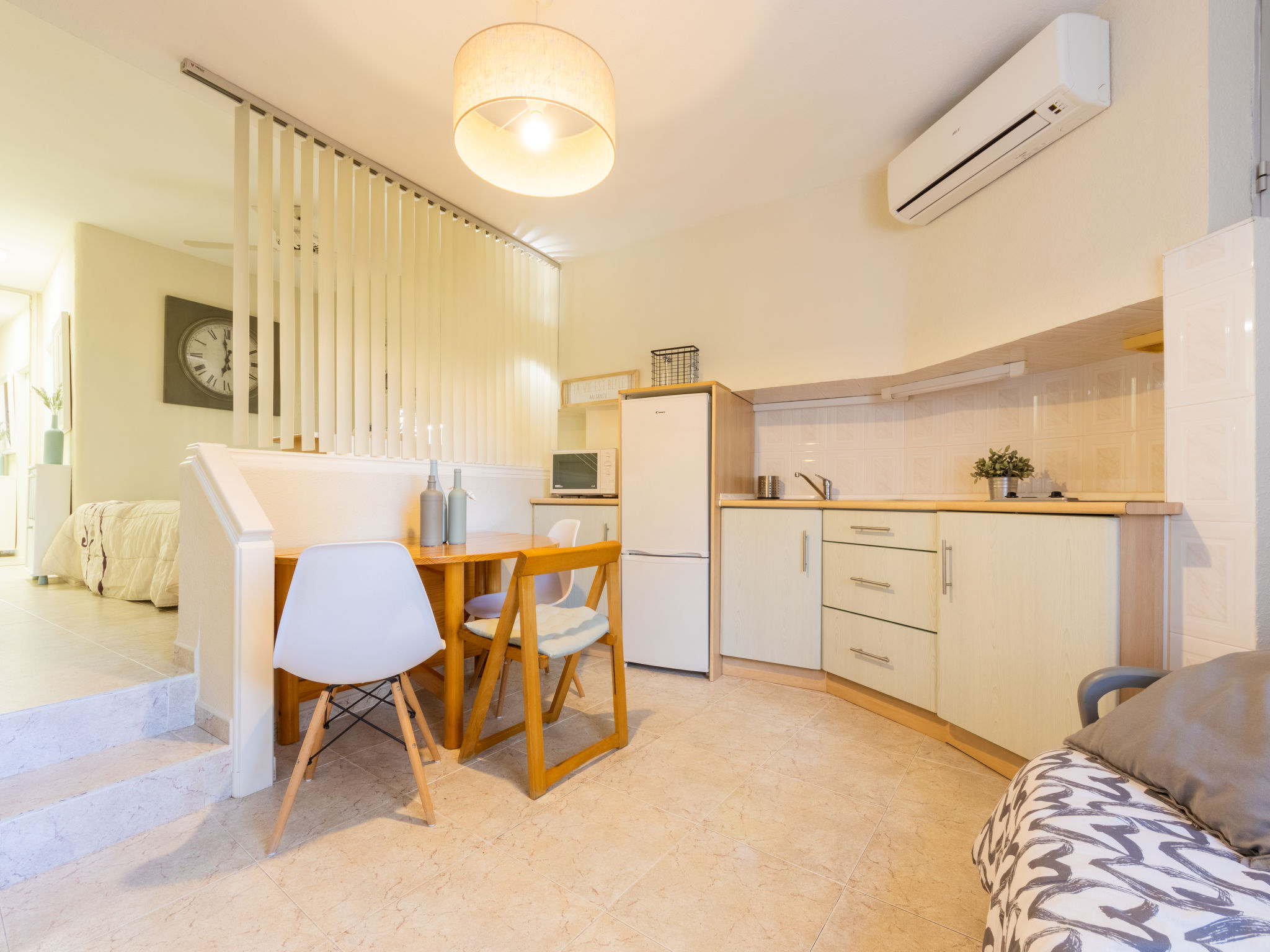 "Promar", 2-Zimmer-Wohnung 30 m2. Objekt geeignet für 3 Erwachsene. Zweckmässig eingerichtet: Wohn-/Esszimmer mit 1 Diwanbett (90 cm, Länge 180 cm), Digital-TV und Klimaanlage. 1 Zimmer mit 2 Betten (90 cm, Länge 180 cm). Wohnküche (Backofen, 3 Glaskeramikherd Platten, Toaster, Wasserkocher, Mikrowelle, elektrische Kaffeemaschine). Dusche/WC. Zur Verfügung: Waschmaschine, Bügeleisen, Kinderhochstuhl, Babybett bis 3 Jahre, Haartrockner. Internet (Wireless LAN). Bitte beachten: geeignet für Familien. Nichtraucher-Unterkunft. 1 Haustier/Hund erlaubt. R000000001