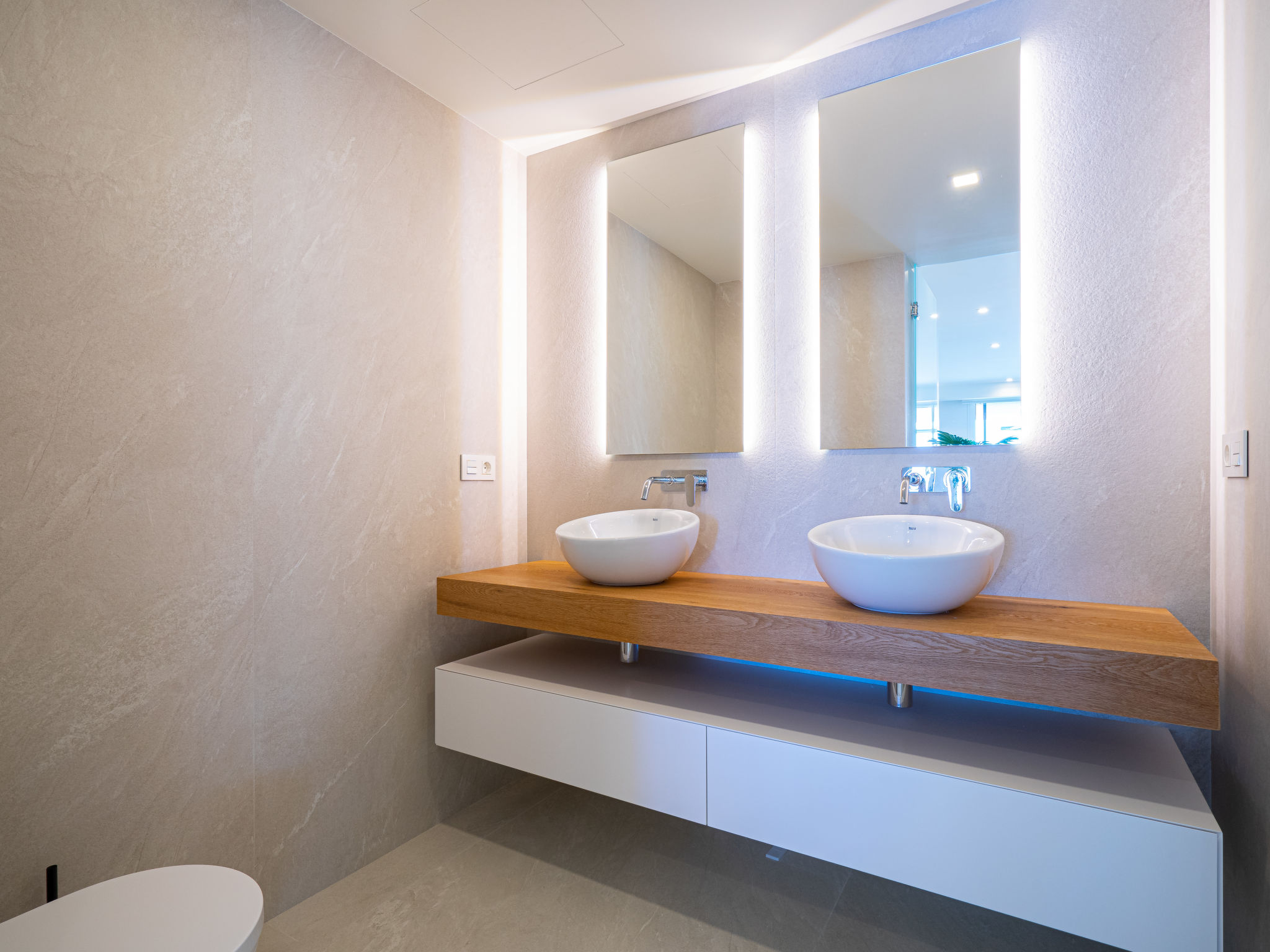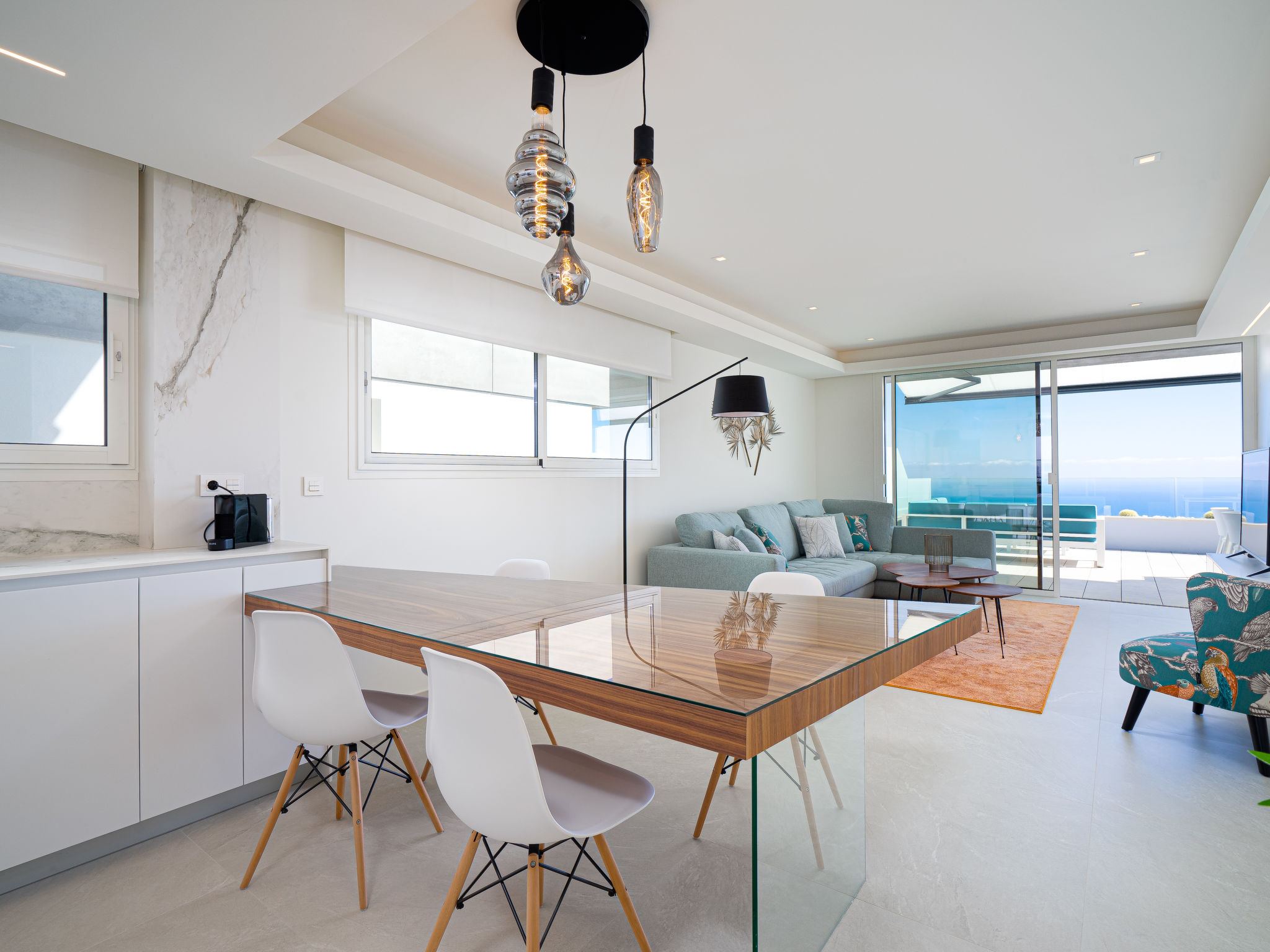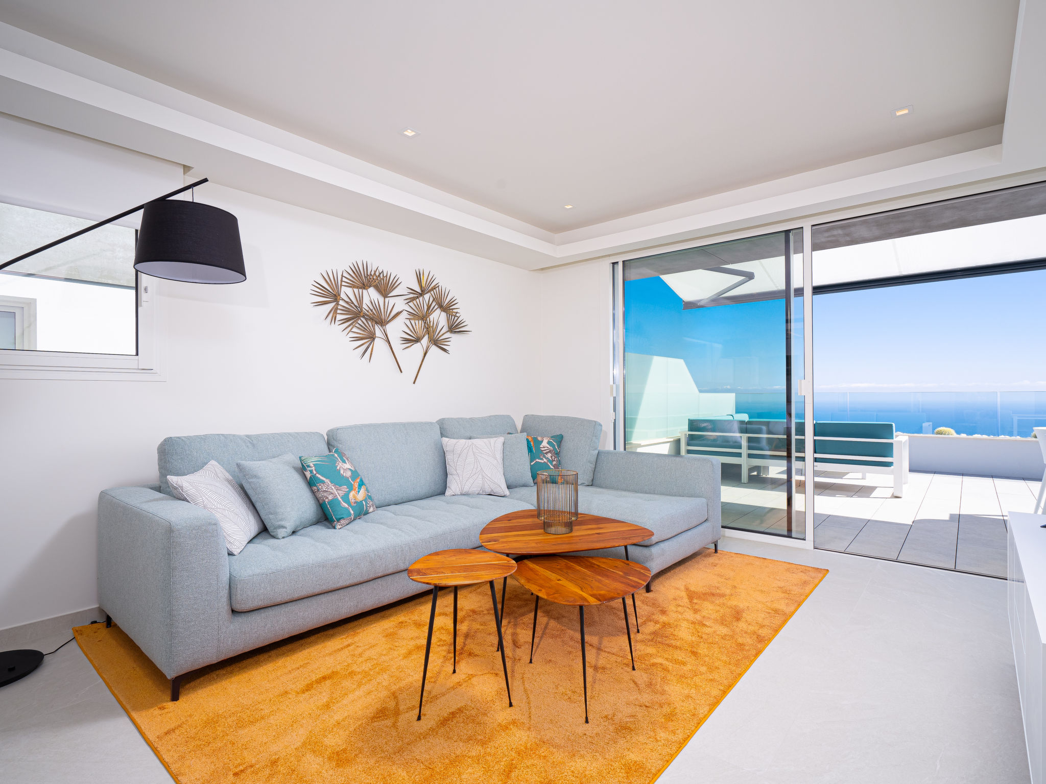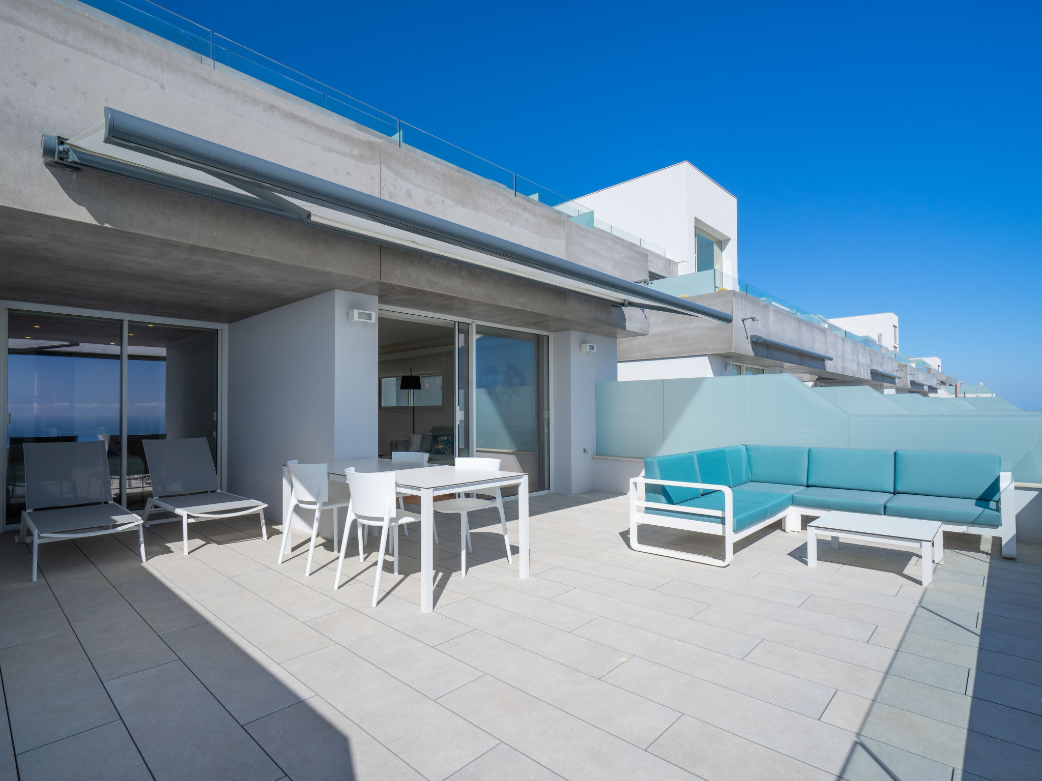 "Blue Infinity", 4-Zimmer-Wohnung 120 m2. Objekt geeignet für 4 Erwachsene + 2 Kinder. Hell, schön und modern eingerichtet: offenes Wohn-/Esszimmer mit Digital-TV, Klimaanlage und Warmluftheizung. Ausgang zur Terrasse. 1 Zimmer mit 1 franz. Bett (1 x 160 cm, Länge 200 cm), Dusche/WC, Doppelwaschbecken, Klimaanlage und Warmluftheizung. Ausgang zur Terrasse. 1 Zimmer mit 1 franz. Bett (1 x 160 cm, Länge 200 cm), Klimaanlage und Warmluftheizung. 1 Zimmer mit 1 Ausziehbett (2 Pers. 2 x 90 cm, Länge 200 cm), Klimaanlage und Warmluftheizung. Offene Küche (Backofen, Geschirrspüler, 3 Induktionskochplatten, Toaster, Wasserkocher, Mikrowelle, elektrische Kaffeemaschine). Dusche/WC. Grosse Terrasse. Terrassenmöbel. Panoramasicht auf das Meer und die Landschaft. Zur Verfügung: Waschmaschine, Bügeleisen, Kinderhochstuhl, Babybett bis 2 Jahre, Haartrockner. Internet (Wireless LAN, gratis). Parkplatz. R000000001