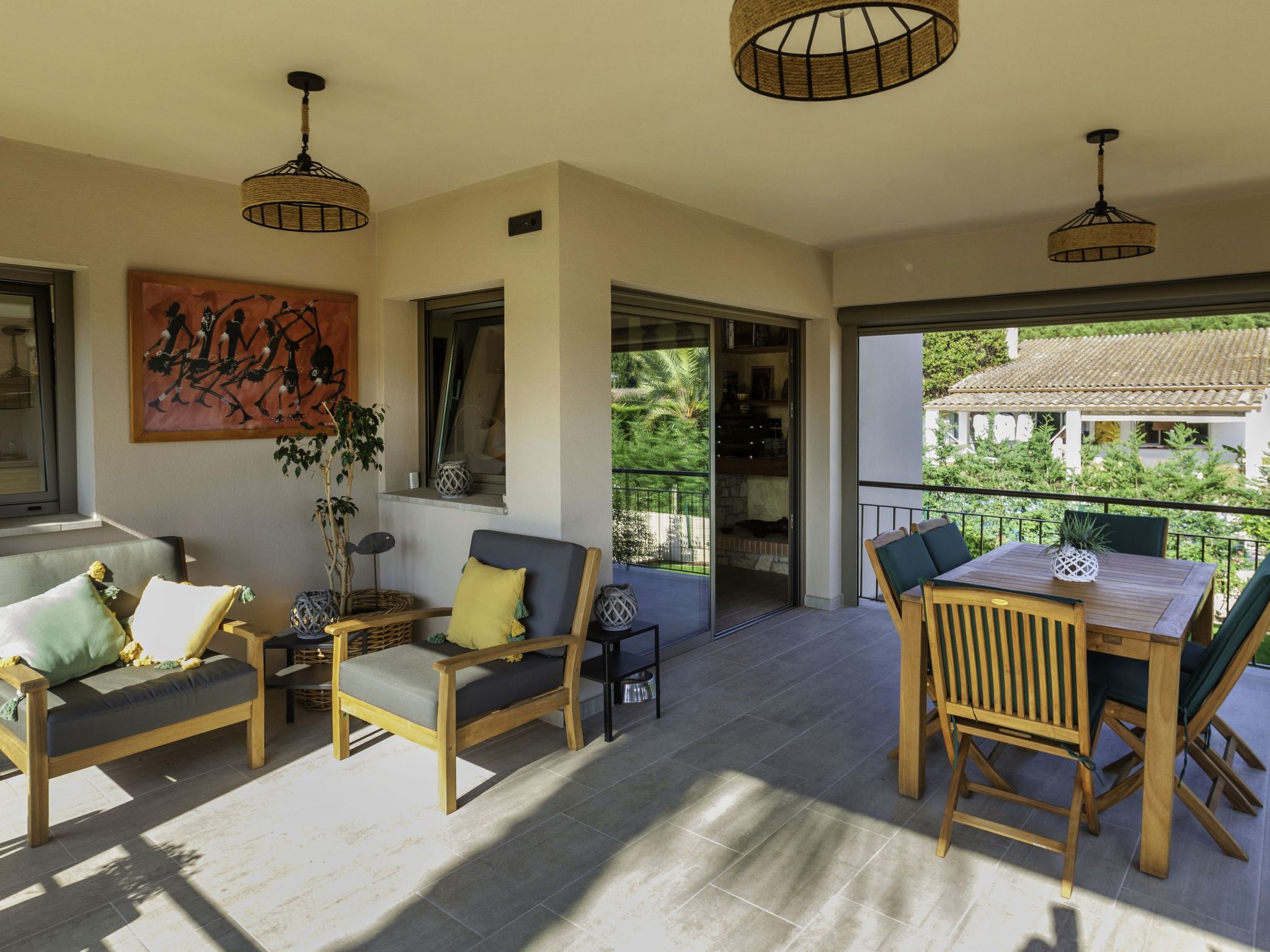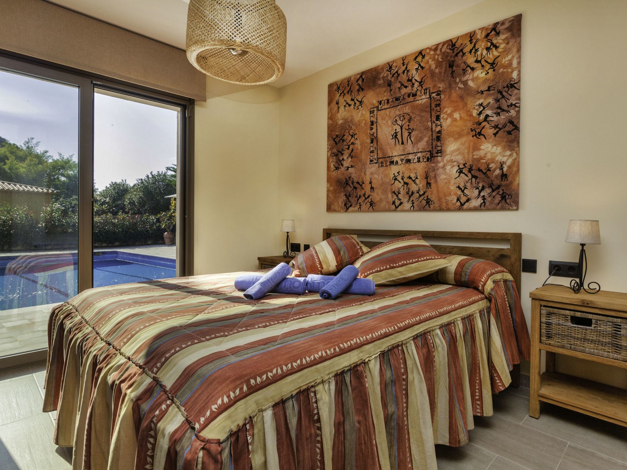 "Emporion", 4-Zimmer-Haus 125 m2. Wohn-/Esszimmer mit Digital-TV und Klimaanlage. Ausgang zum Gartensitzplatz, zum Schwimmbad. 2 Zimmer, jedes Zimmer mit 2 Betten (90 cm, Länge 190 cm), Klimaanlage. 1 Zimmer mit 1 franz. Bett (150 cm, Länge 190 cm), Klimaanlage. Offene Küche (Backofen, Geschirrspüler, 4 Induktionskochplatten, Toaster, Wasserkocher, Mikrowelle, Tiefkühler, Grill, elektrische Kaffeemaschine) mit Esstisch. Ausgang zum Gartensitzplatz. Dusche/WC, sep. WC. Gartensitzplatz. Terrassenmöbel, Gartengrill, Liegestühle, Loggia. Sicht auf die Landschaft. Zur Verfügung: Waschmaschine, Bügeleisen, Kinderhochstuhl, Babybett bis 2 Jahre, Haartrockner. Internet (Wireless LAN, gratis). Bitte beachten: Nichtraucher-Haus. TV nur ES. HUTG048446