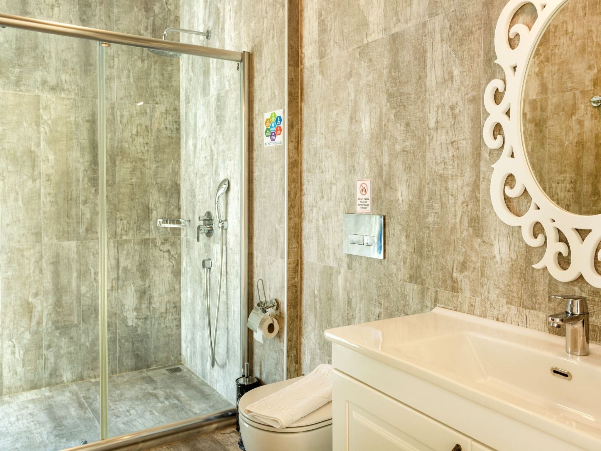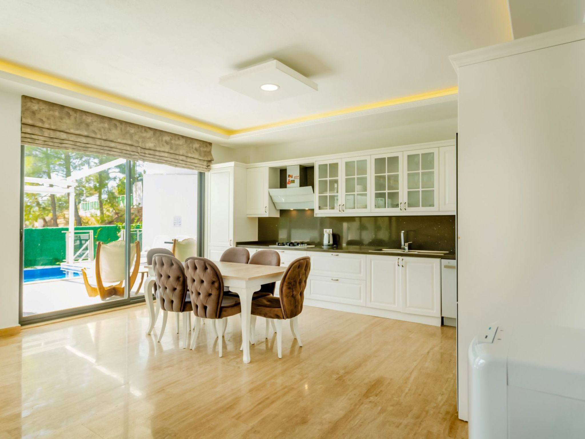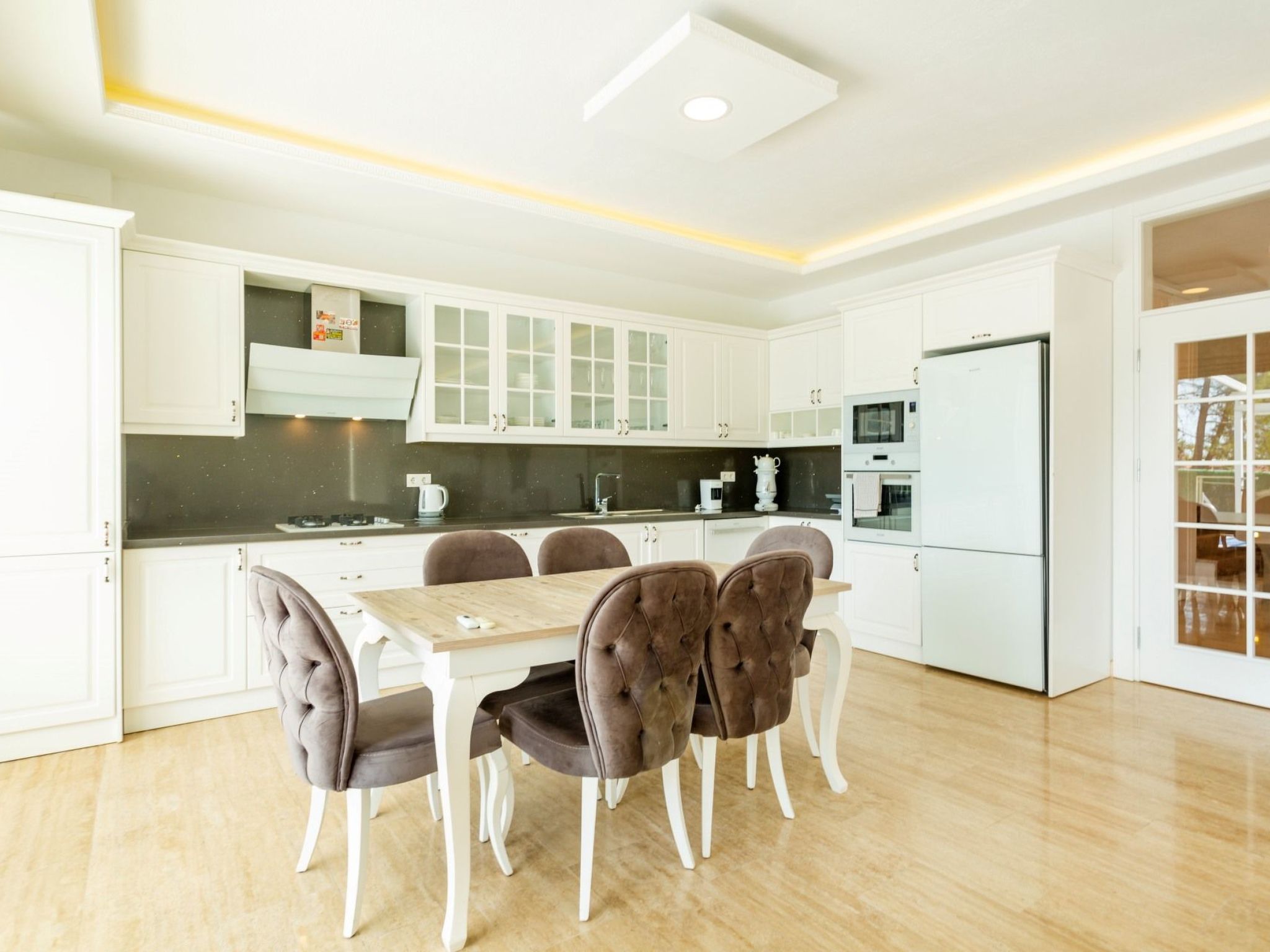 Badetuch, Handtuch und Strandtuch sind in jeder Villa vorhanden. Handtücher werden im Voraus vorbereitet und sind in den Zimmern inbegriffen. Bügeleisen, Bügelbrett, Haartrockner, Teekanne, Grill/Holzkohlebrenner sind in jeder Villa vorhanden. Saal Saal mit Meer- und Naturlandschaft, Sitzgruppe, Esstisch für sechs Personen, Satellitenempfänger, TV (LED) und Klimaanlage sind vorhanden. KücheDie amerikanische Küche ist groß, geräumig und modern gestaltet und verfügt über Kühlschrank, Geschirrspüler, Waschmaschine, Herd, Quartettofen (eingebaut), Mikrowelle, elektrischen Warmwasserbereiter (Wasserkocher), Pfanne, Topf usw., Küchengeräte und Geschirr für sechs Personen sind verfügbar