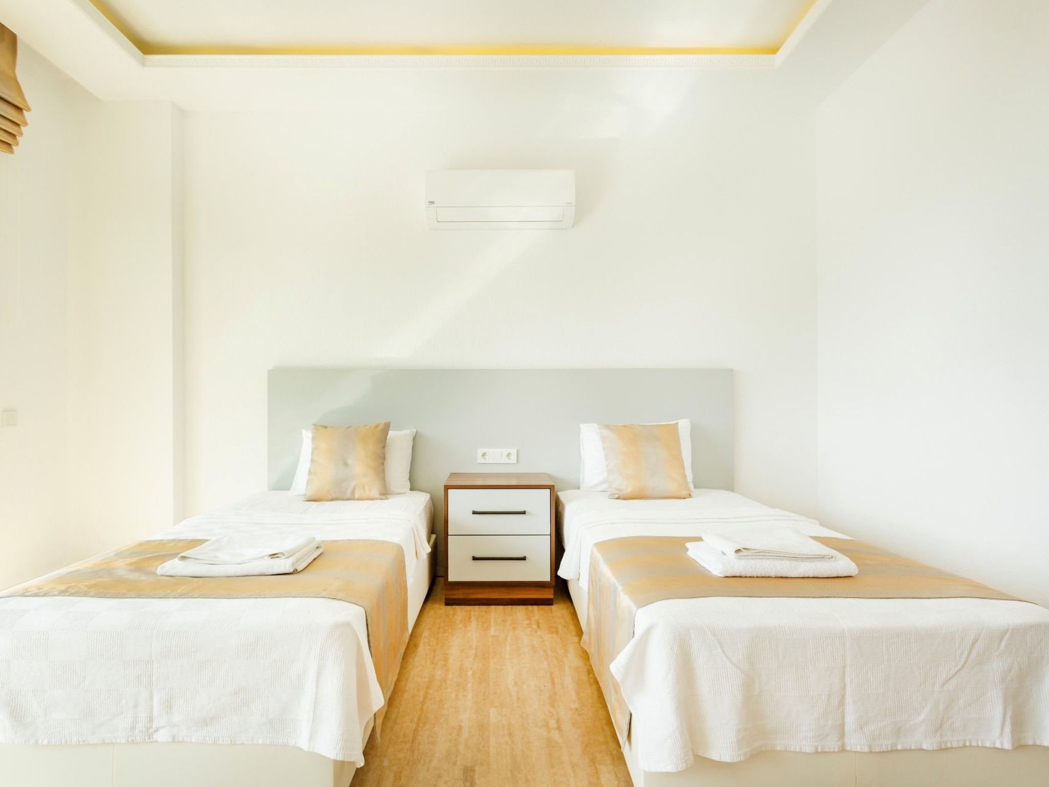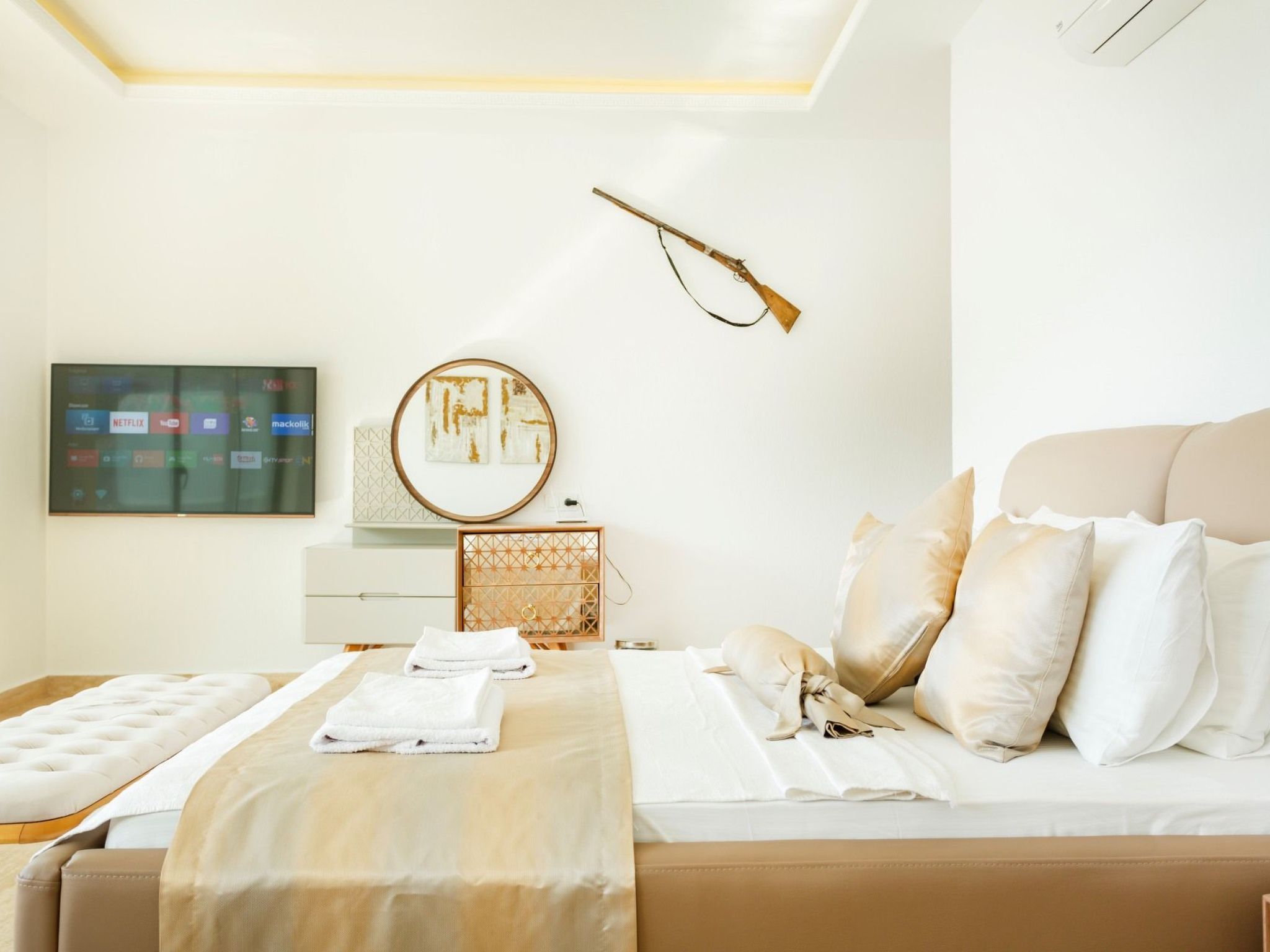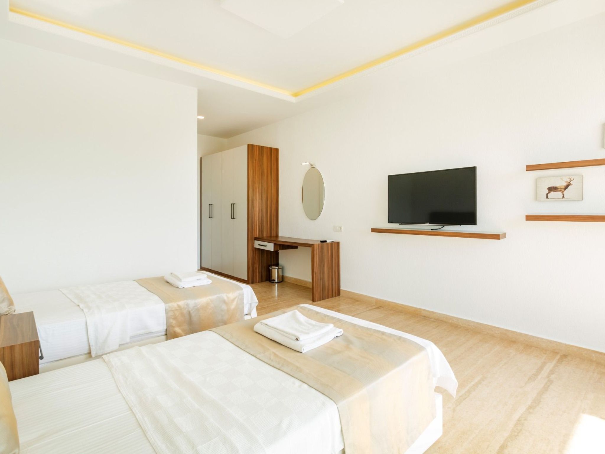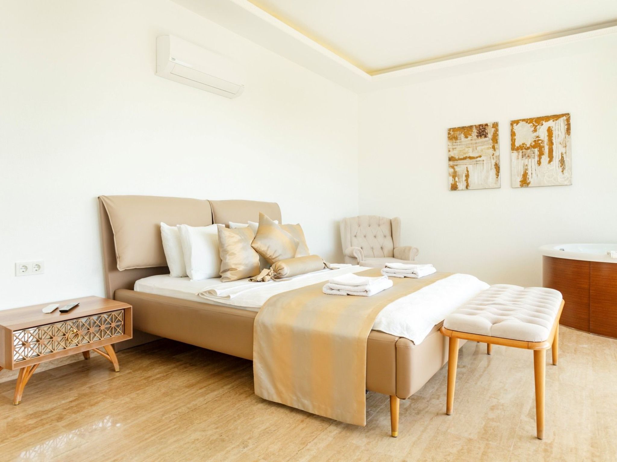 Schlafzimmer1. Schlafzimmer: Doppelbett für einen Familienanzug, Klimaanlage, Kleiderschrank, Balkon, LED-TV, Whirlpool2. Schlafzimmer: Jugendzimmer, zwei Einzelbetten, Klimaanlage, Bad, Kleiderschrank, Balkon, LED-Fernseher, Whirlpool sind vorhanden. Badetuch, Handtuch und Strandtuch sind in jeder Villa vorhanden. Handtücher werden im Voraus vorbereitet und sind in den Zimmern inbegriffen. Bügeleisen, Bügelbrett, Haartrockner, Teekanne, Grill/Holzkohlebrenner sind in jeder Villa vorhanden. Halle Halle mit Meer- und Naturlandschaft, Sitzgruppe, Esstisch für sechs Personen, Satellitenempfänger und Fernseher (LED) und Klimaanlage sind vorhanden. KücheAmerikanische Küche, groß, geräumig und modern, Kühlschrank, Geschirrspüler, Waschmaschine, Herd, Quartettofen (eingebaut), Mikrowelle, elektrischer Warmwasserbereiter (Wasserkocher), Pfanne, Topf usw. Küchengeräte und Geschirr für sechs Personen sind vorhanden. Pool und Garten In jeder Villa gibt es einen großen Bereich zum Sonnenbaden mit privatem Pool und Garten. Es stehen 6 Sonnenliegen und Sonnenschirme, ein Esstisch für sechs Personen, eine Sitzgruppe und ein Grill zur Verfügung. Die Pools sind zusammenklappbar und beheizt. Poolgröße: Breite: 3,5 m/Länge: 10 m/Tiefe: 1,40 m. Reinigung und Pflege. Die Villa wird Ihnen übergeben und zweimal pro Woche gereinigt, wenn Sie eine zusätzliche Reinigung (einschließlich eines neuen Bettes) wünschen Bettlaken, Kissenbezug) werden von unserem Personal gegen Gebühr durchgeführt.